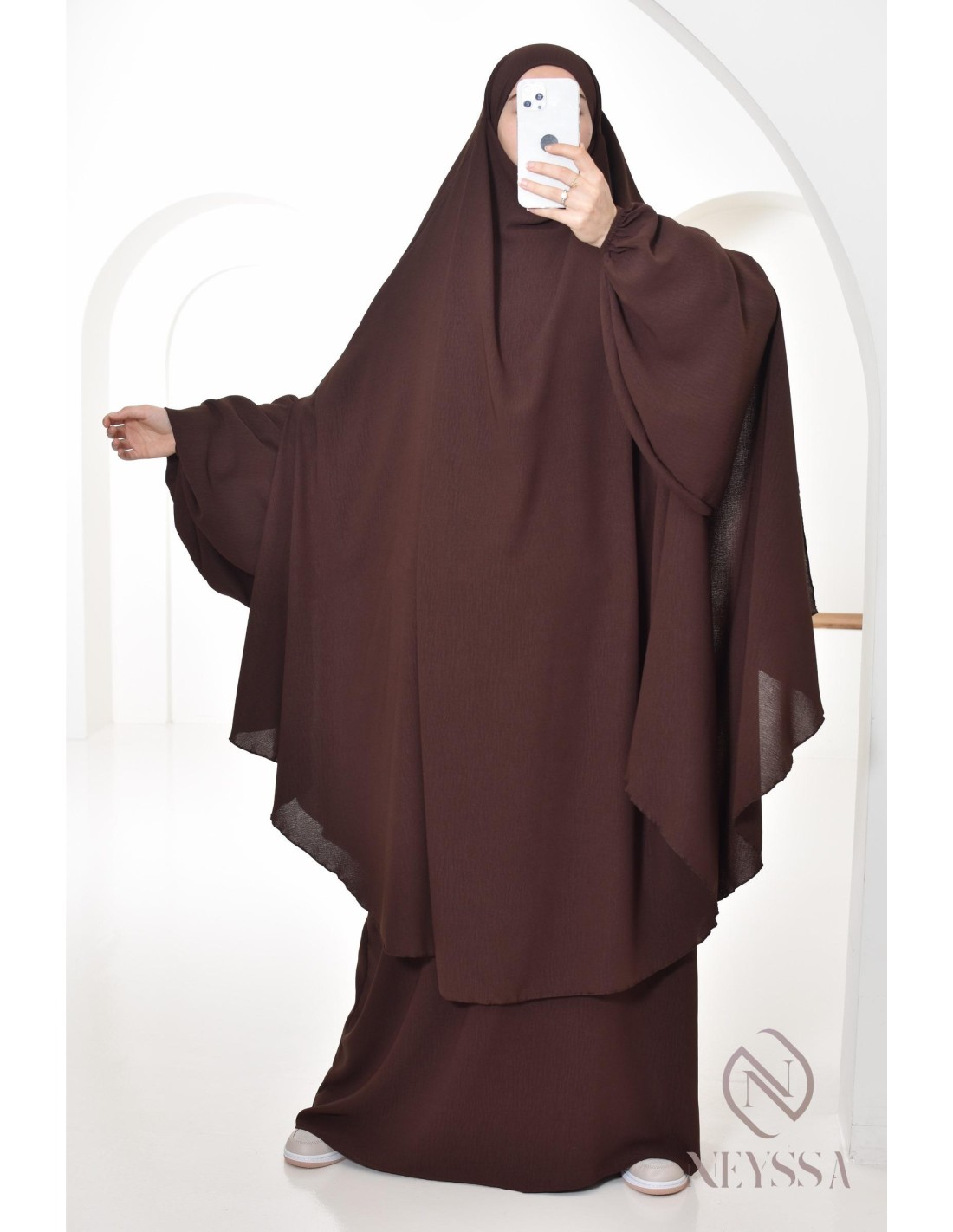 An extra-long chocolate brown abaya + rounded khimar set for women for Umrah: