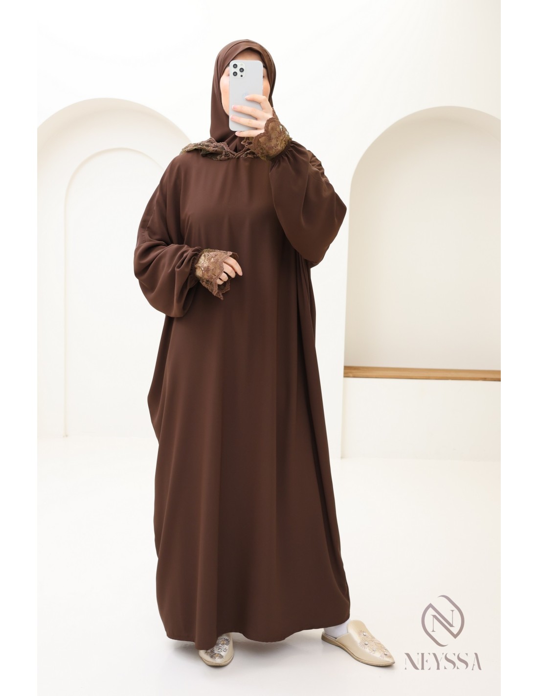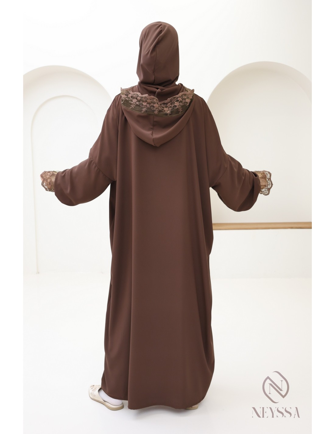 Long chocolate abaya box set with integrated hijab: trendy lace details for veiled women