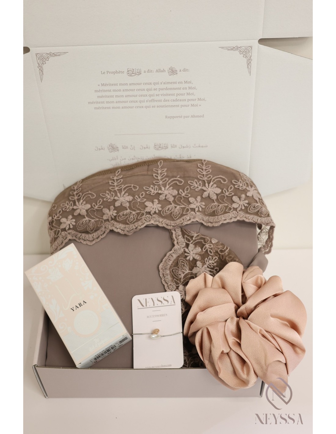 Gift box for women: taupe prayer abaya with Yara perfume for hijabi women