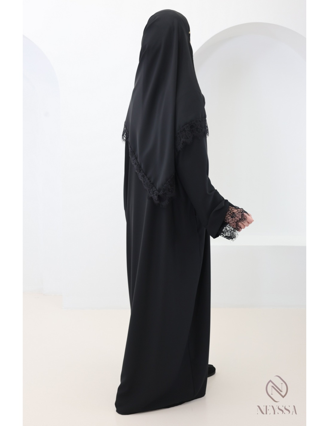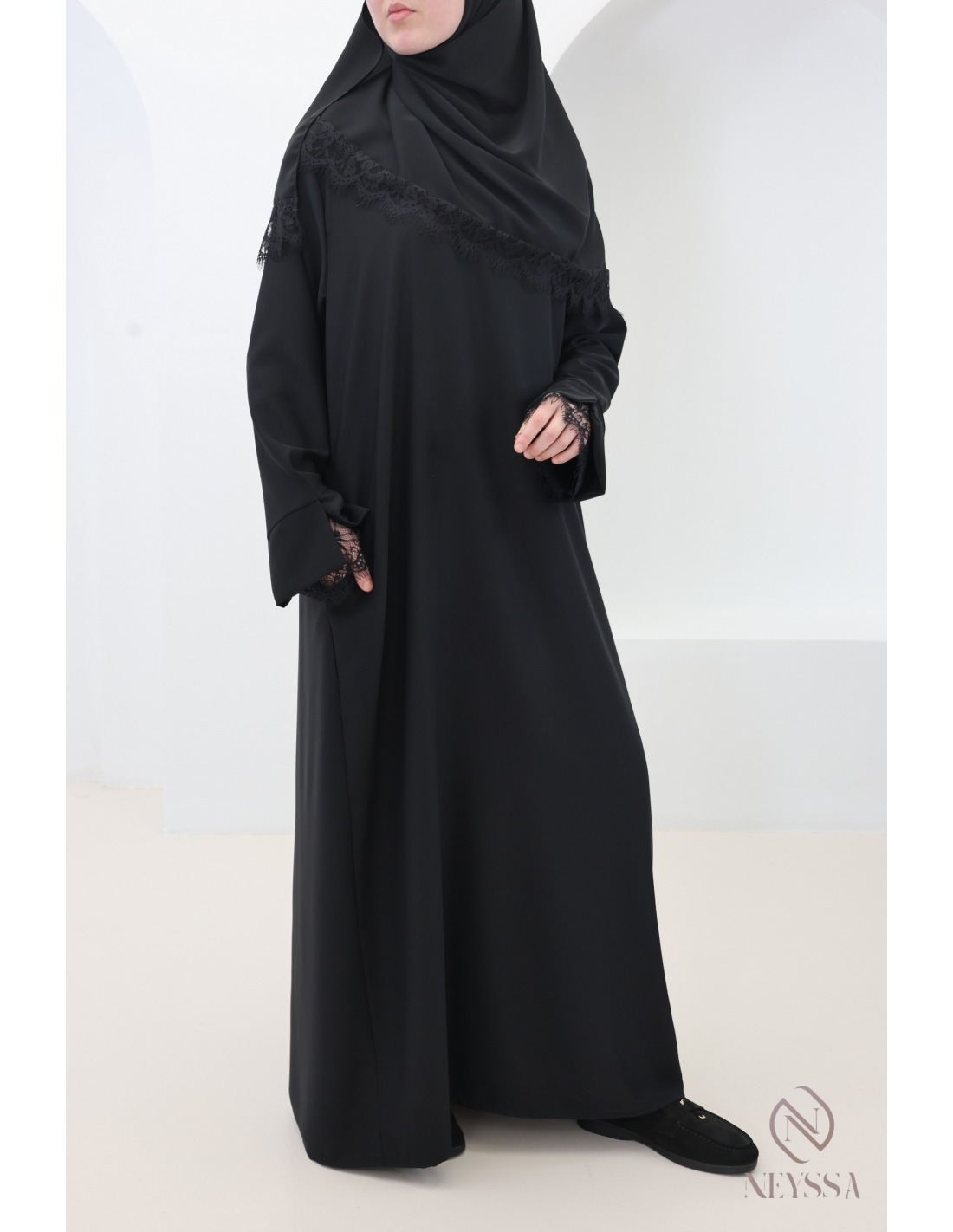 2-piece Abaya + Hijab set in Medina Silk with Lace Trim