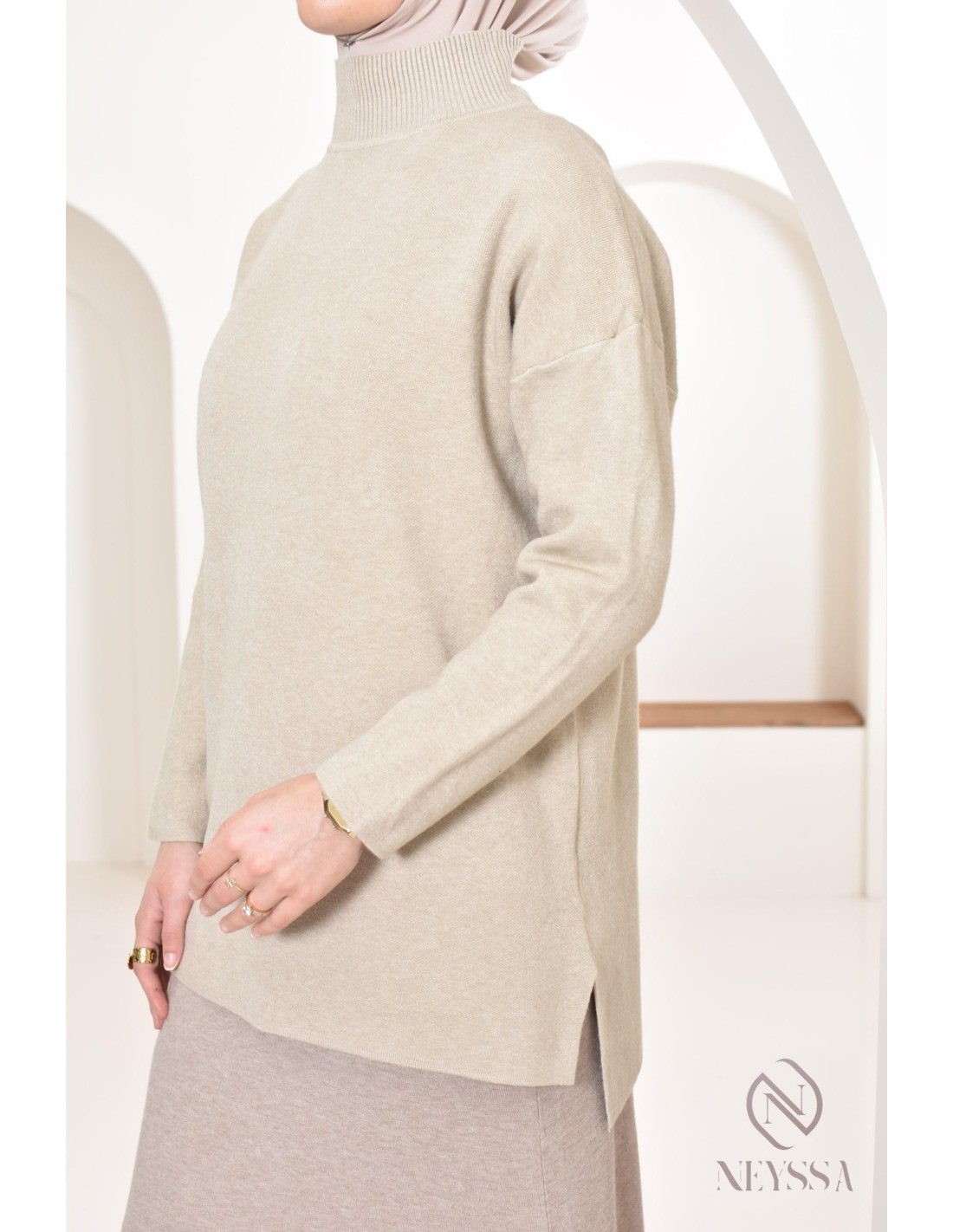 • Elegant style : For a more refined look, pair the sweater with a flowing pleated skirt in neutral tones. Opt for heeled ankle boots and a hijab for a sophisticated touch. A structured bag completes the look.