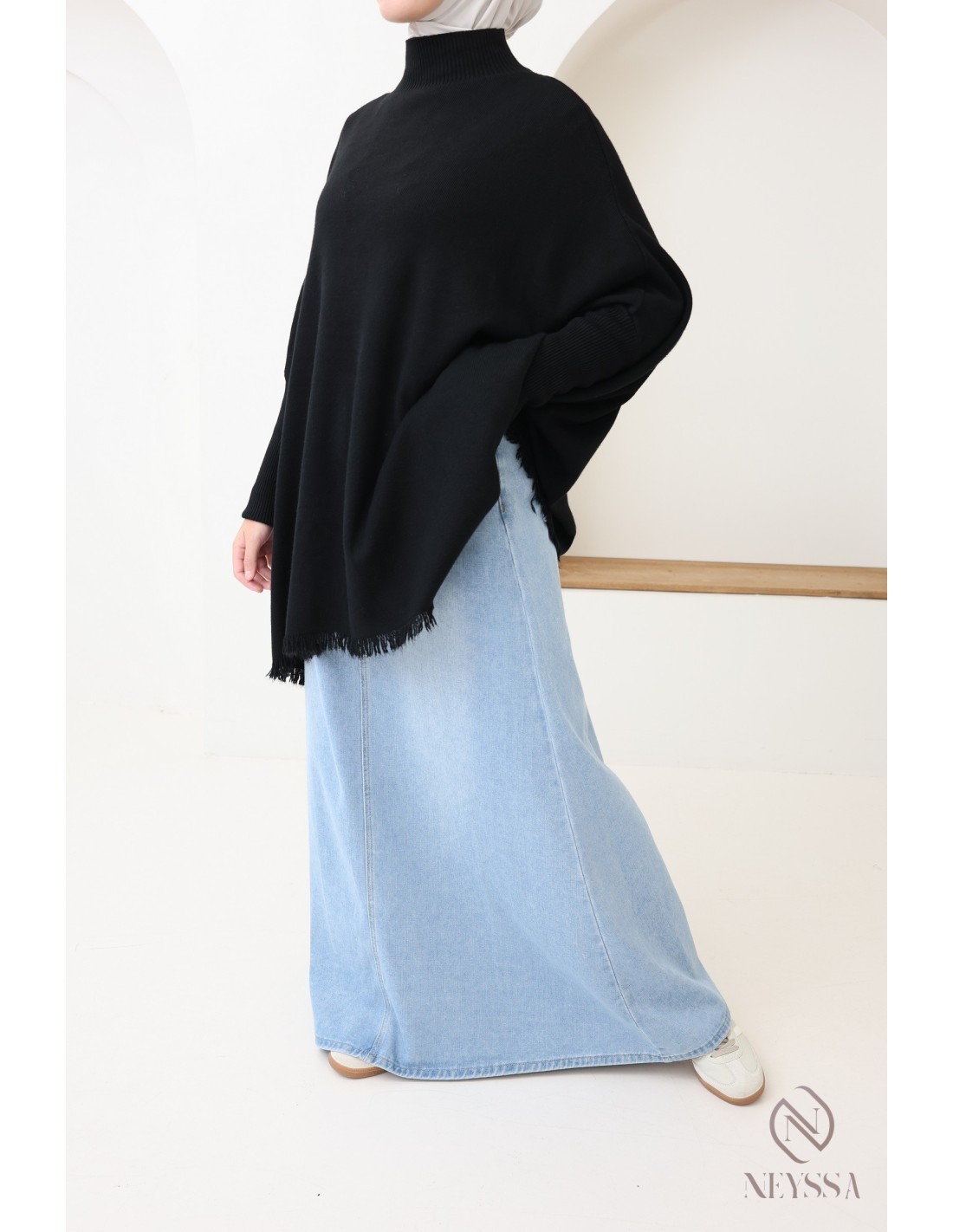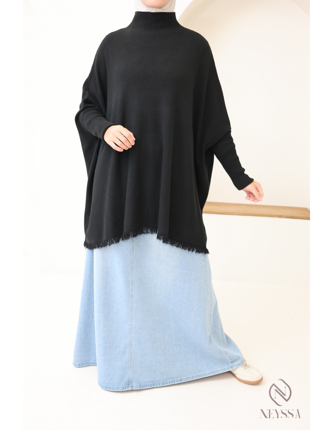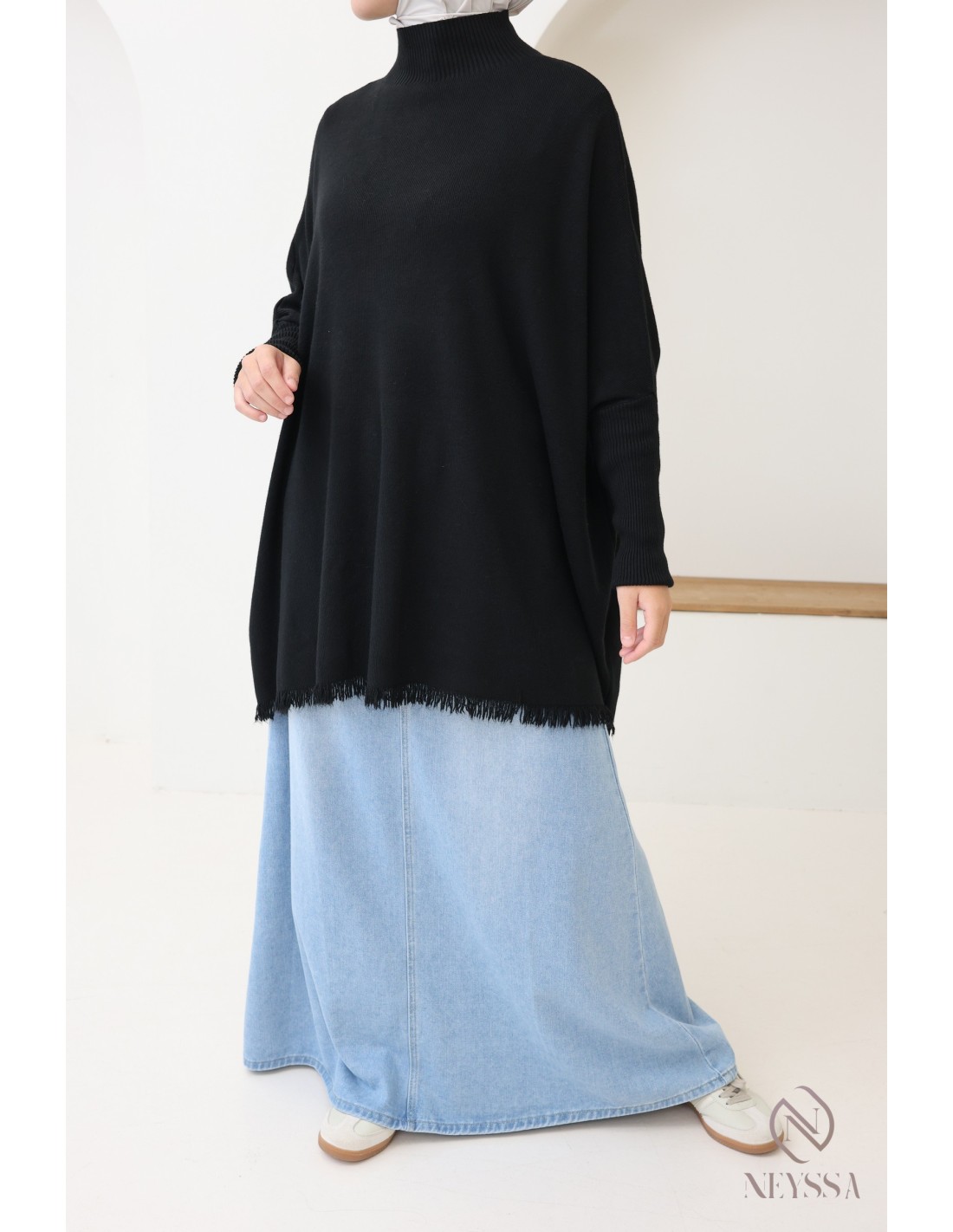 - Fringed details: The fringes at the bottom of the sweater add an original, bohemian touch, bringing movement and an elegant finish to the outfit.