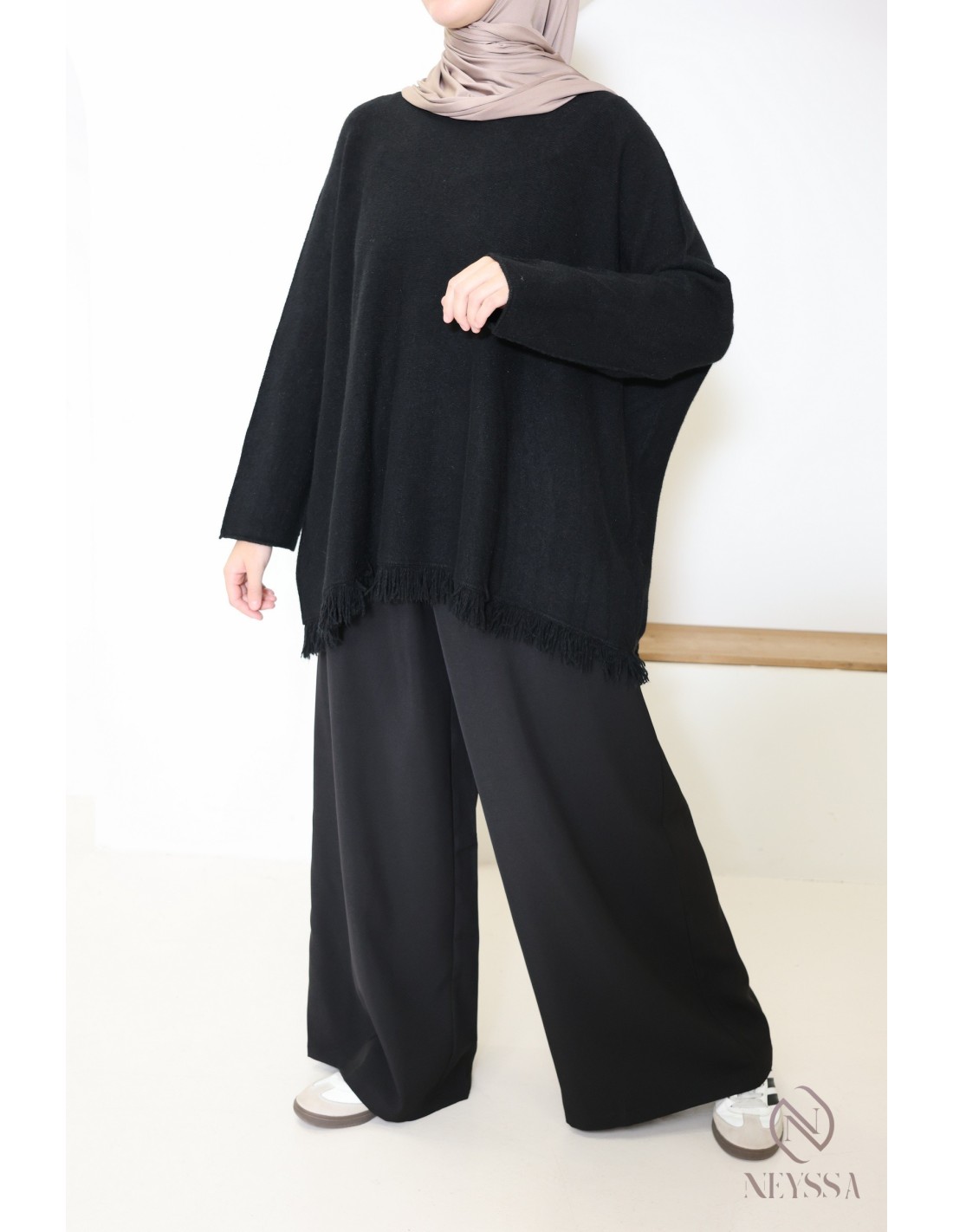 • Fringed Details: The fringes at the bottom of the sweater add a unique, bohemian touch, adding movement and an elegant finish to the outfit.