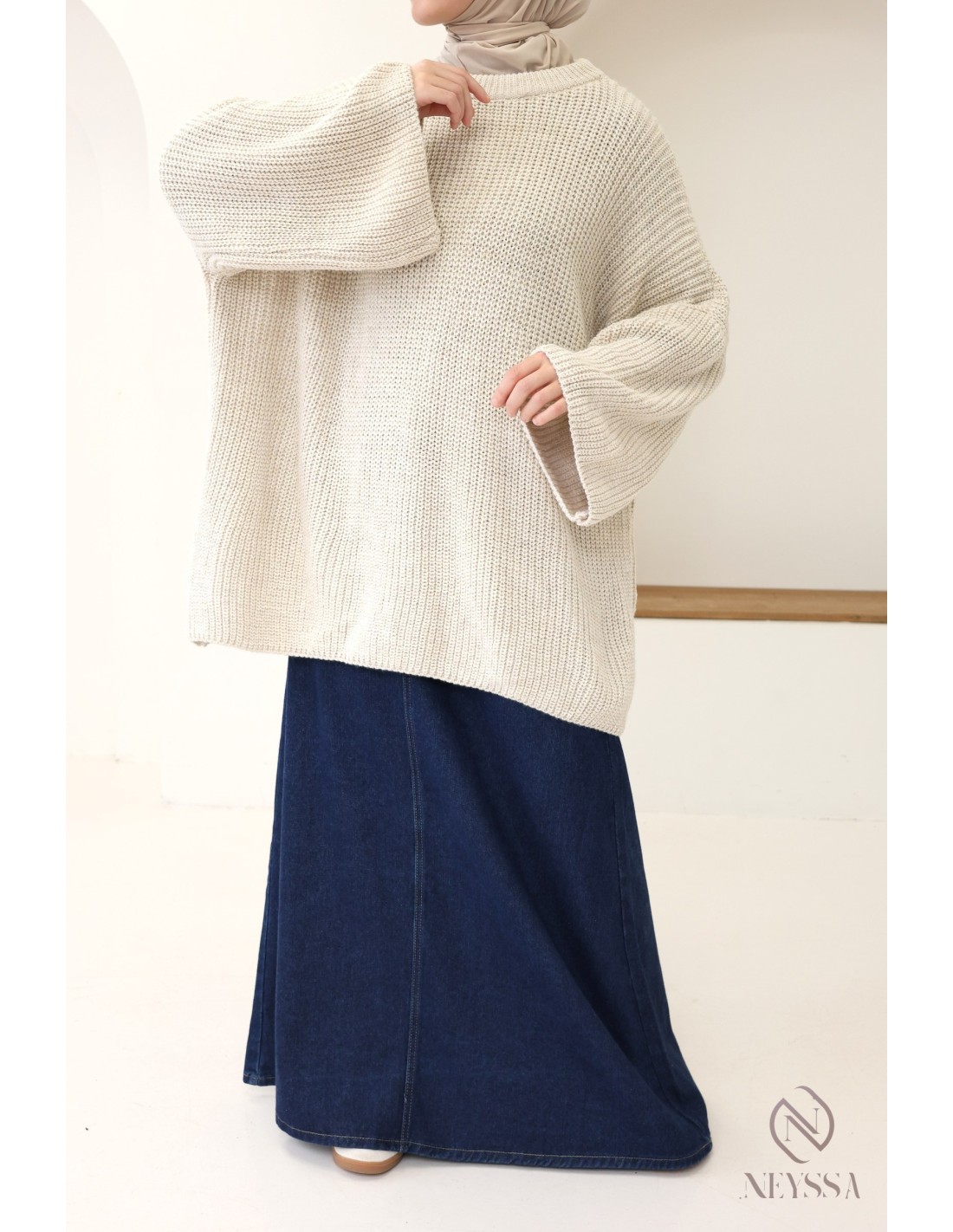 • Elegant style : For a more refined look, pair the sweater with a flowing pleated skirt in neutral tones. Opt for heeled ankle boots and a hijab for a sophisticated touch. A structured bag completes the look.