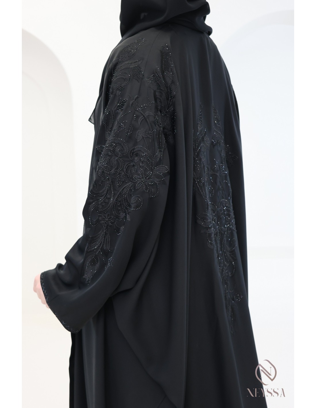 Cette abaya est confectionnée dans un soie de Nidah ornée de broderies et de strass avec son voile assorti.