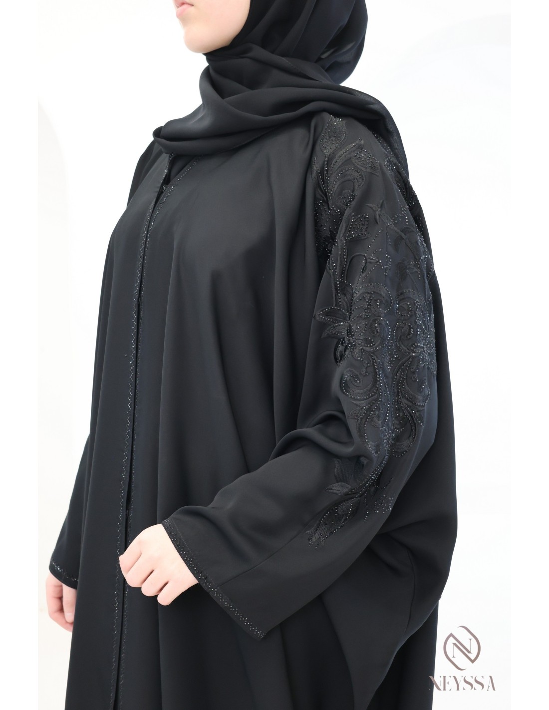 Abaya Dubaï kimono coupe papillon noir avec strass et broderie