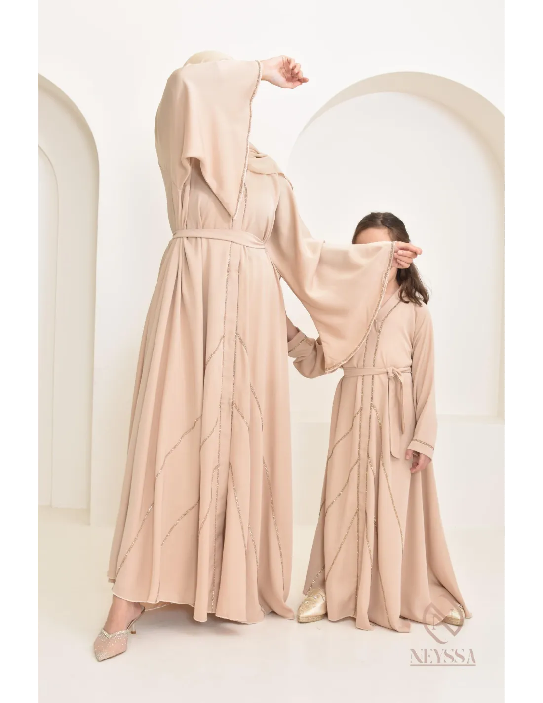 Avoir un look mère / fille le jour de l'Aïd, c'est tout à fait possible ! Retrouvez également cette abaya pour femme. Vous serez donc complètement assorties, et vous ferez le plus beau duo de la journée ! De quoi rendre heureuse votre fille qui sera habillée comme sa maman.