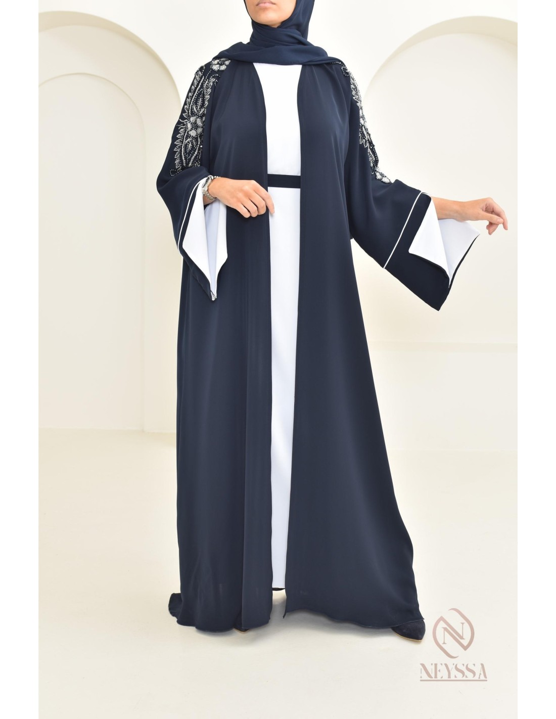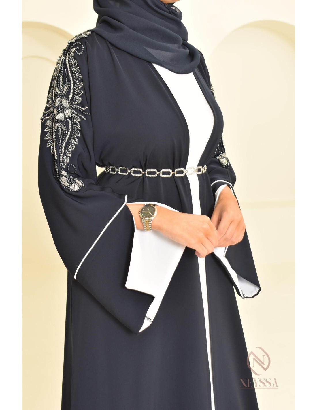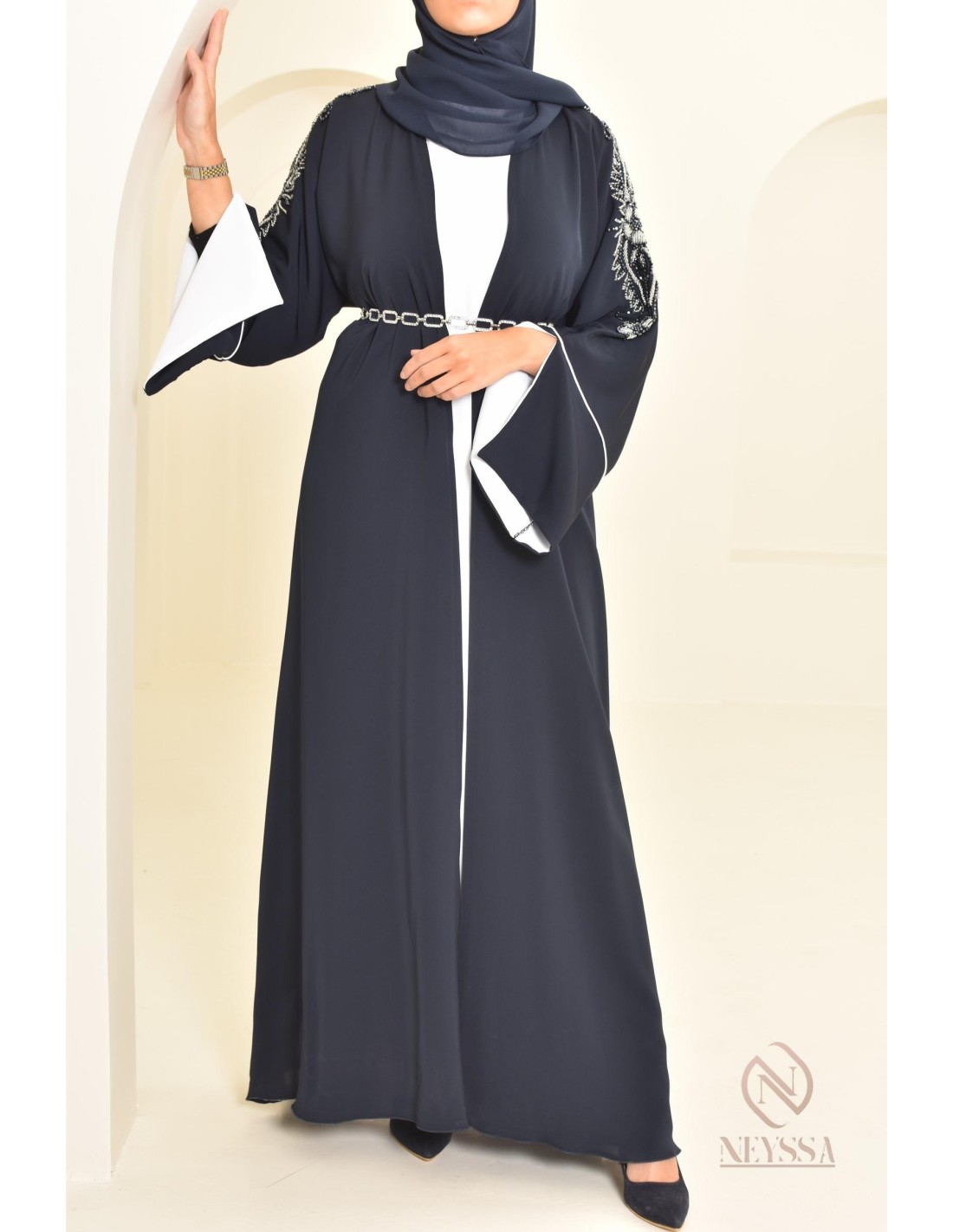 Vous êtes à la recherche d'une abaya chic qui sort de l'ordinaire ? Neyssa a sélectionné spécialement pour vous une robe exceptionnelle avec des perles cousues à la main.