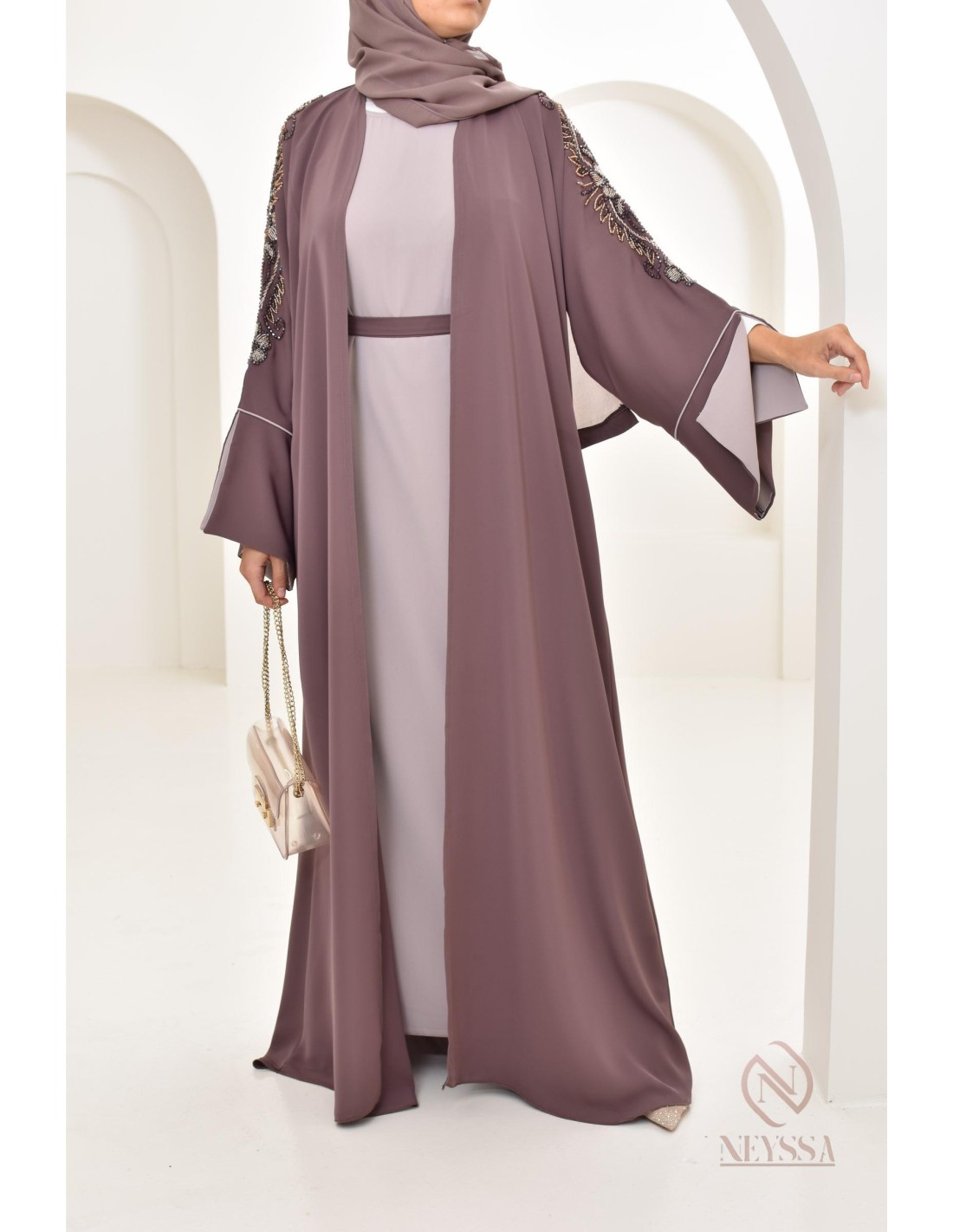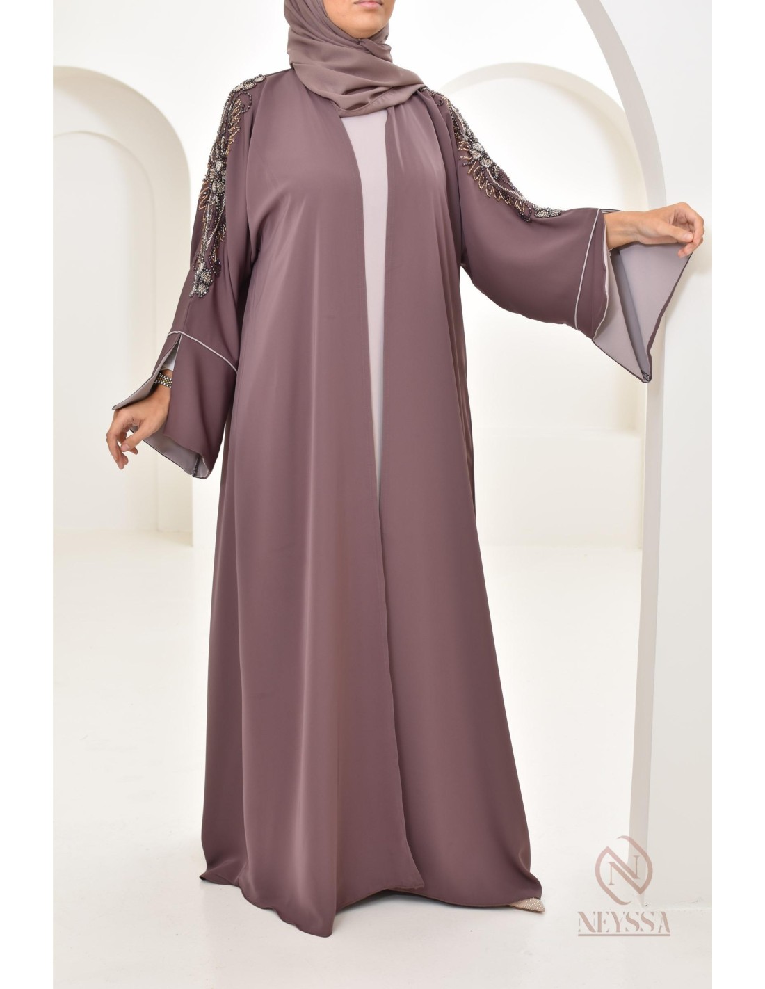 Abaya Dubaï luxe femme marron glacé, avec perles brodées, Aïd 2024
