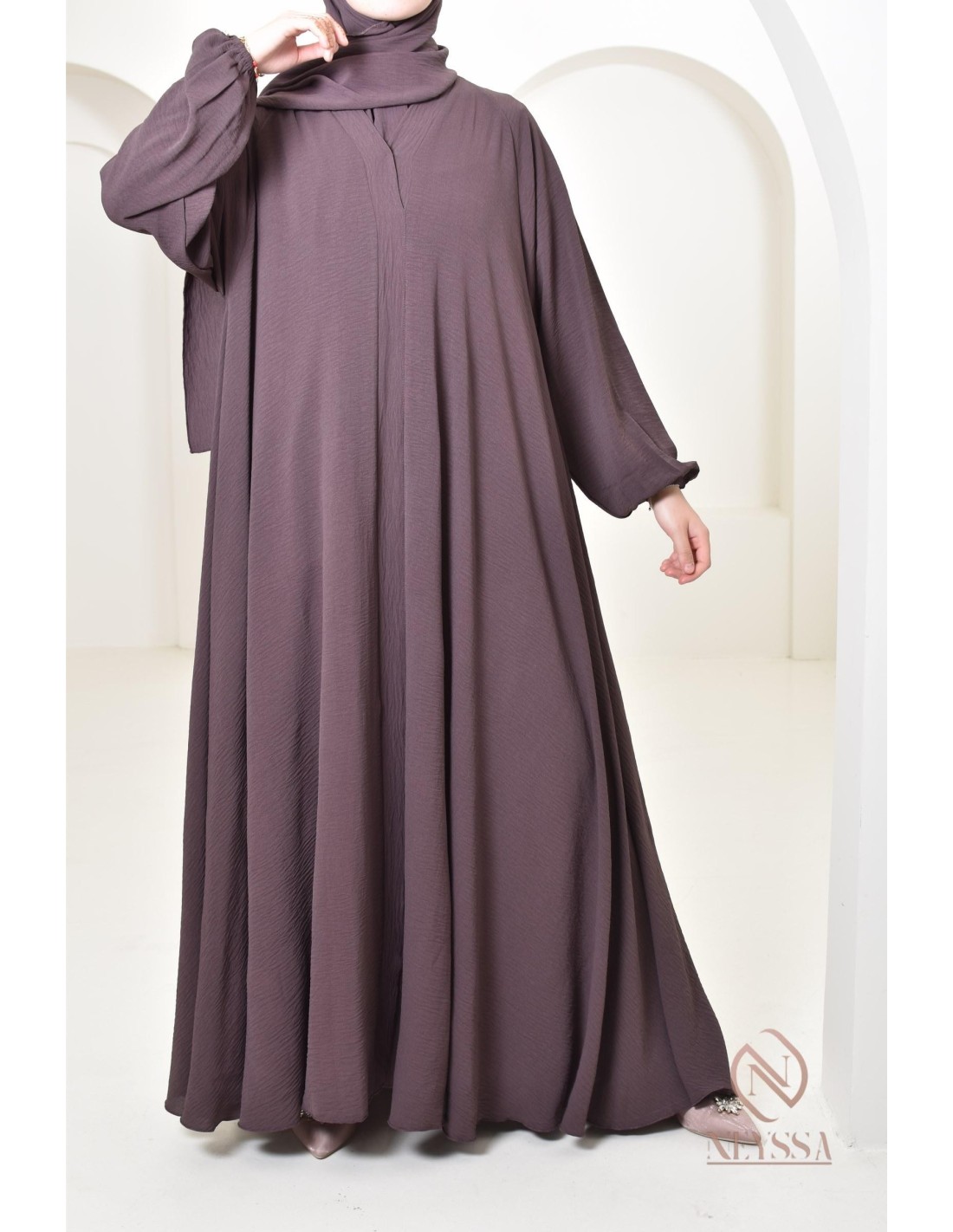 Hijab en jazz fourni : Complétez votre look avec le hijab assorti en jazz, offert avec cette abaya, pour une coordination parfaite (peut varier en fonction des arrivages)