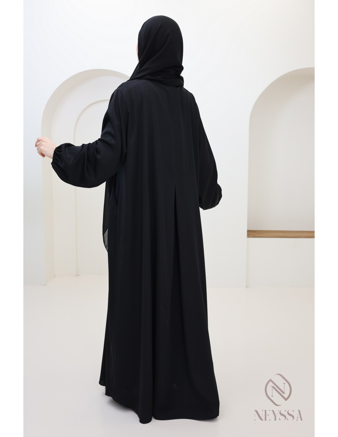 - Finitions parfaites personnalisées : Une plaque dorée Neyssa est cousue à la main sur la manche de la abaya.