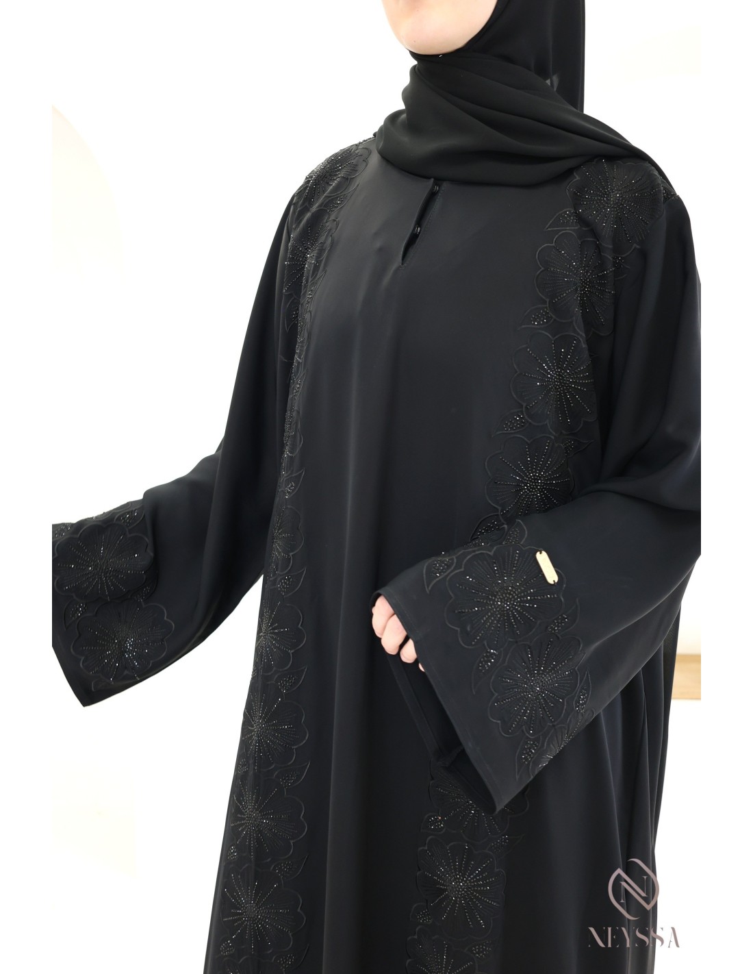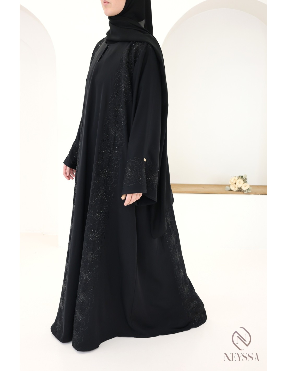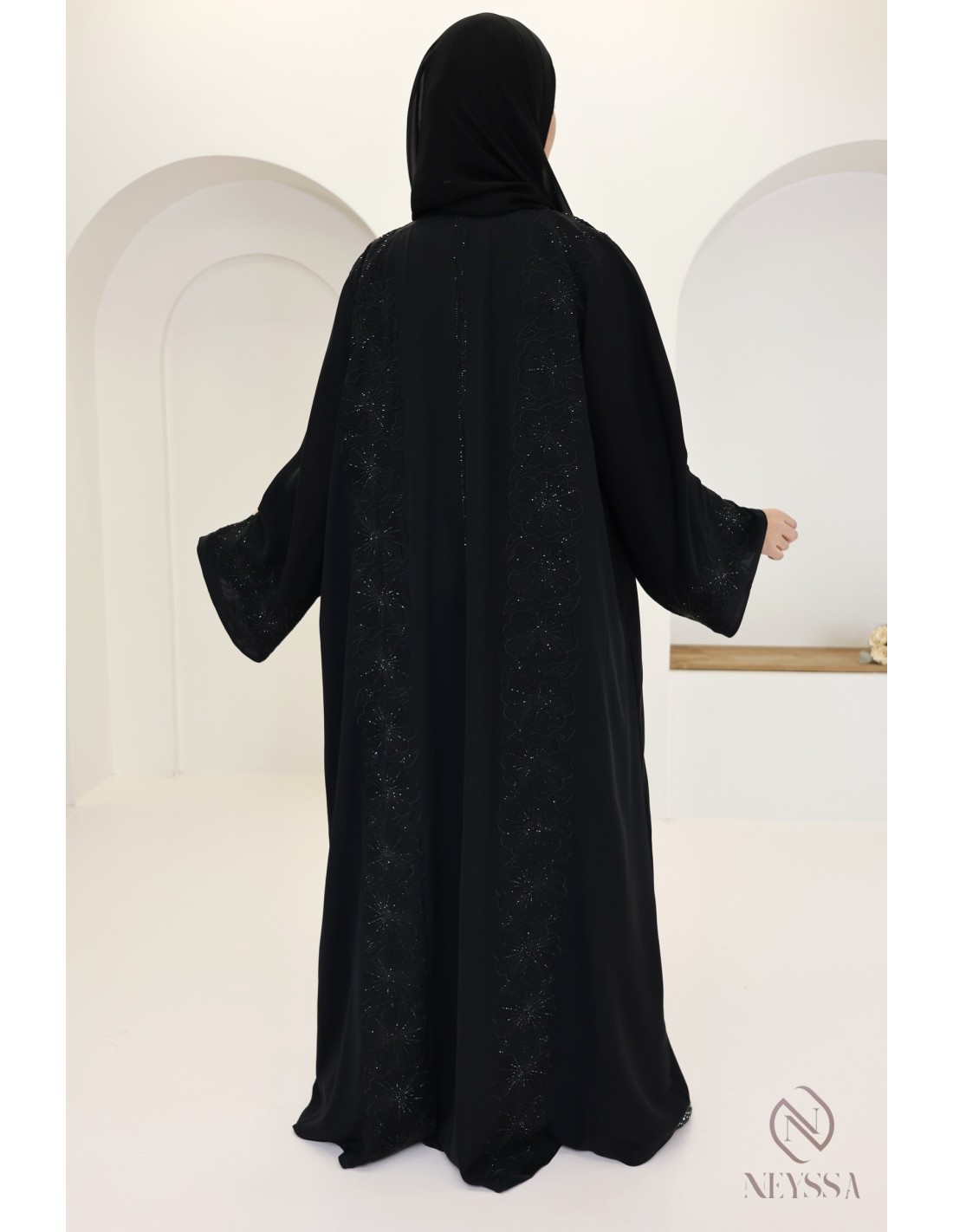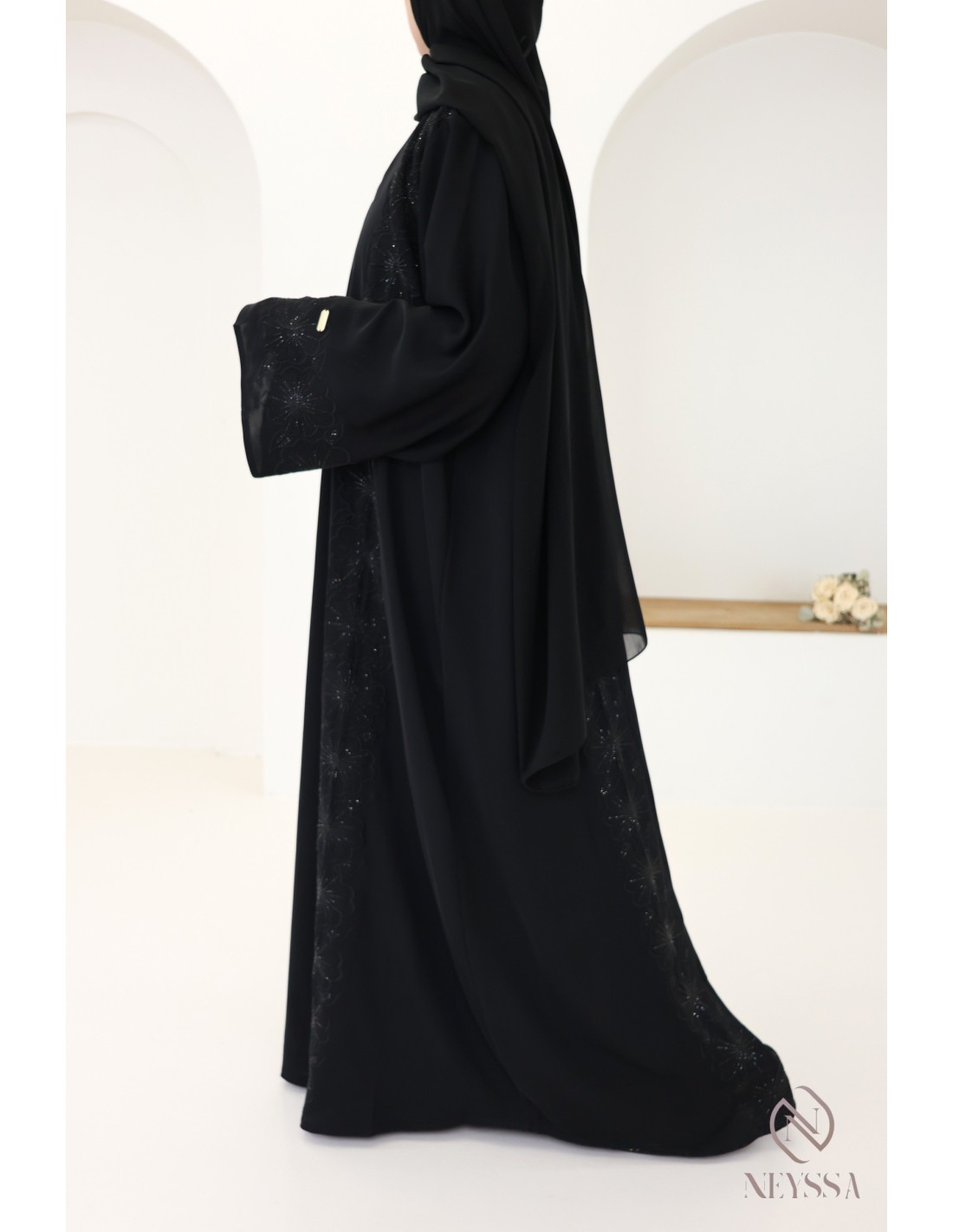 - Broderie et strass : De la broderie cousus à la main et des strass ornent la abaya ainsi que les manches, apportant un style khaleeji moderne et tendance.