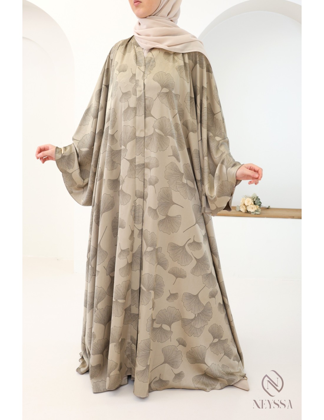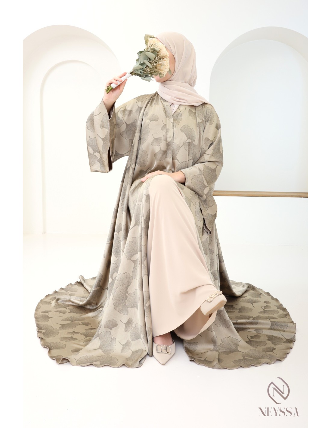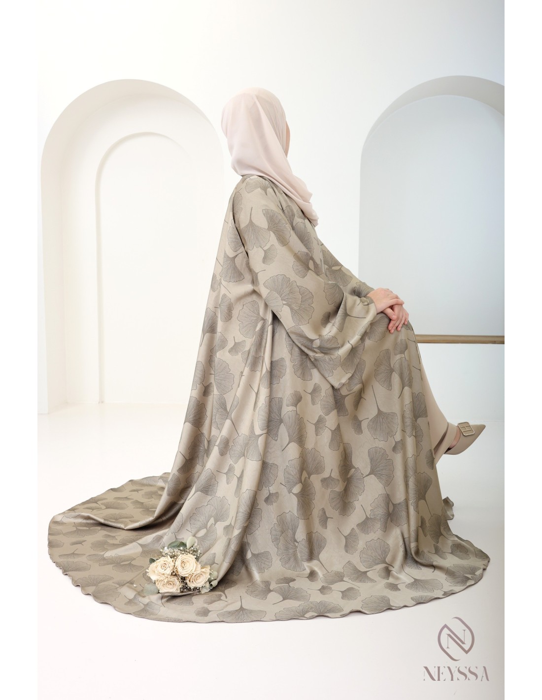 Abaya Kimono Dubaï taupe motifs feuillage coupe umbrella tendance femme