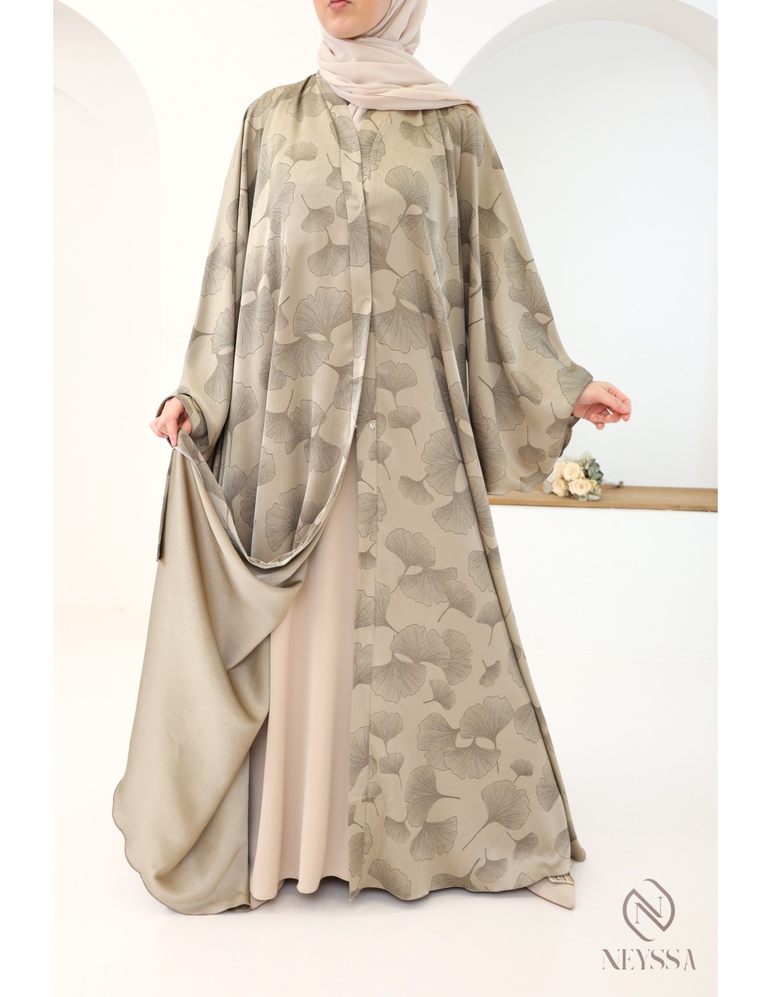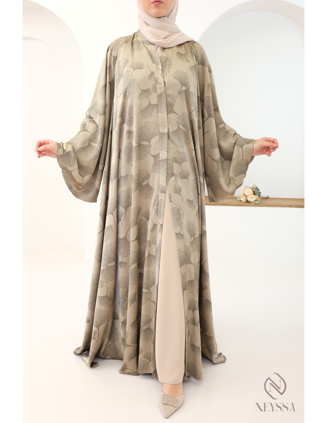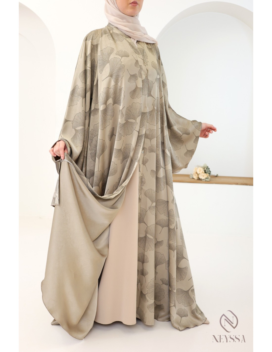 Abaya Kimono Dubaï taupe motifs feuillage coupe umbrella tendance femme