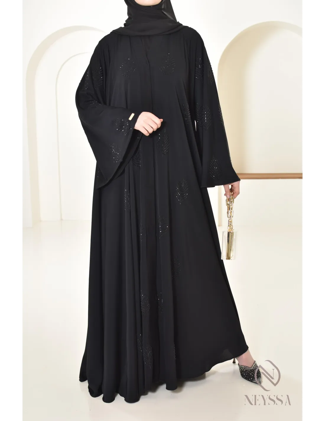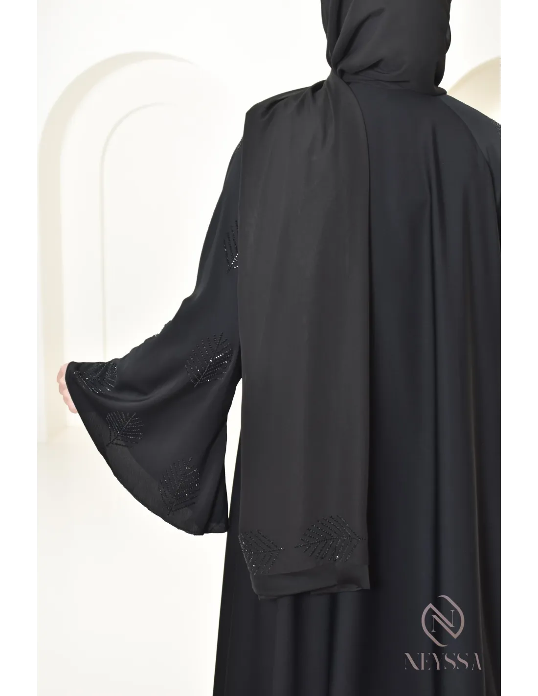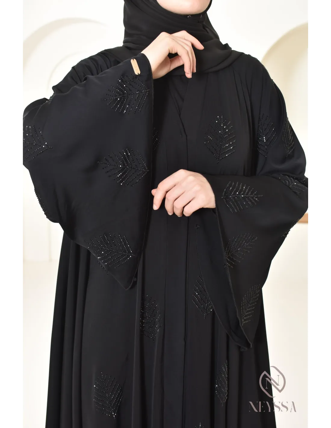 Finitions parfaites personnalisées : Une plaque dorée Neyssa est cousu au niveau de la manche de la abaya.