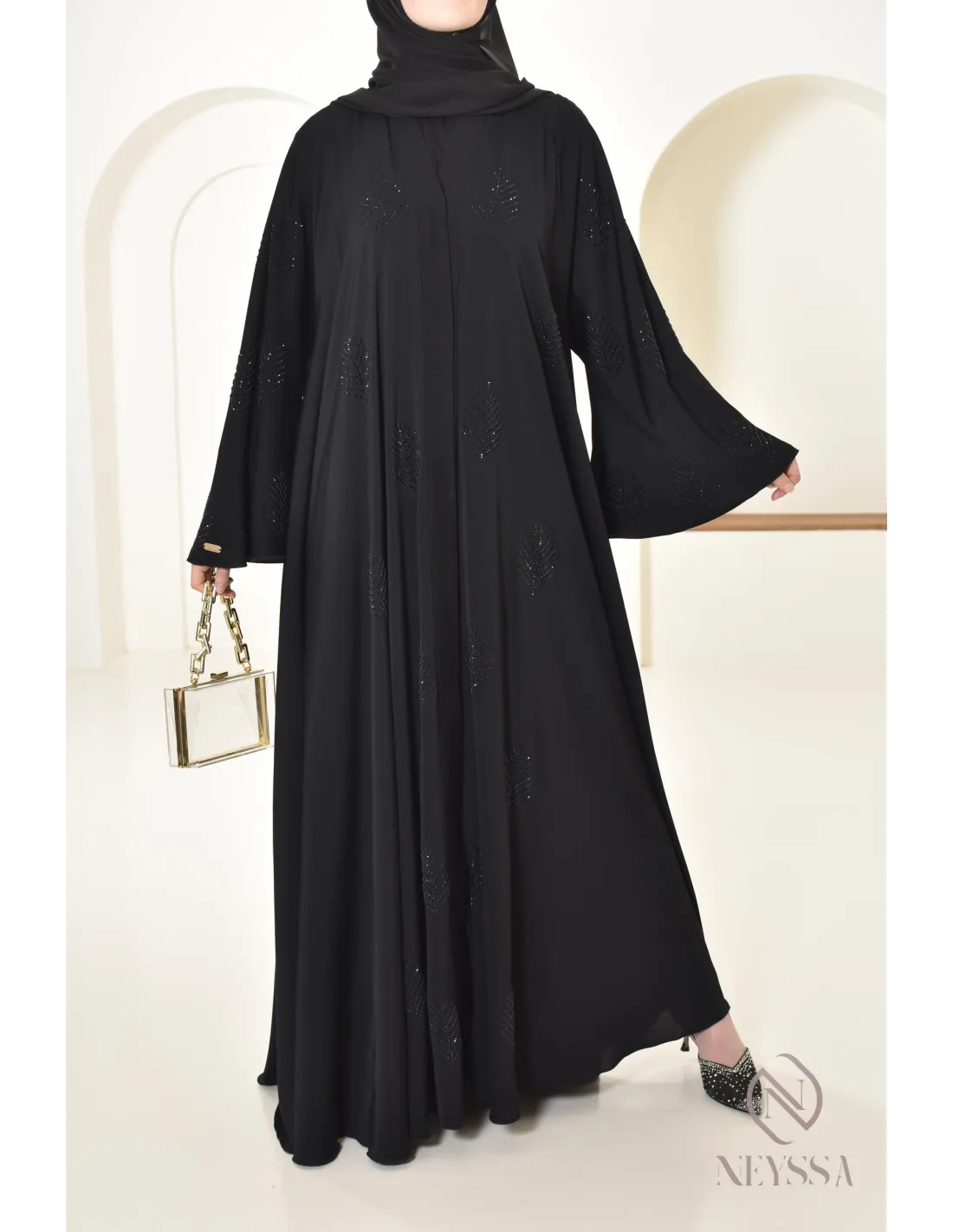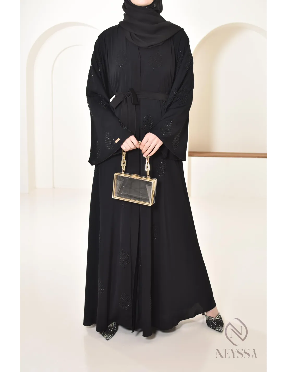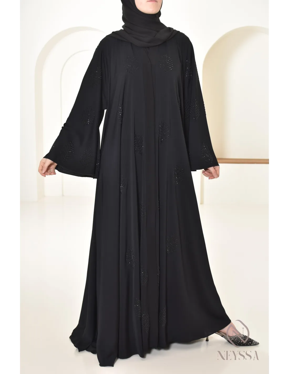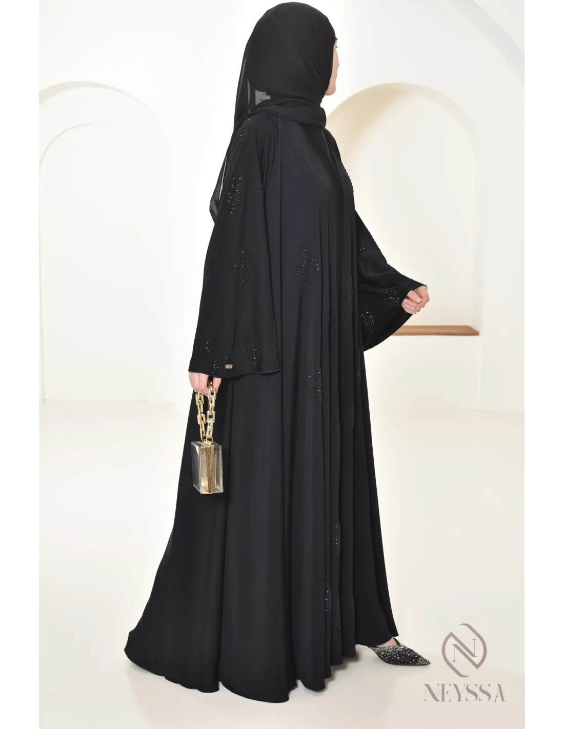 Finitions parfaites personnalisées : Une plaque dorée Neyssa est cousu au niveau de la manche de la abaya.