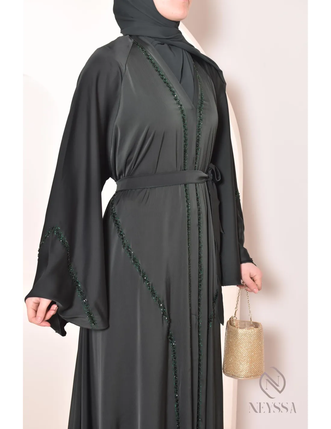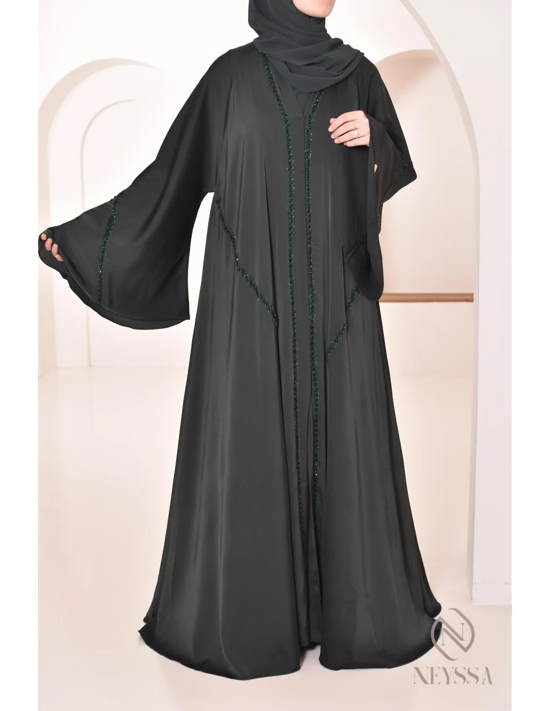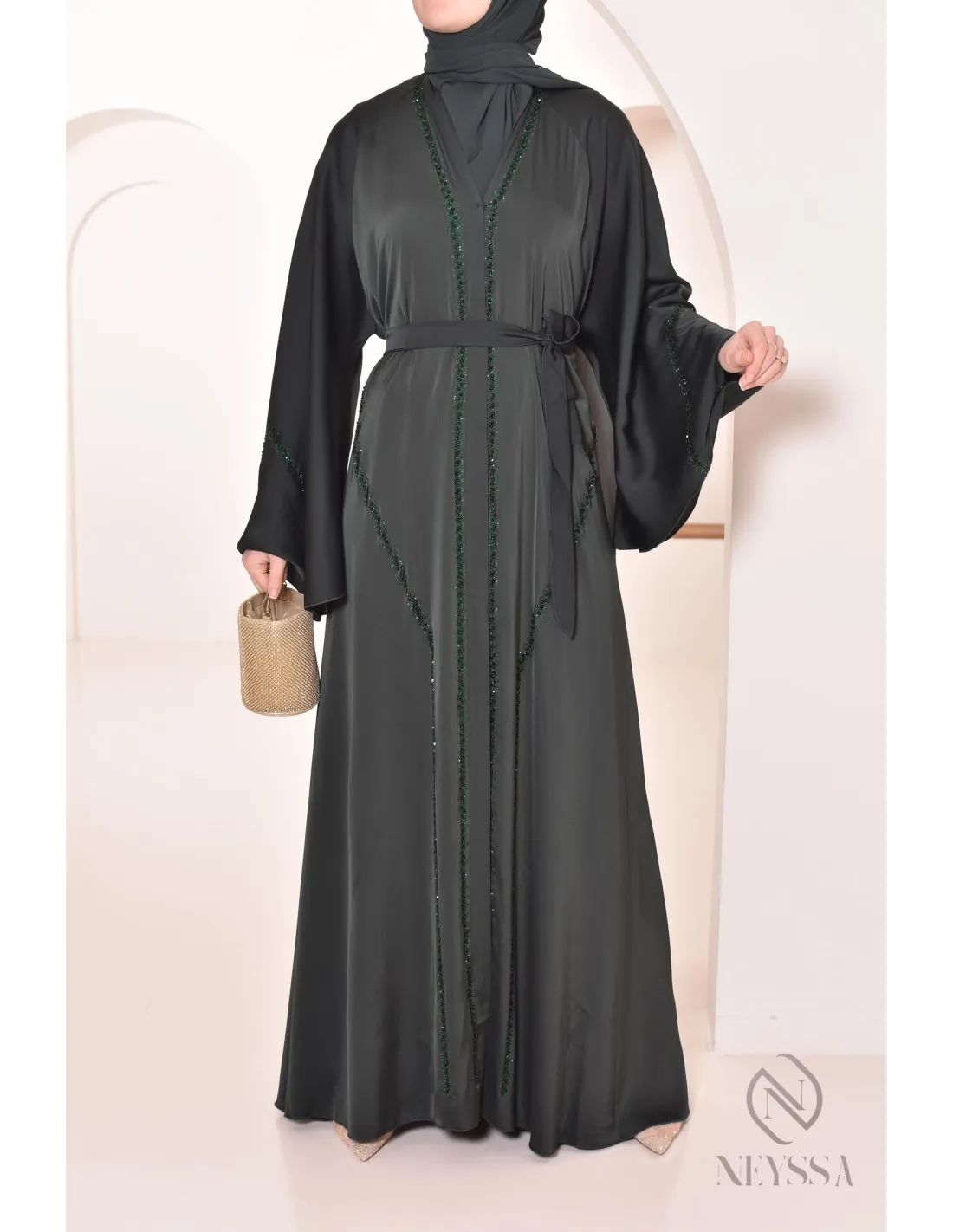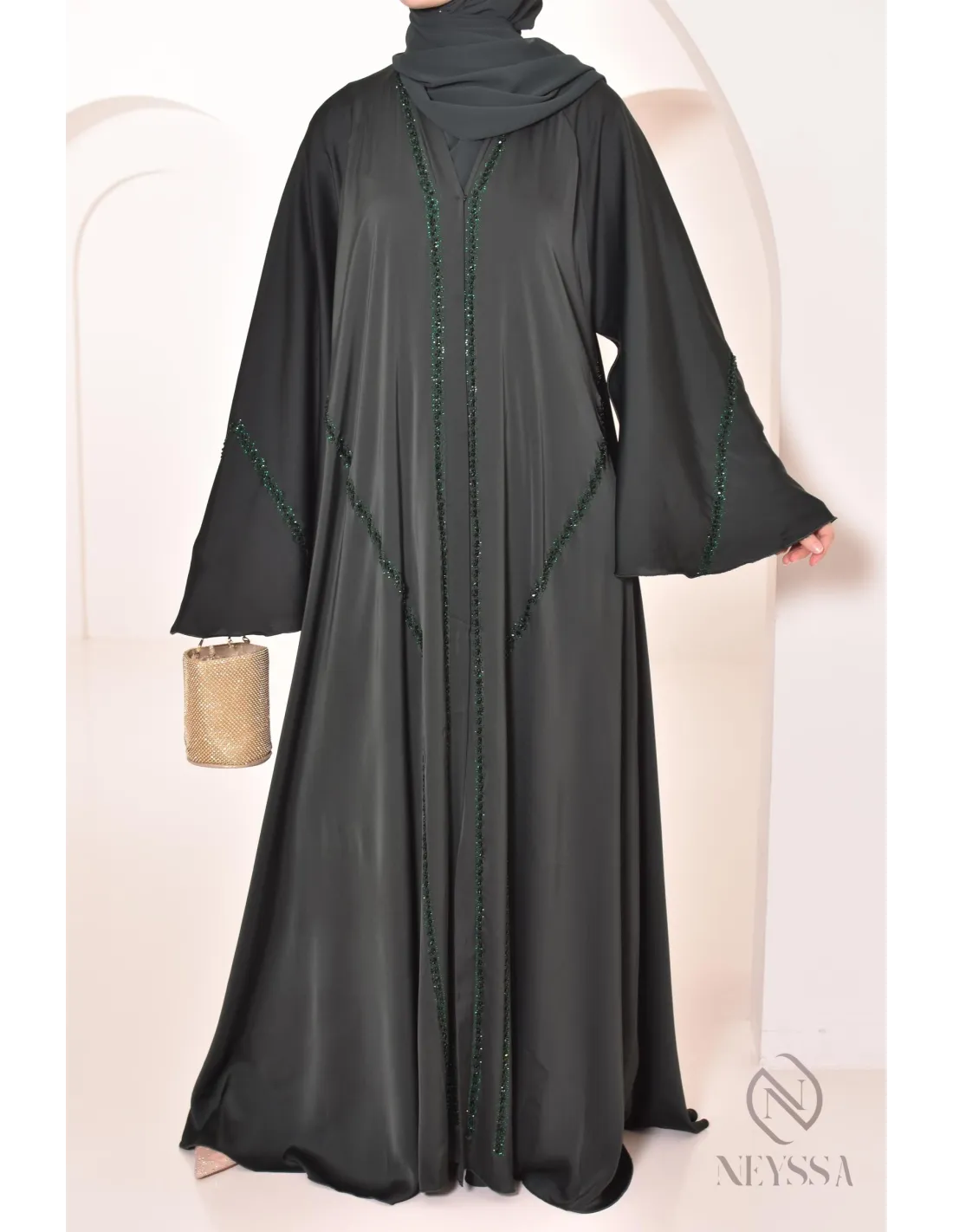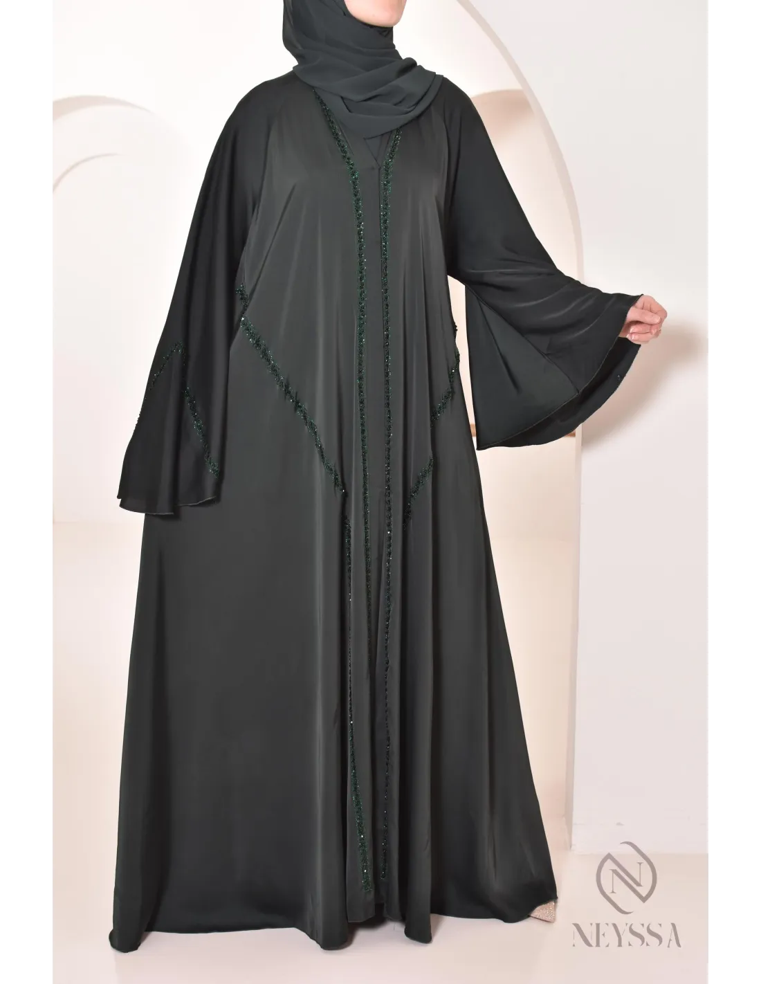 Abaya Dubaï luxe évasée RIHAM Vert