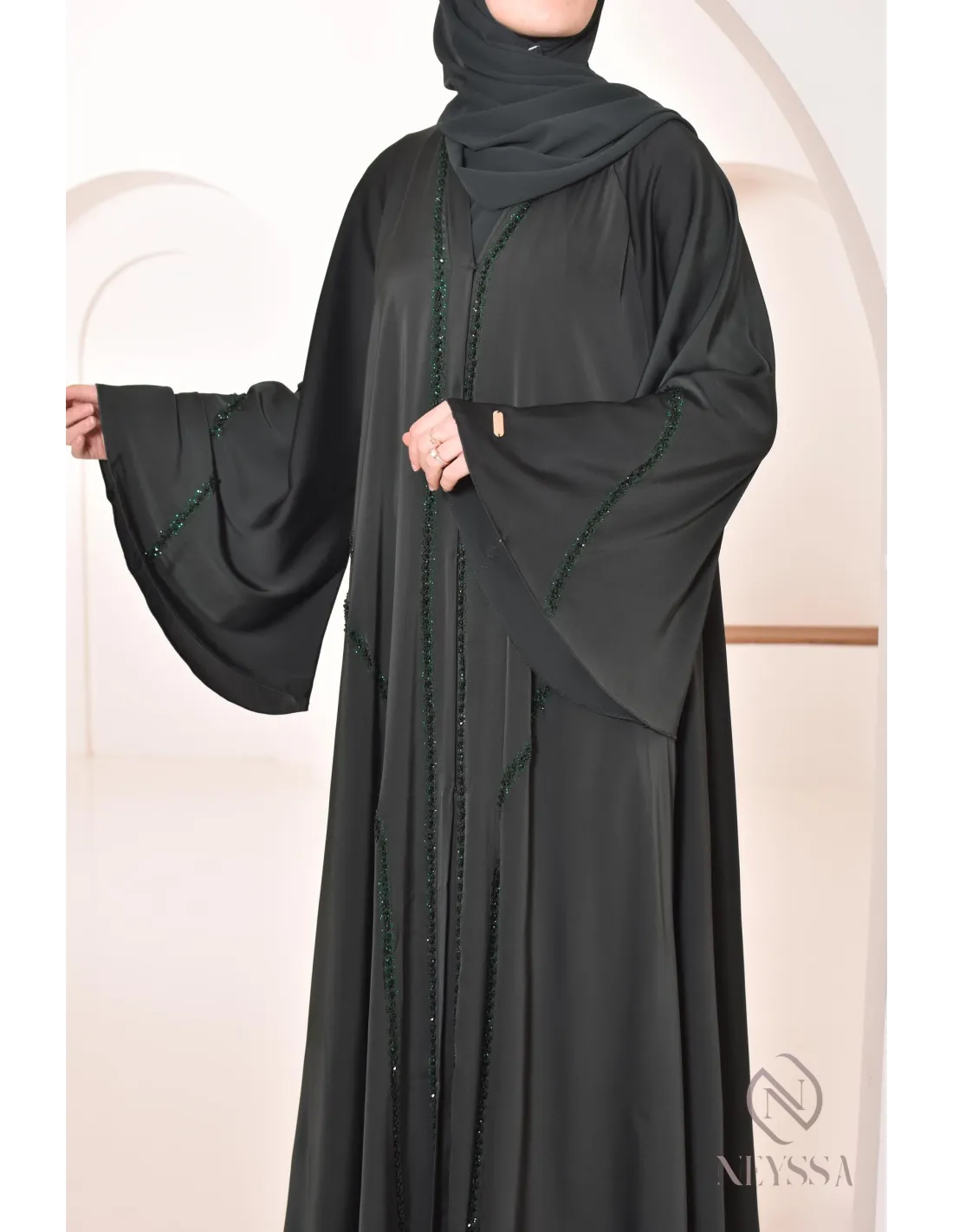 Finitions parfaites personnalisées : Une plaque dorée Neyssa est cousu au niveau de la manche de la abaya.