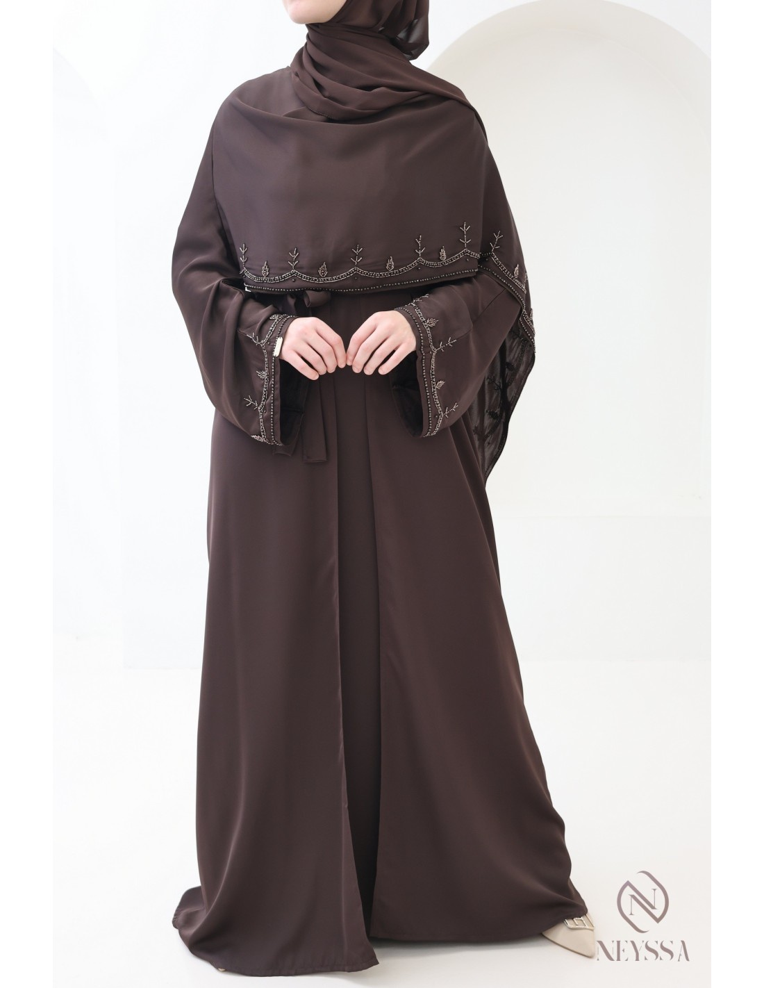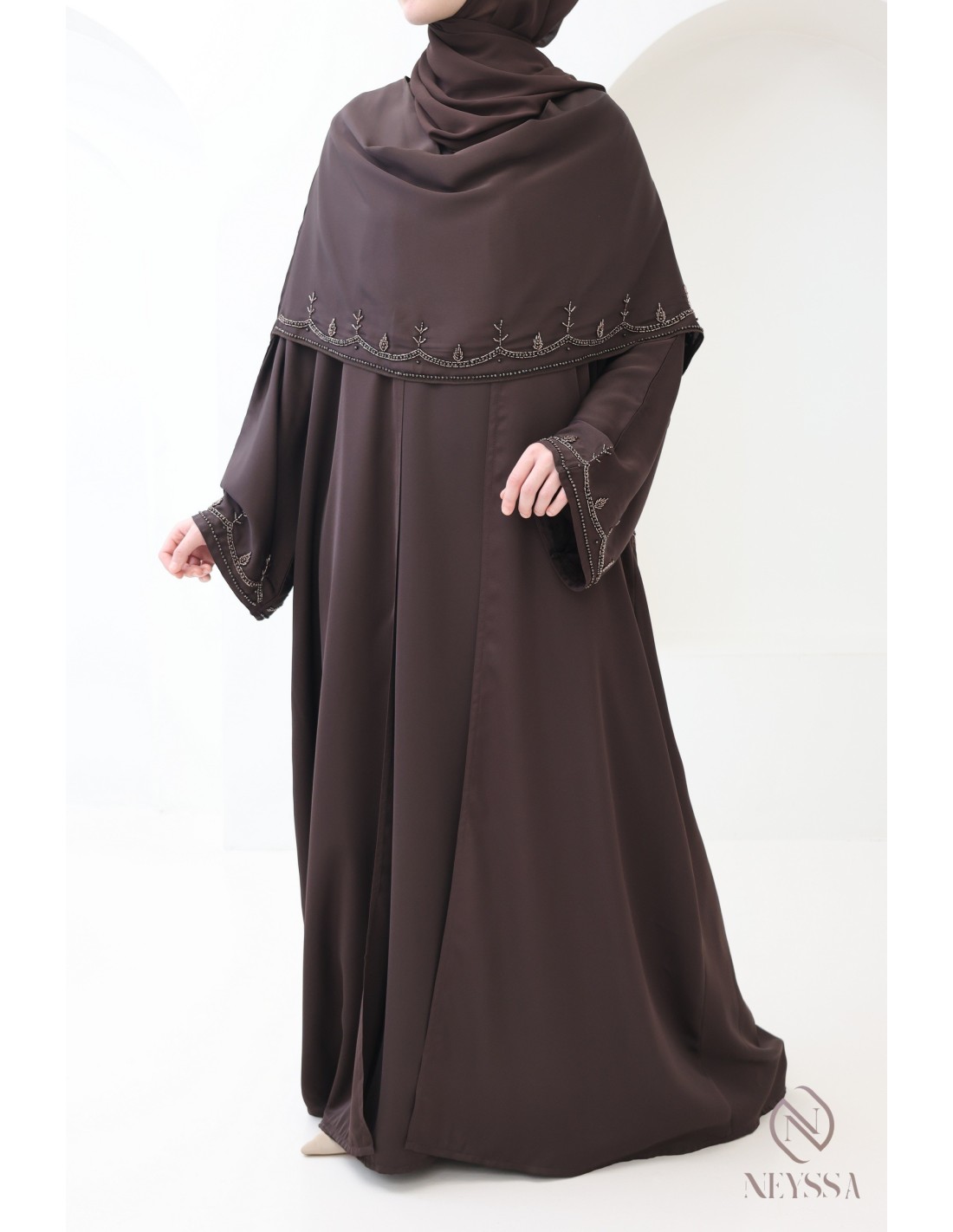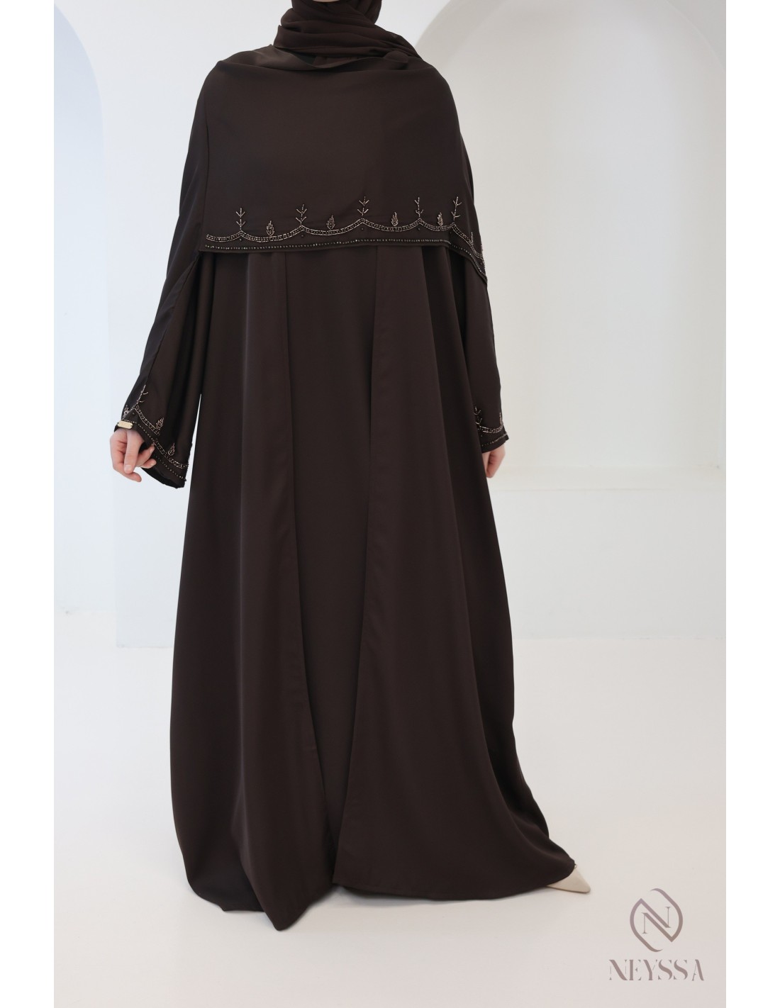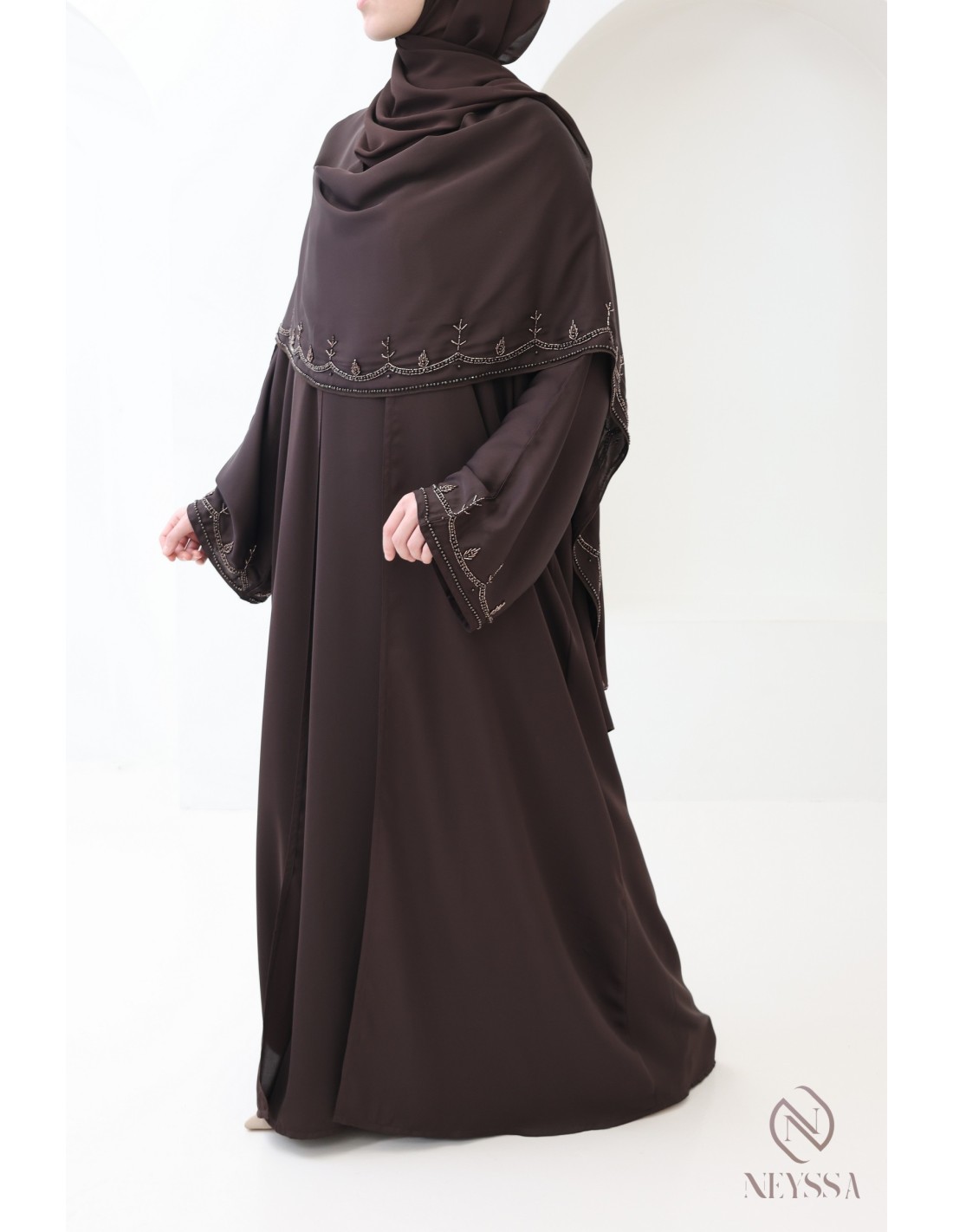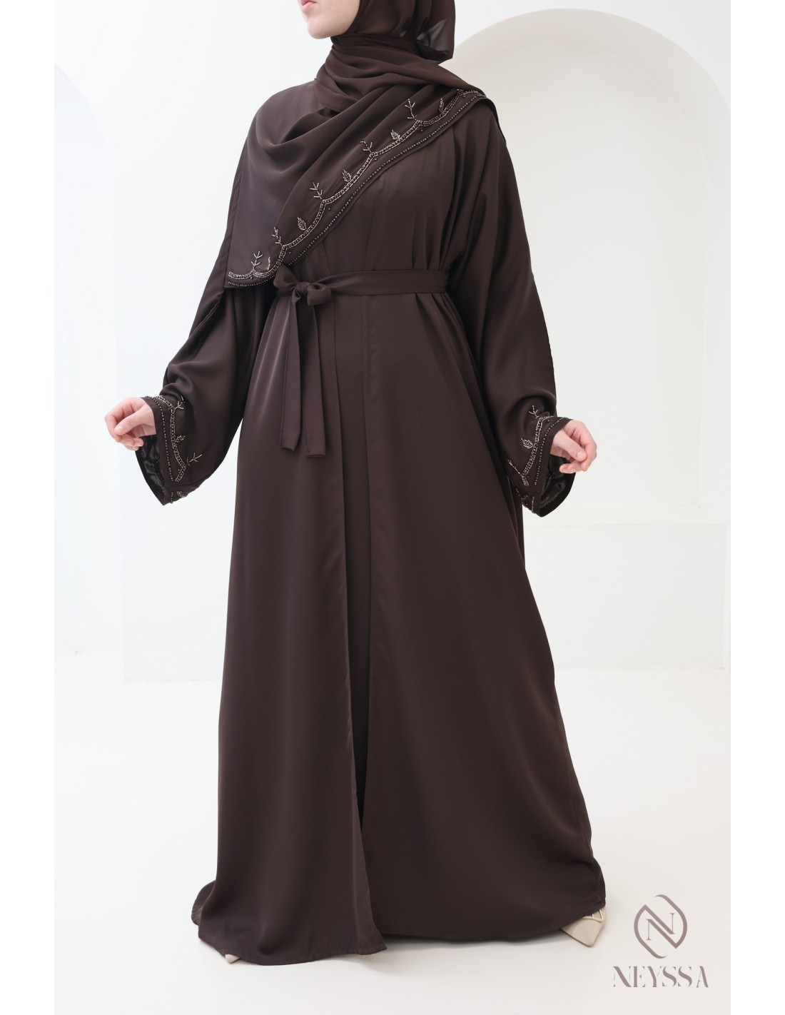 Abaya Dubaï luxe châle intégré chocolat