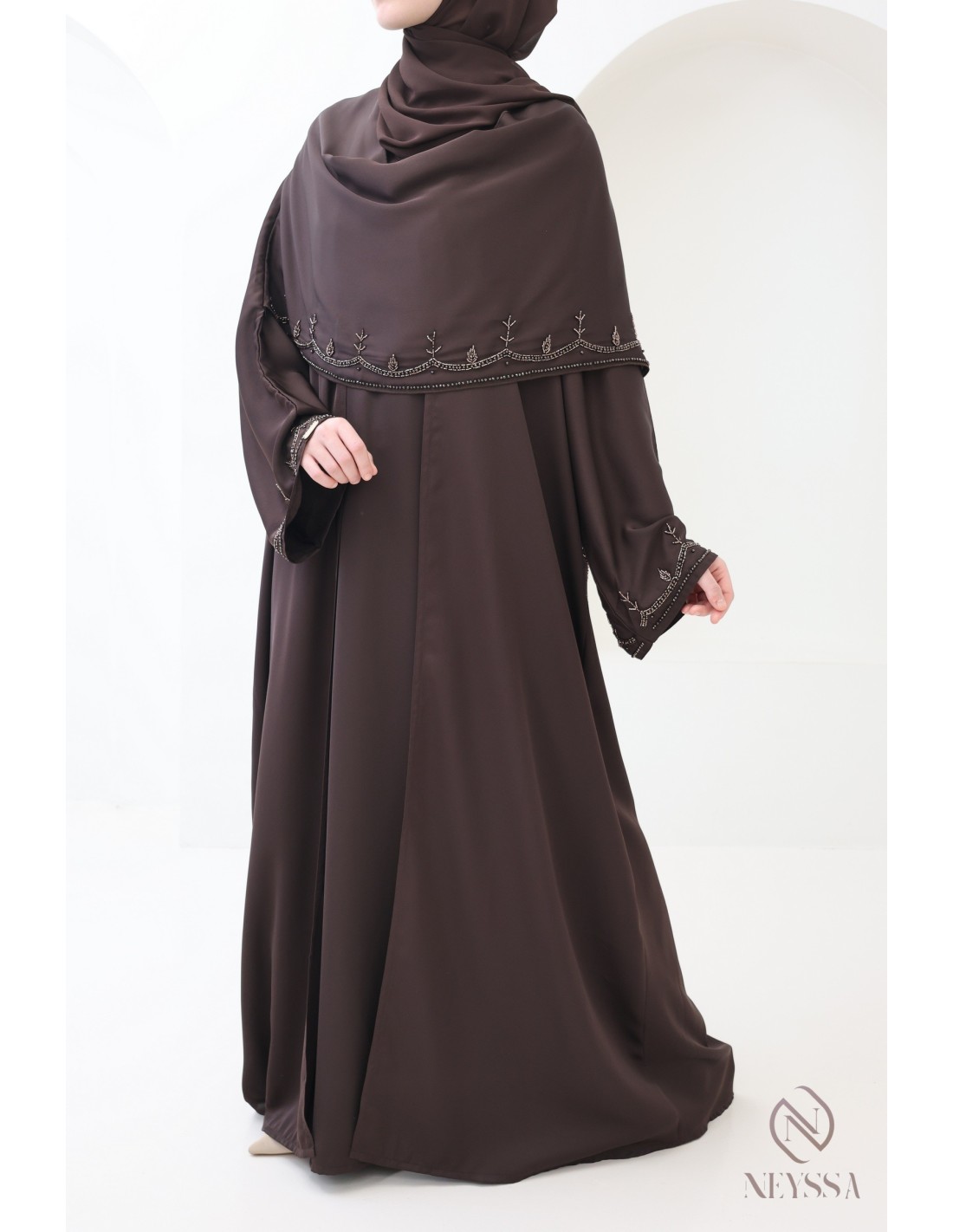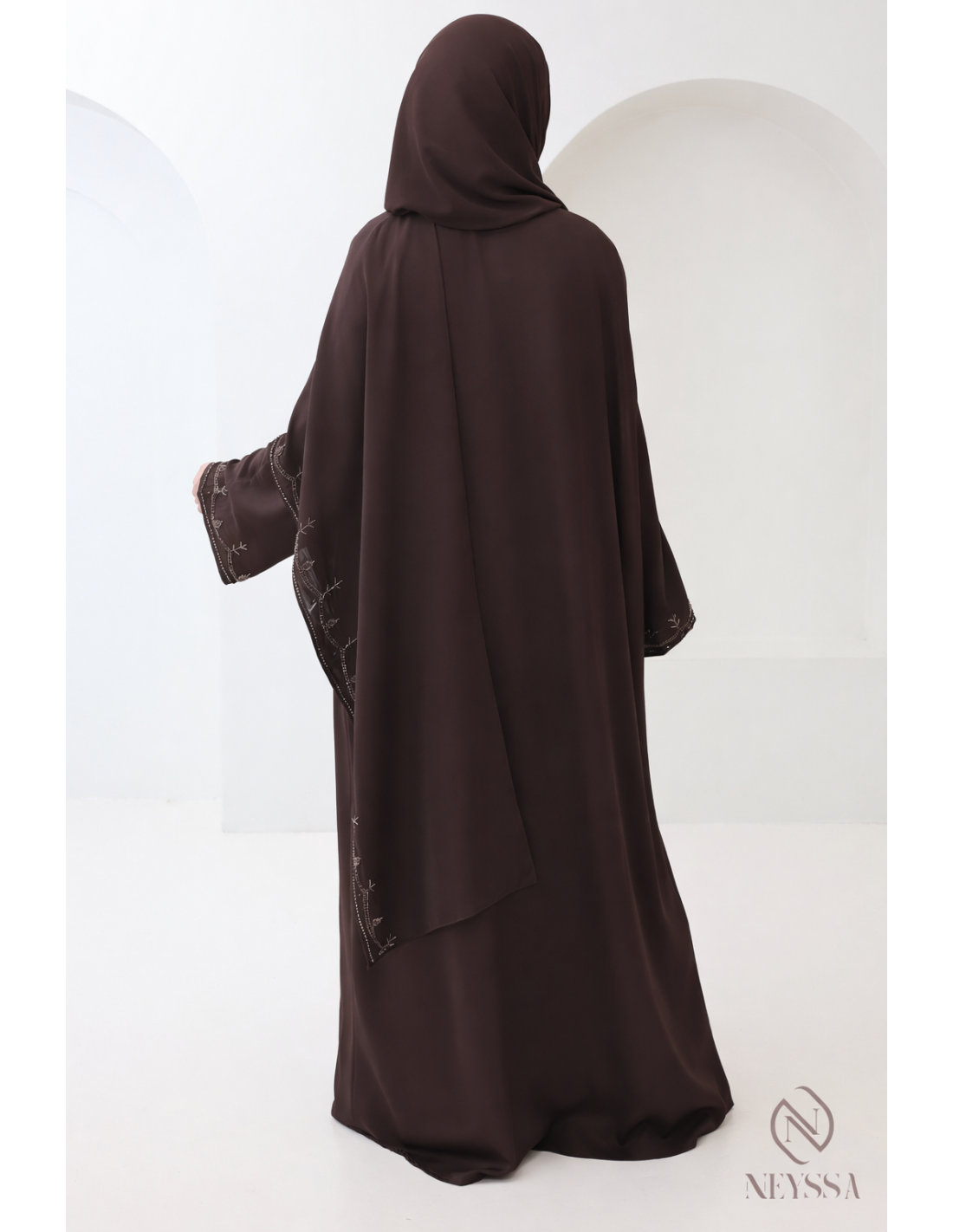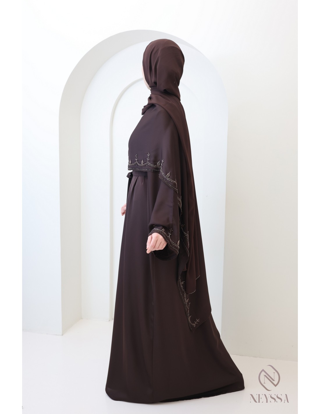 Avec cette magnifique tenue abaya, vous rayonnerez le jour J, c'est certain ! La Confection Neyssa représente un mariage parfait d'élégance et de sophistication. Fabriquée avec soin dans nos ateliers à Dubaï, cette abaya de qualité exceptionnelle dégage un charme incomparable.