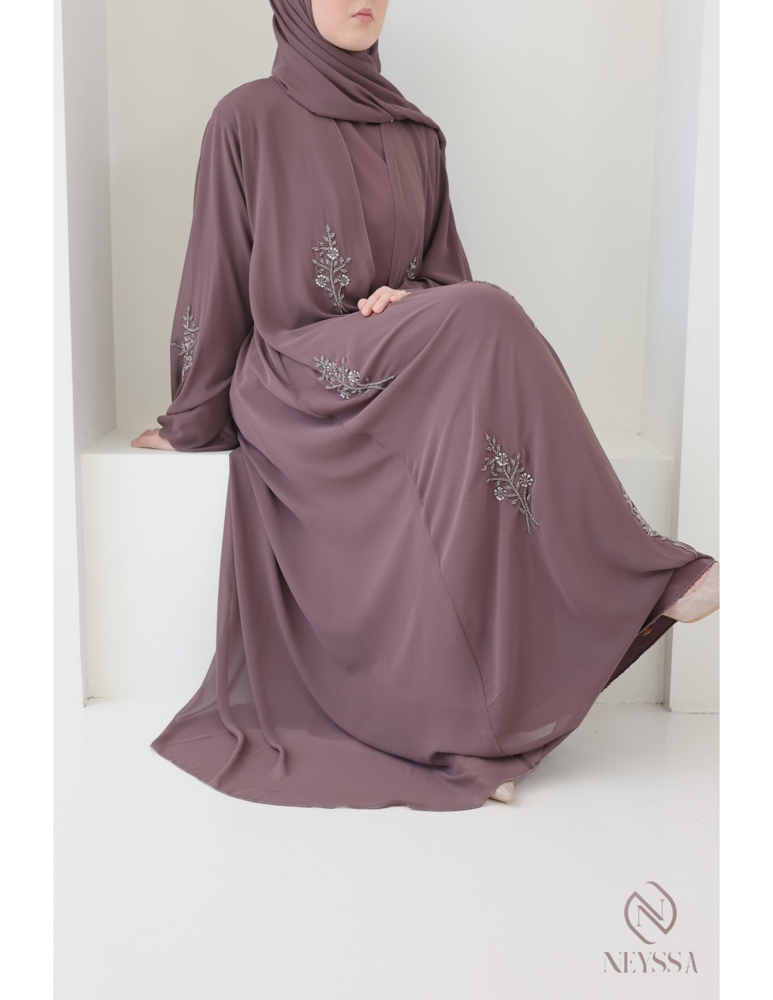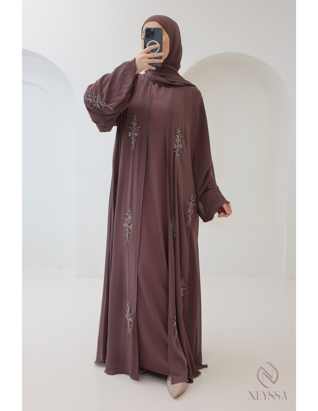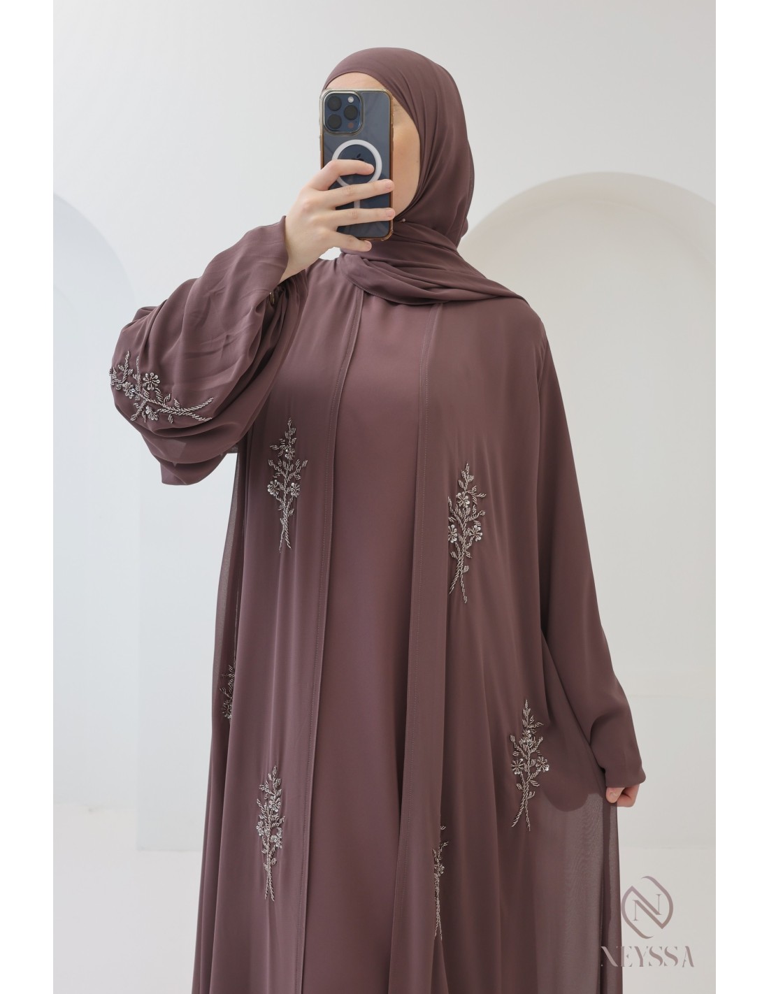 Avec cette magnifique tenue abaya, vous rayonnerez le jour J, c'est certain ! La Confection Neyssa représente un mariage parfait d'élégance et de sophistication. Fabriquée avec soin dans nos ateliers à Dubaï, cette abaya de qualité exceptionnelle dégage un charme incomparable.