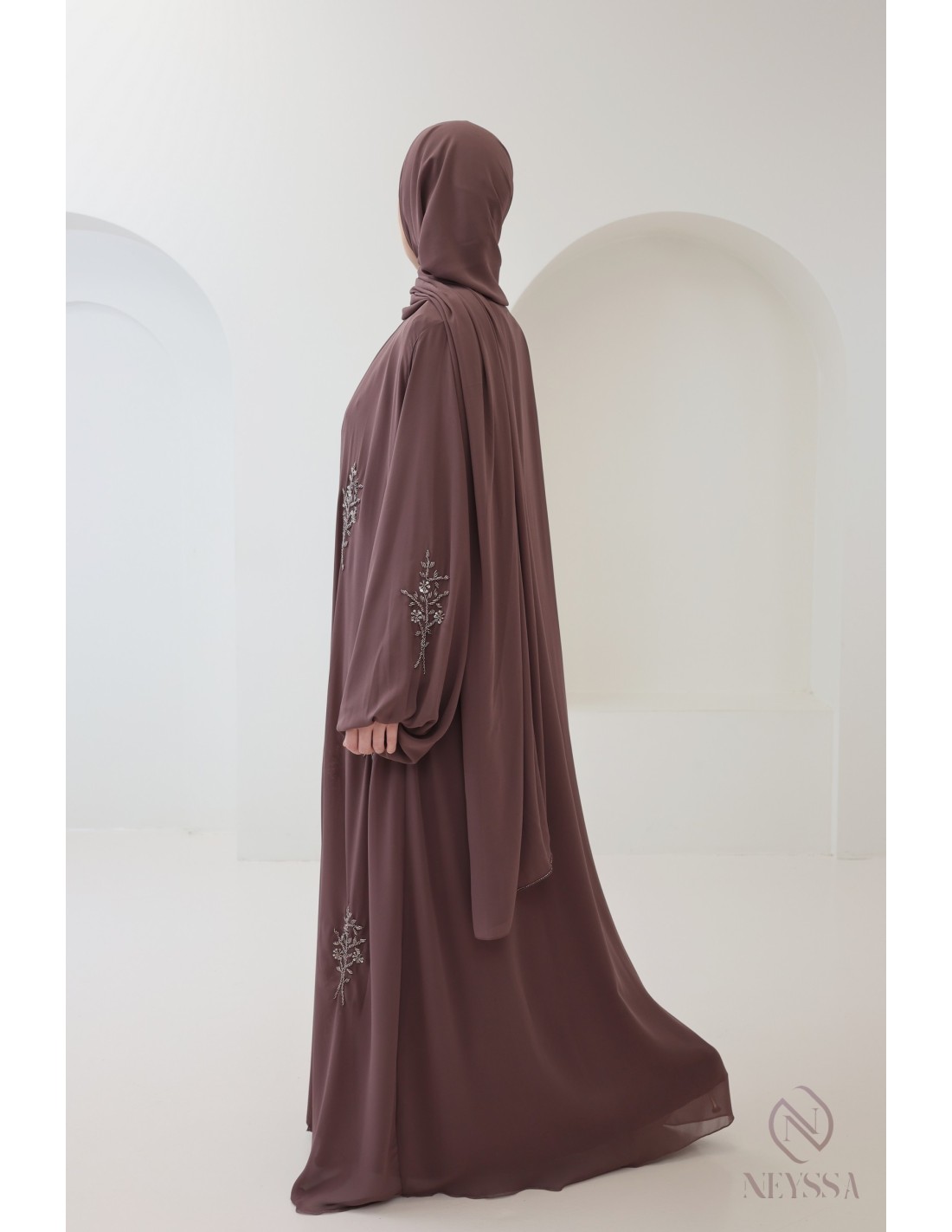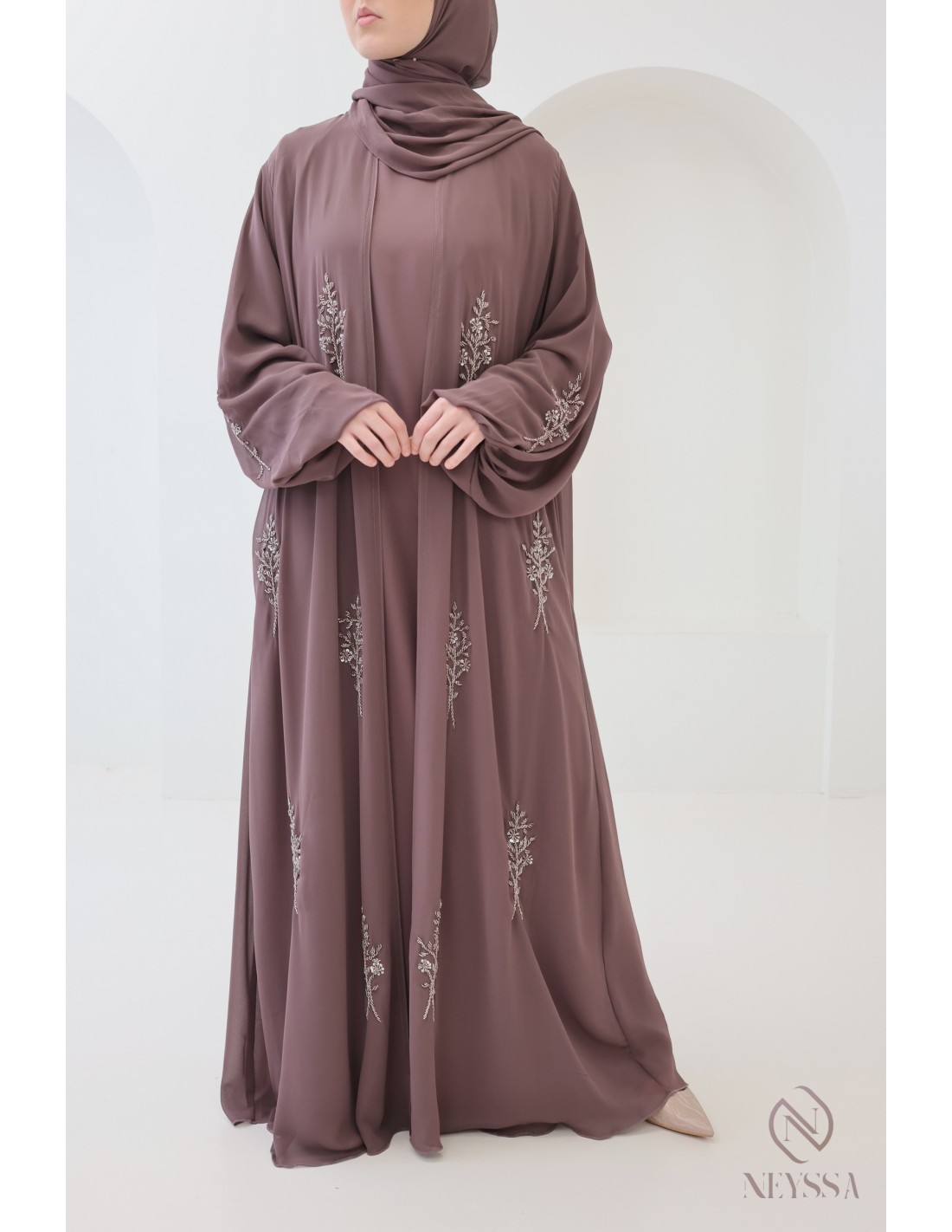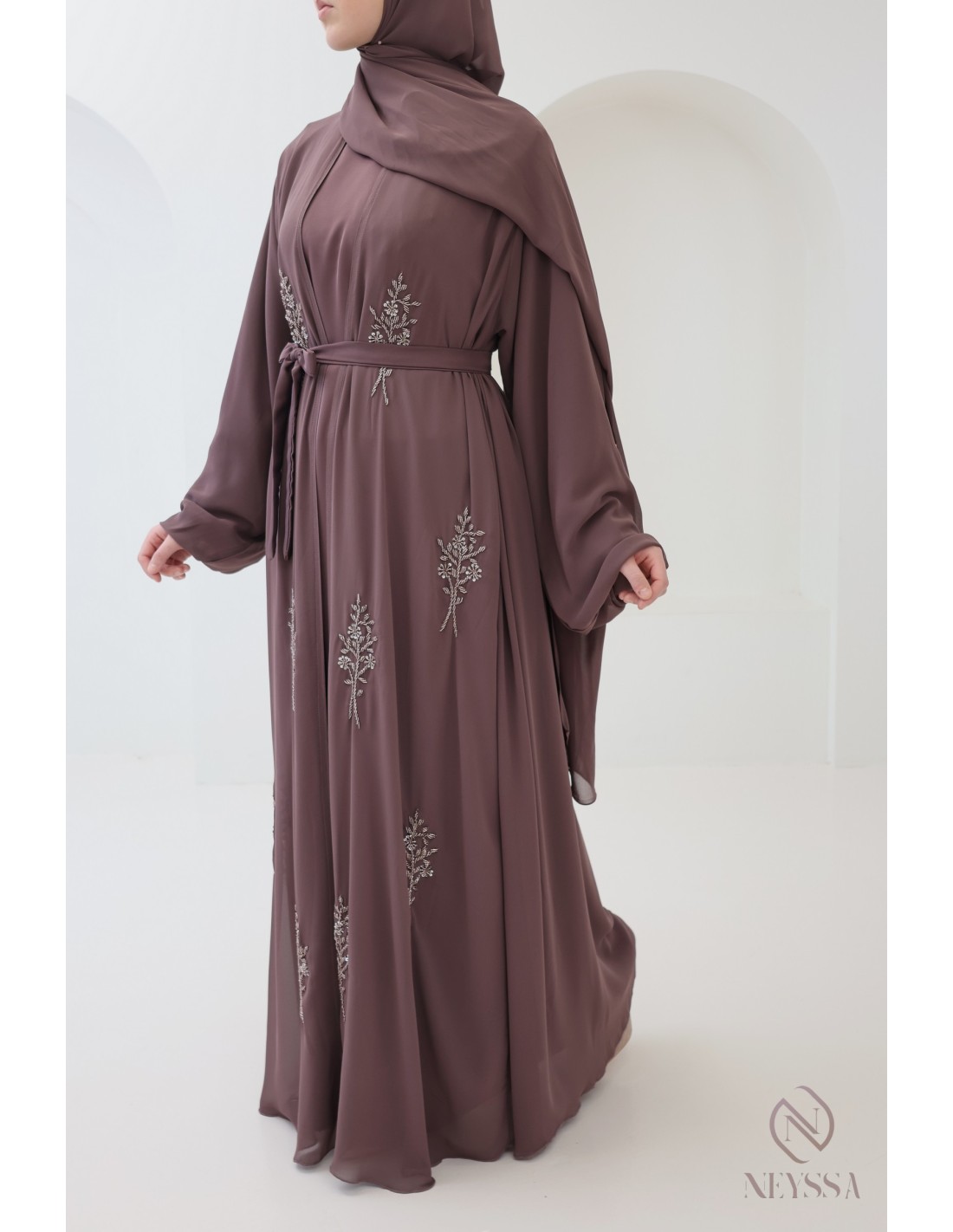 Pourquoi choisir la abaya kimono rosy brown mousseline et soie de Nidah perlée pour femme ?