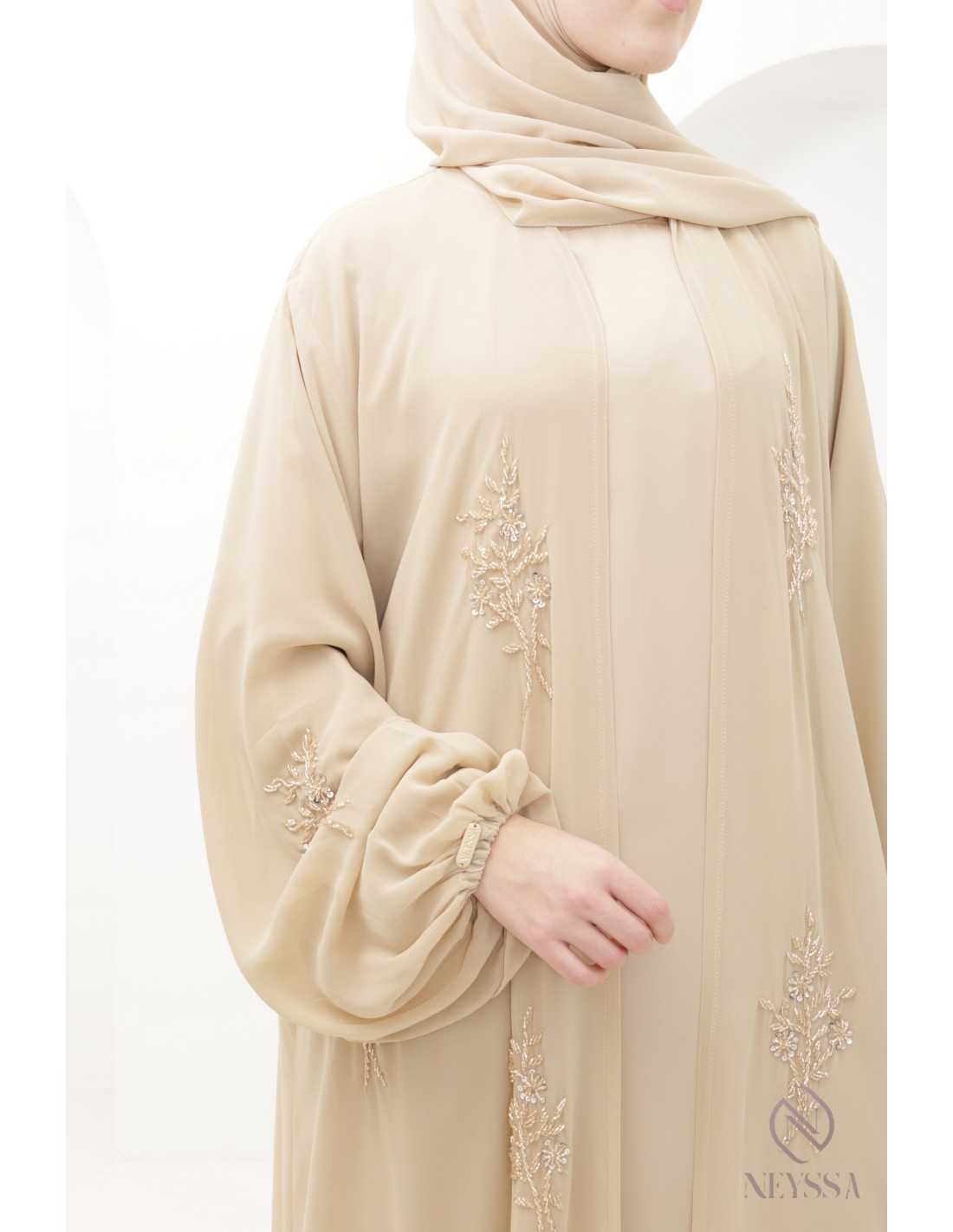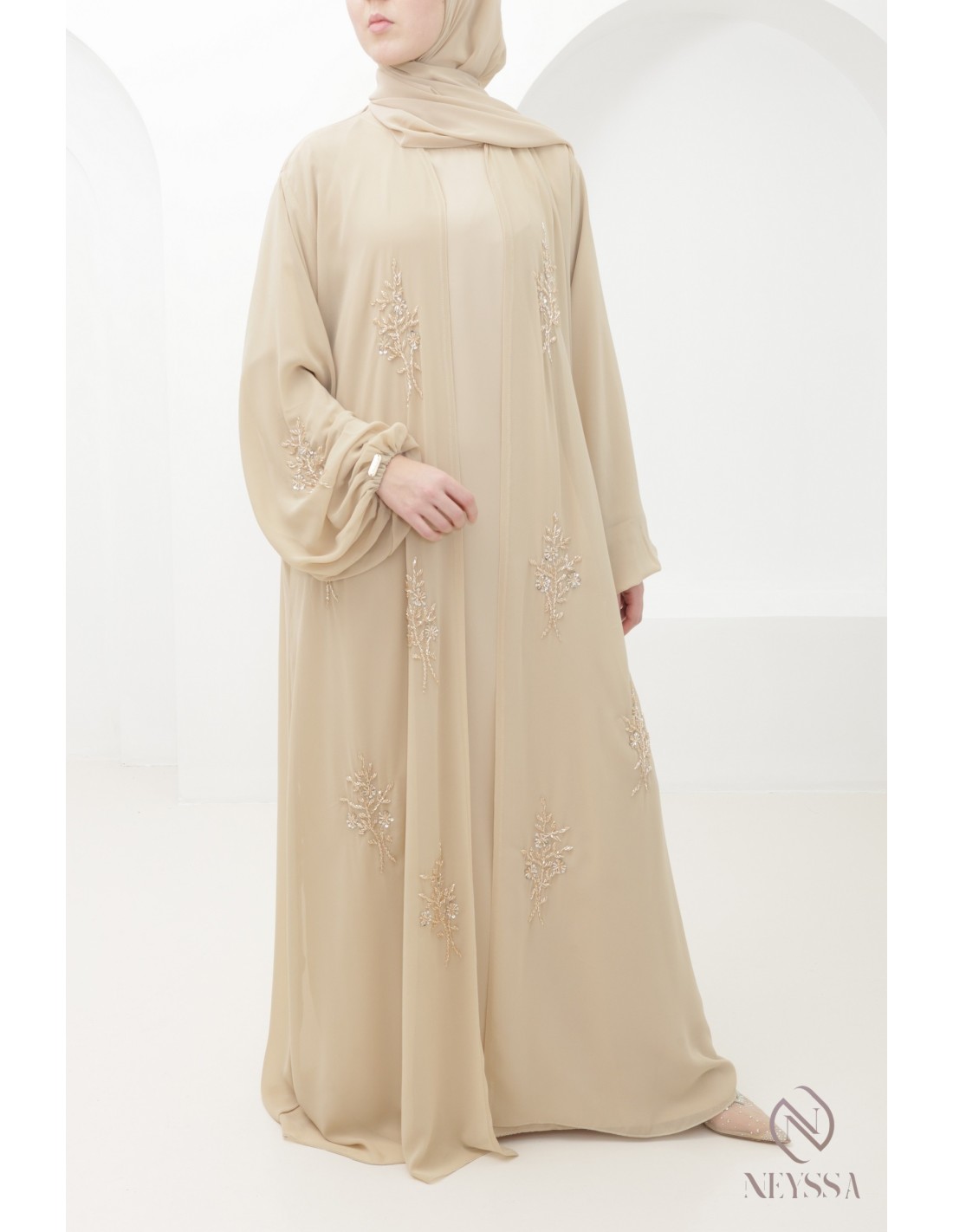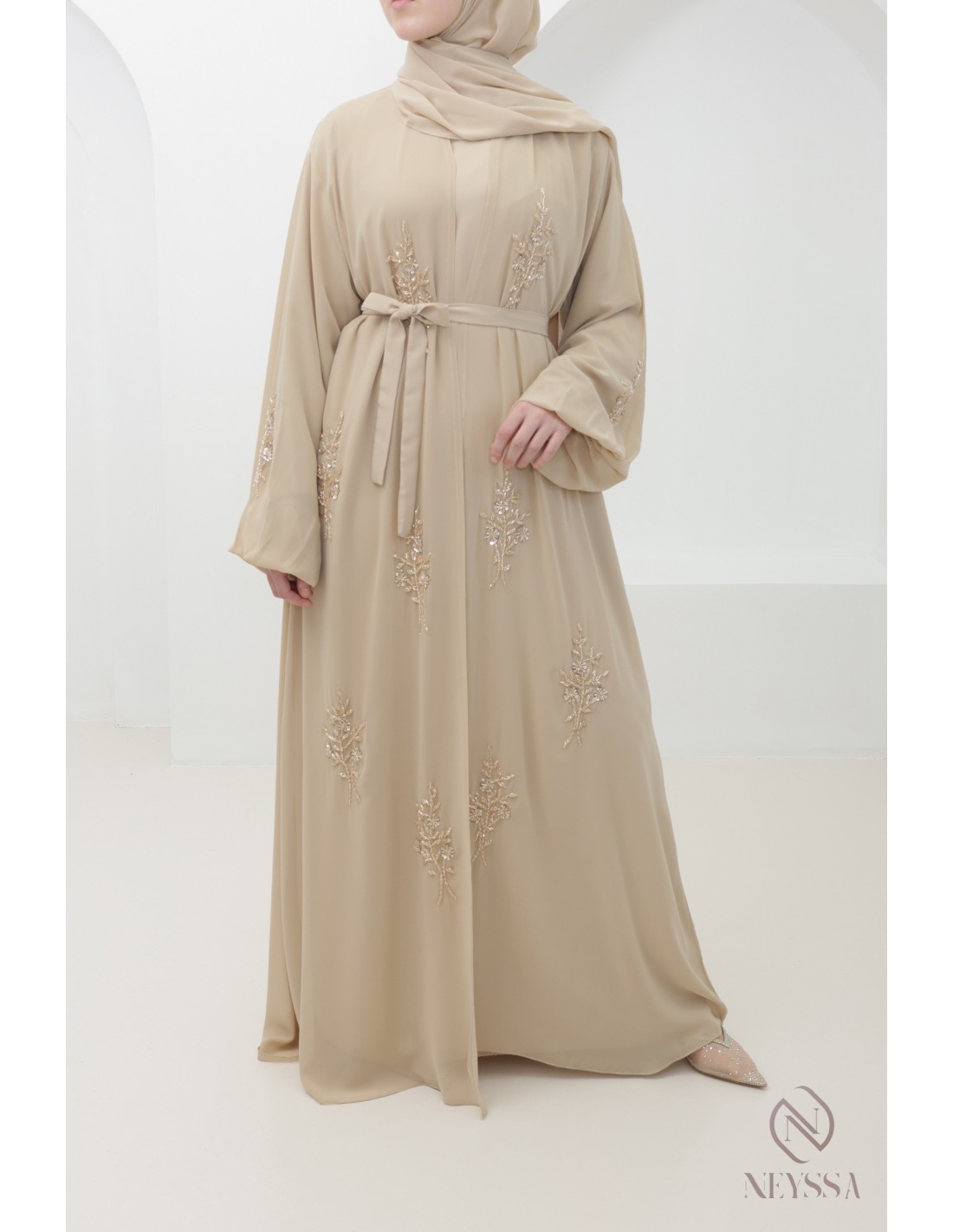 Abaya Dubaï Kimono Beige 4 pièces brodée a la main : Neyssa Confection