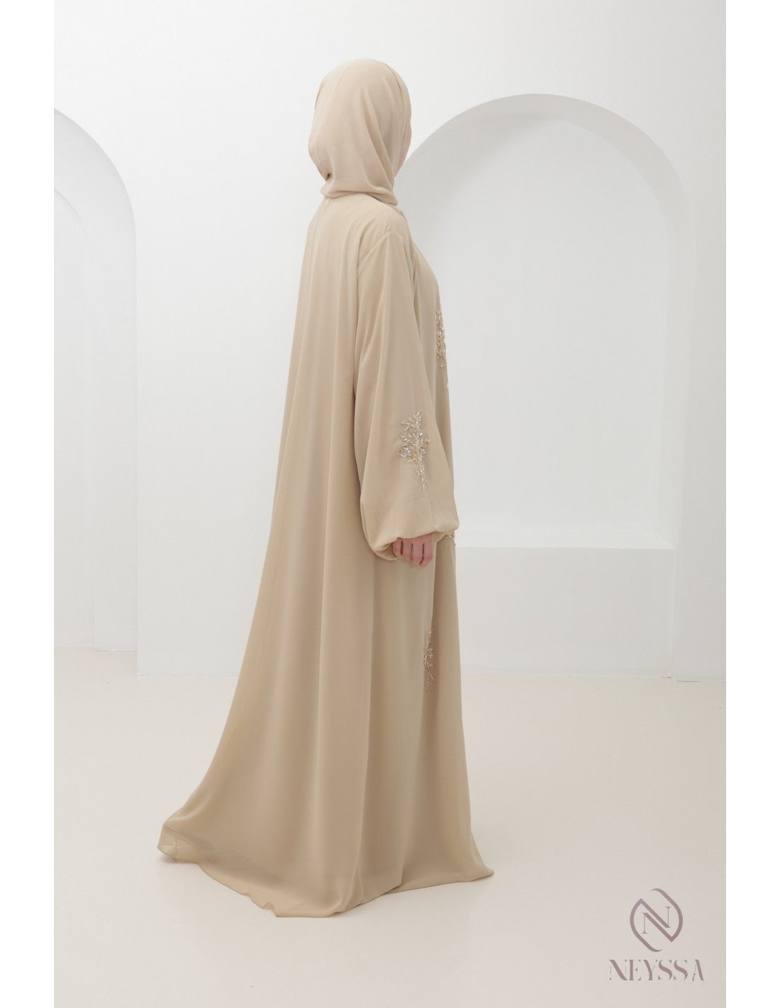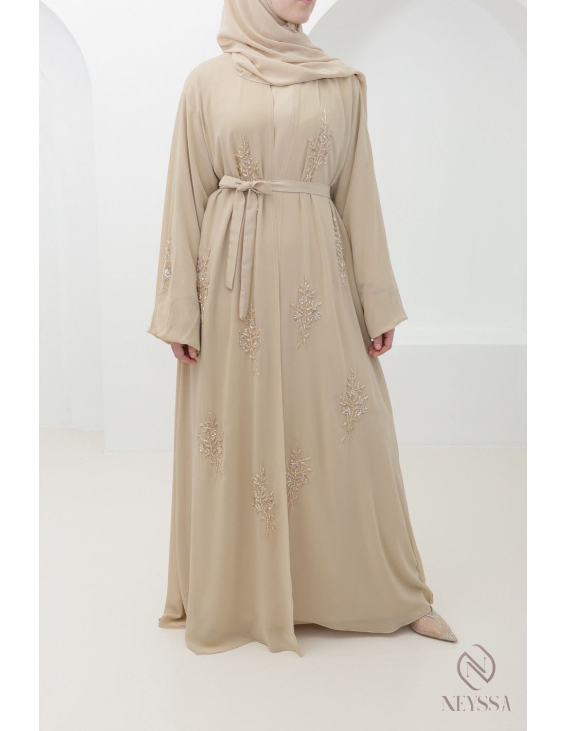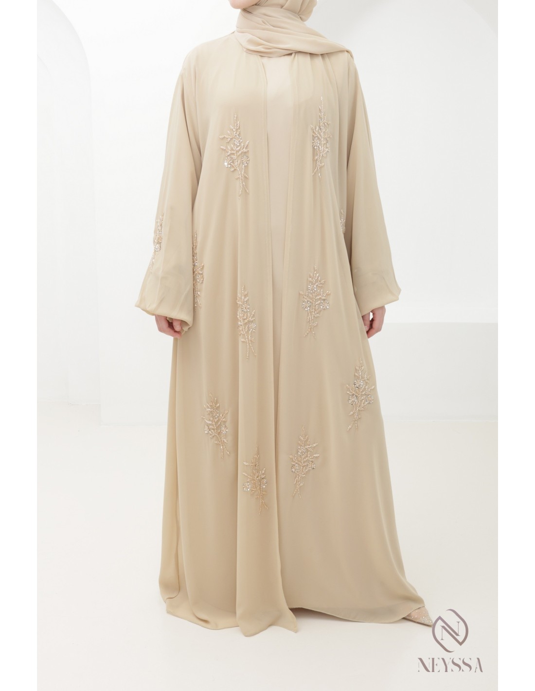 Abaya Dubaï Kimono Beige 4 pièces brodée a la main : Neyssa Confection