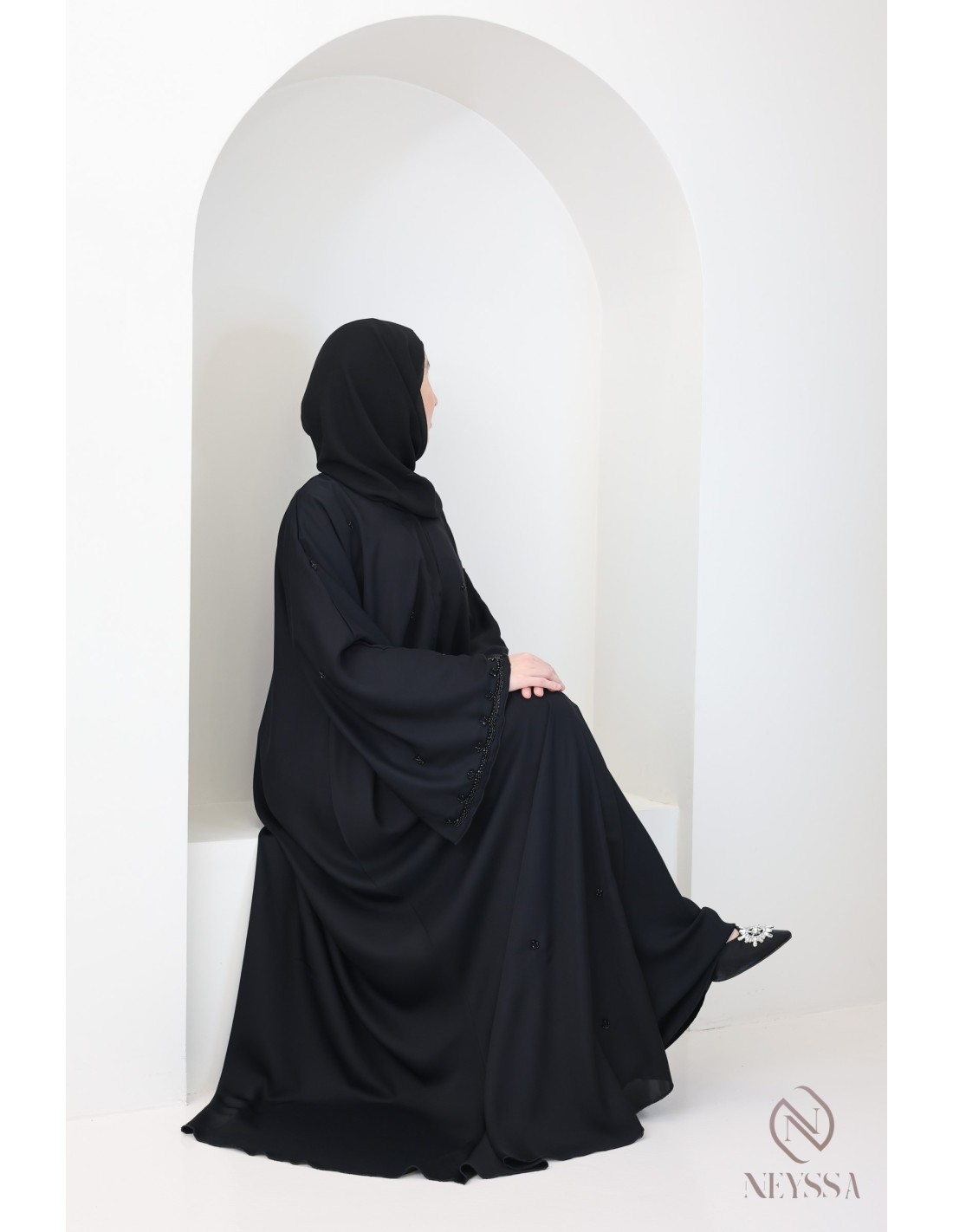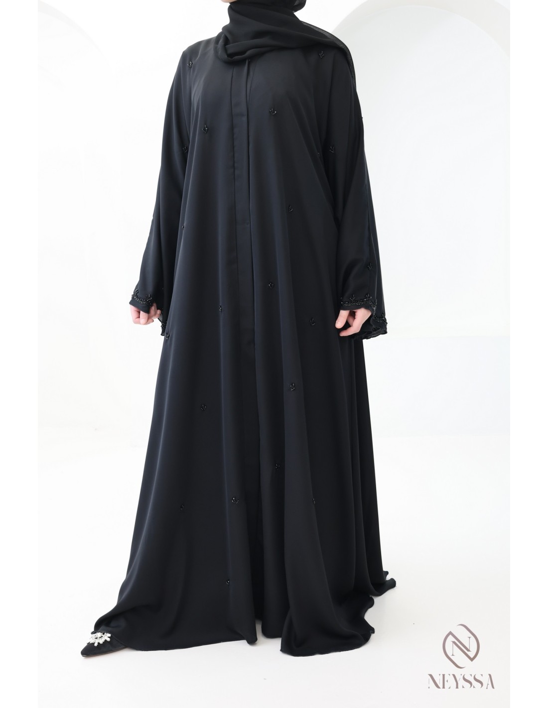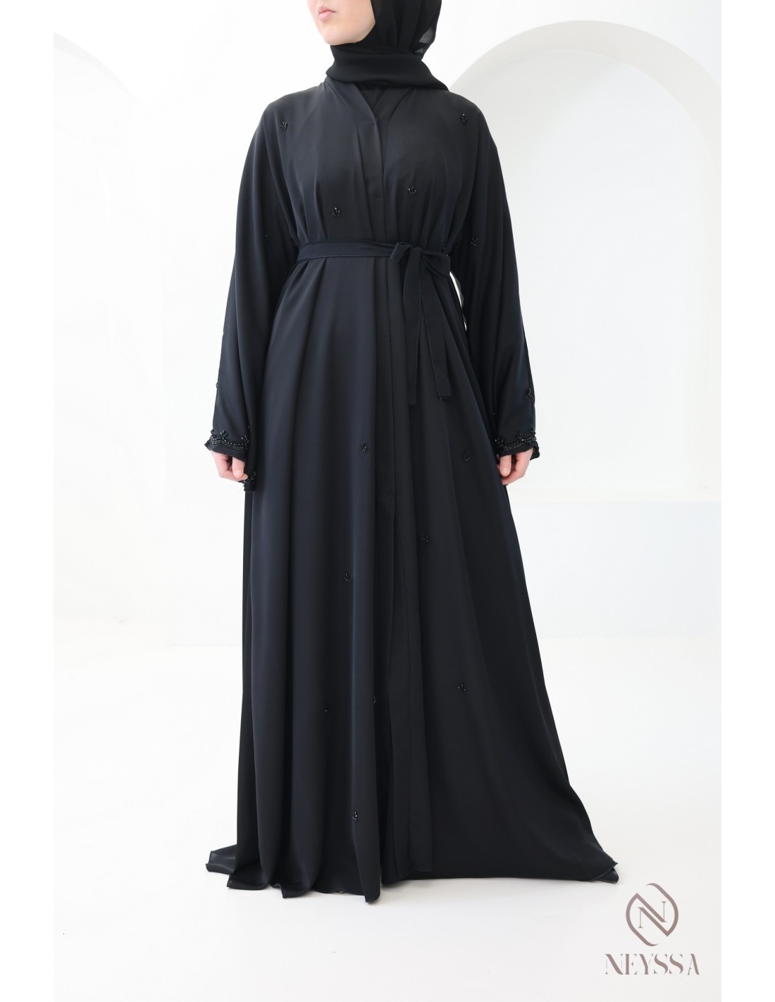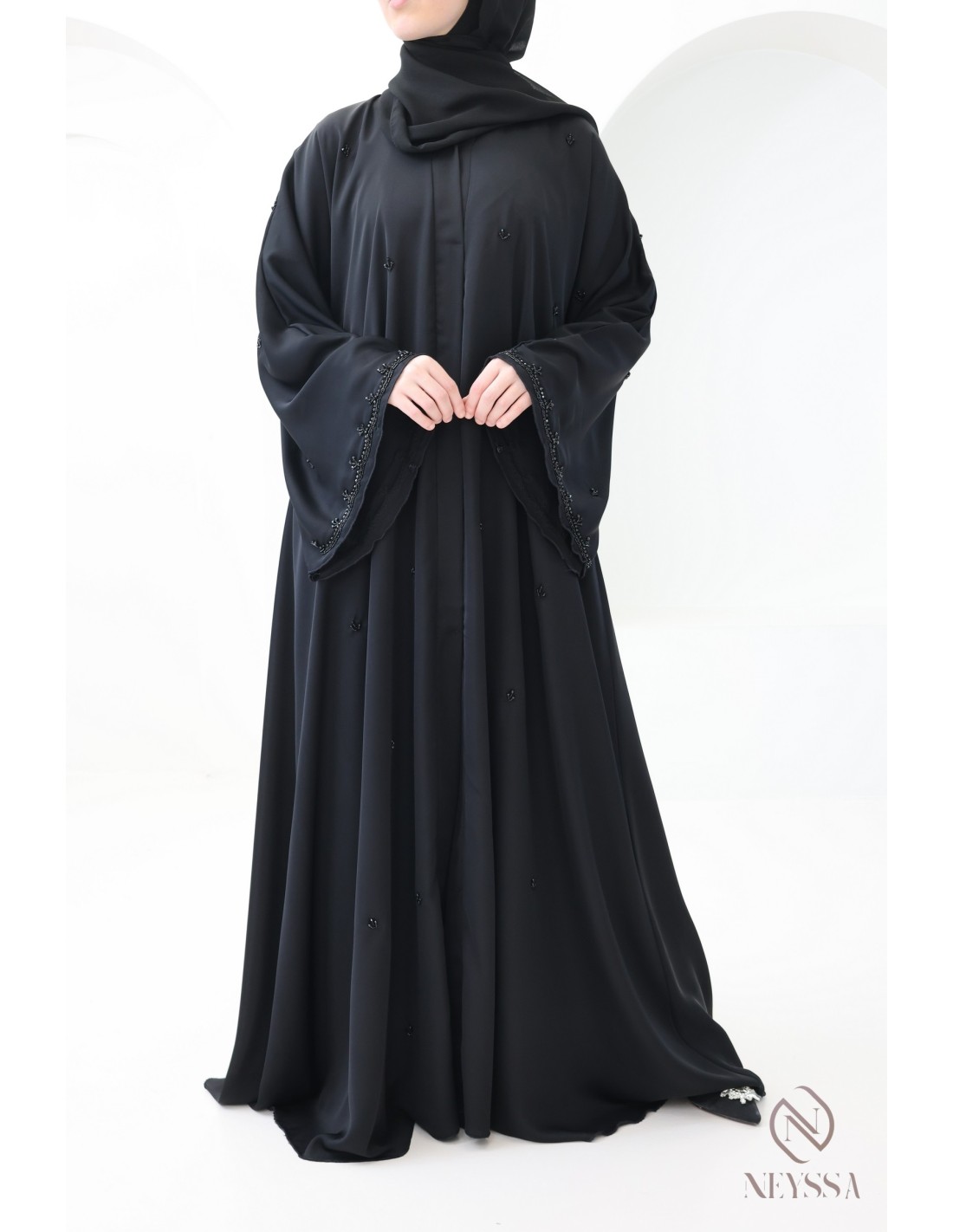 Abaya Dubaï Kimono coupe évasée noir avec perles brodées
