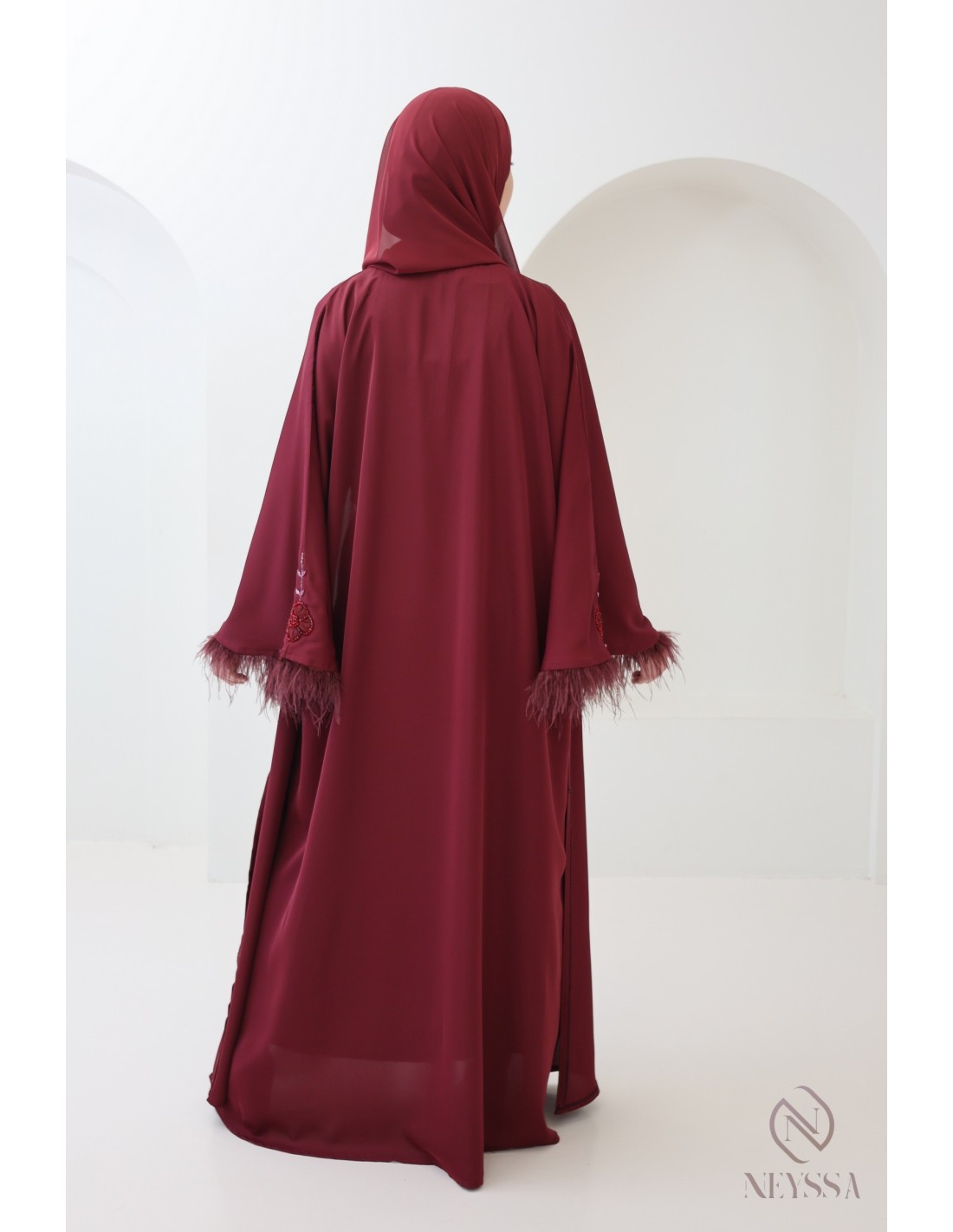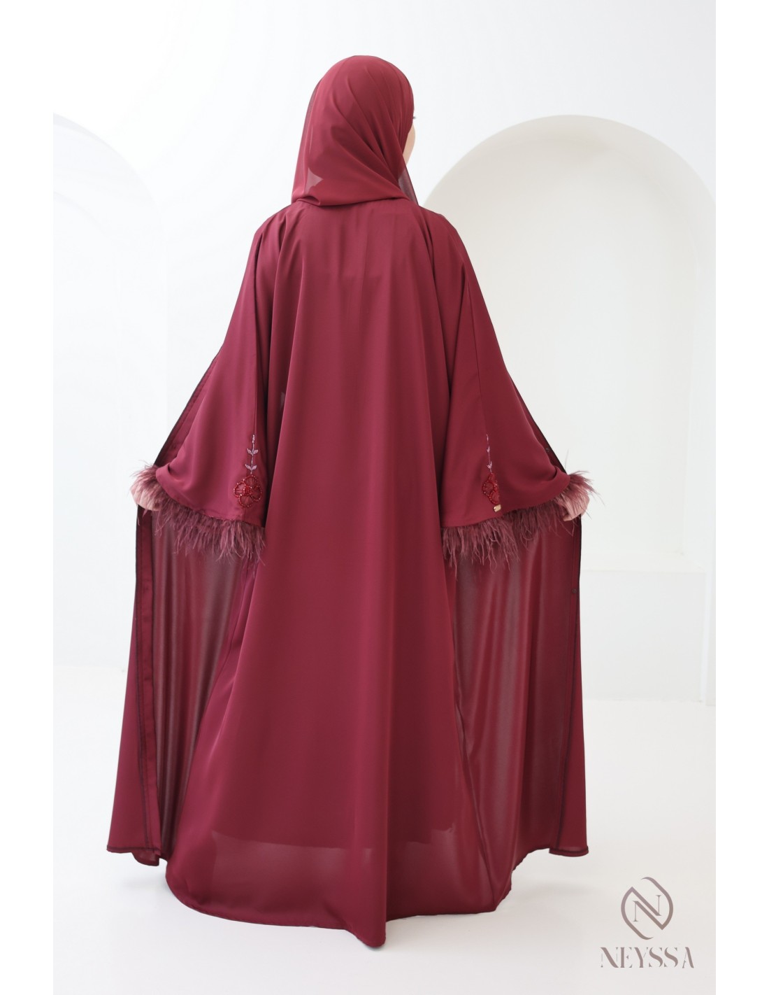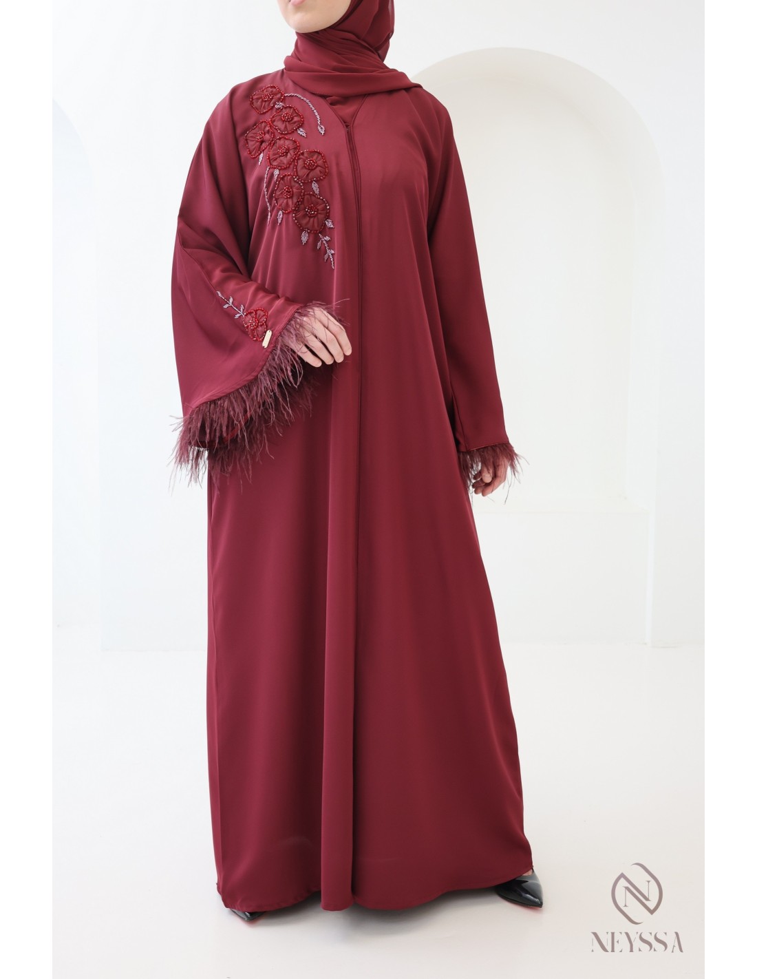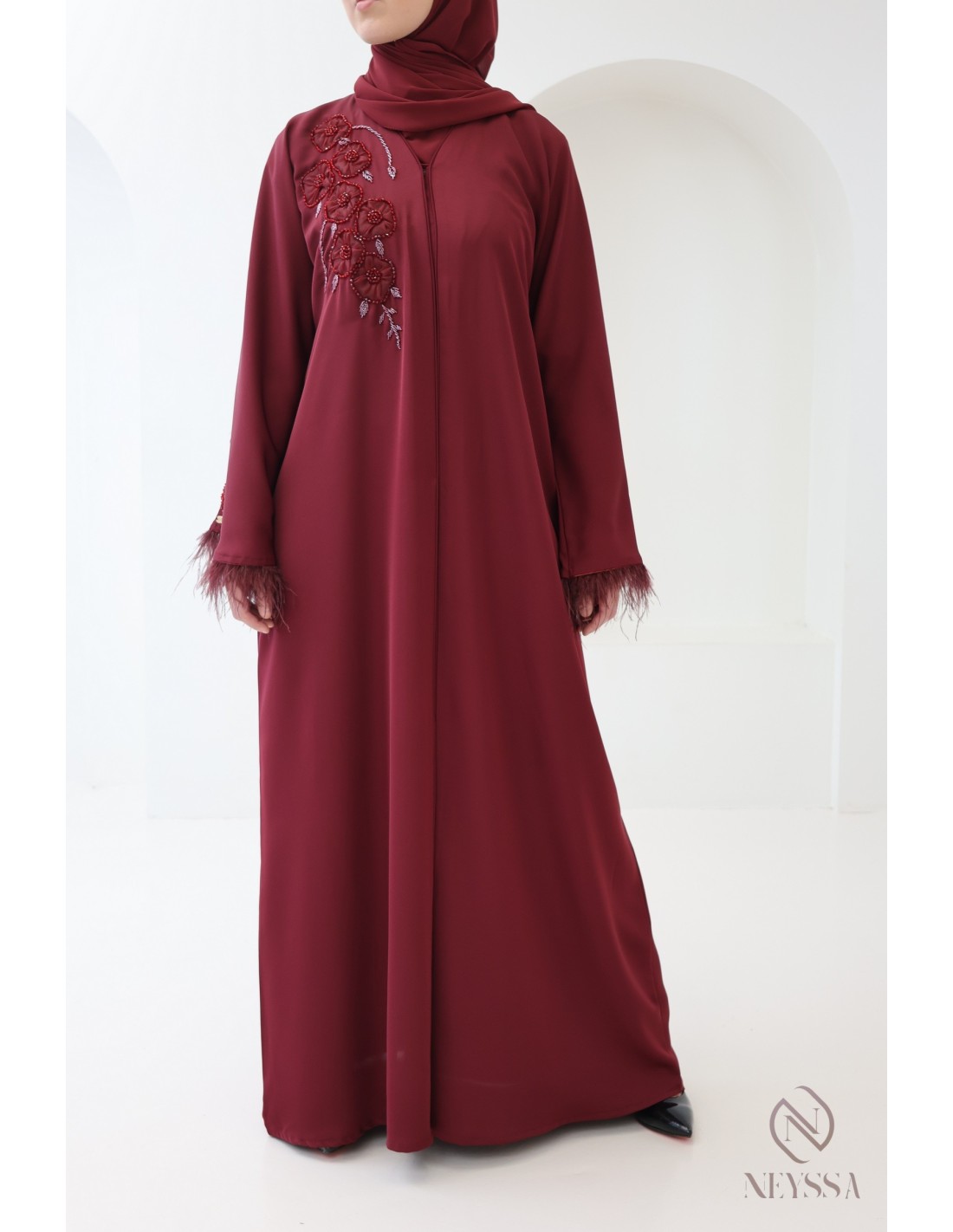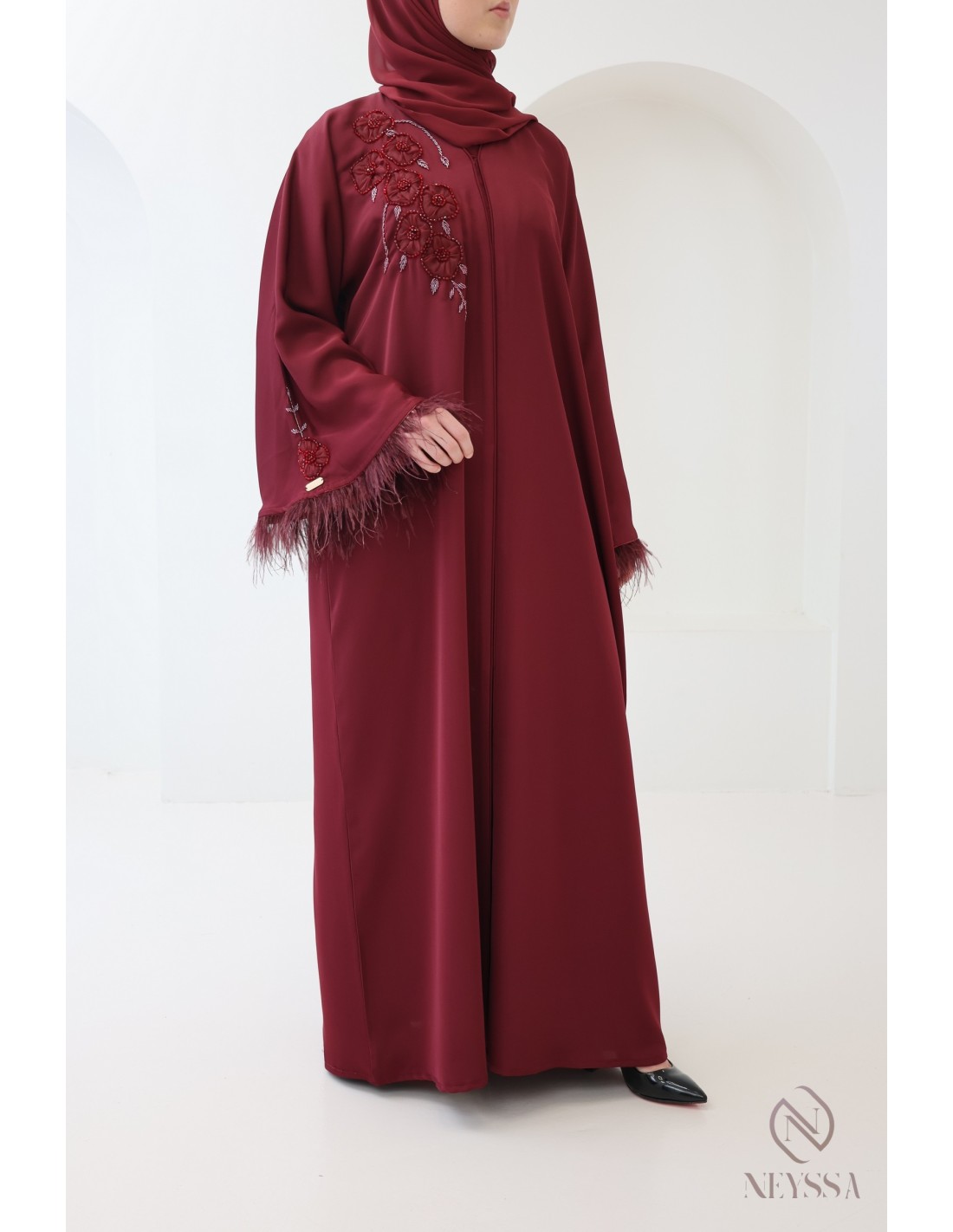 Abaya Dubaï perlée avec plumes Royal Velvet Bordeaux