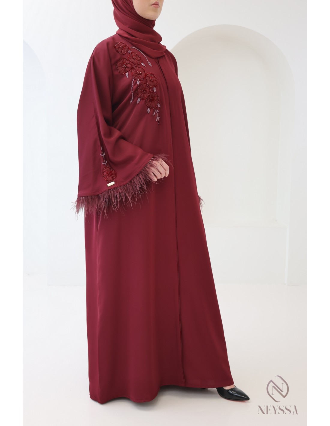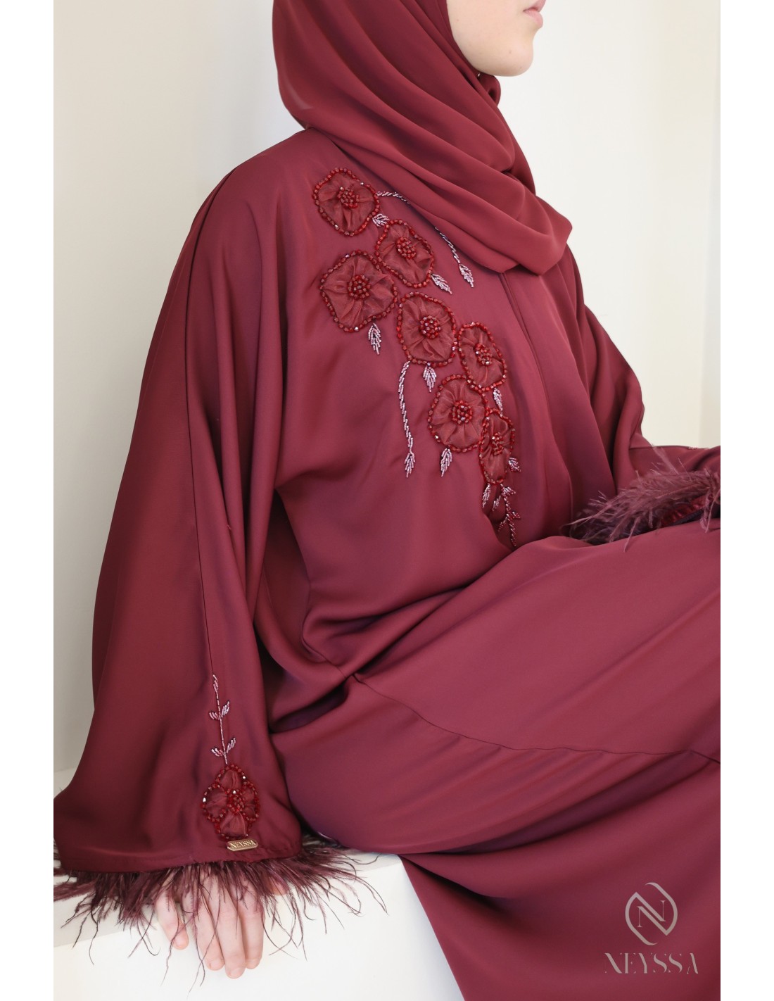 Abaya Dubaï Bordeaux femme détails plume