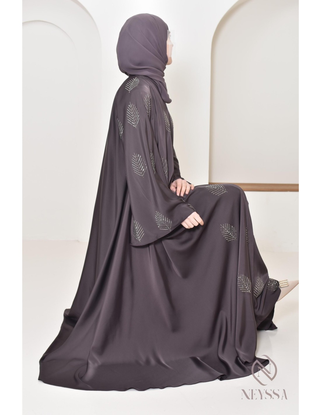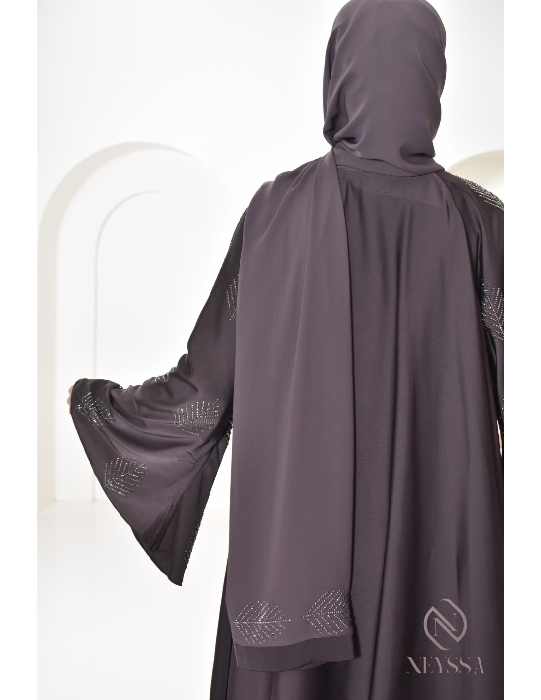 Finitions parfaites personnalisées : Une plaque dorée Neyssa est cousu au niveau de la manche de la abaya.