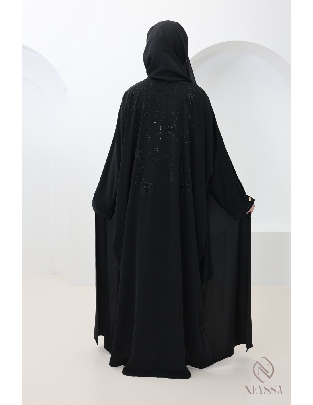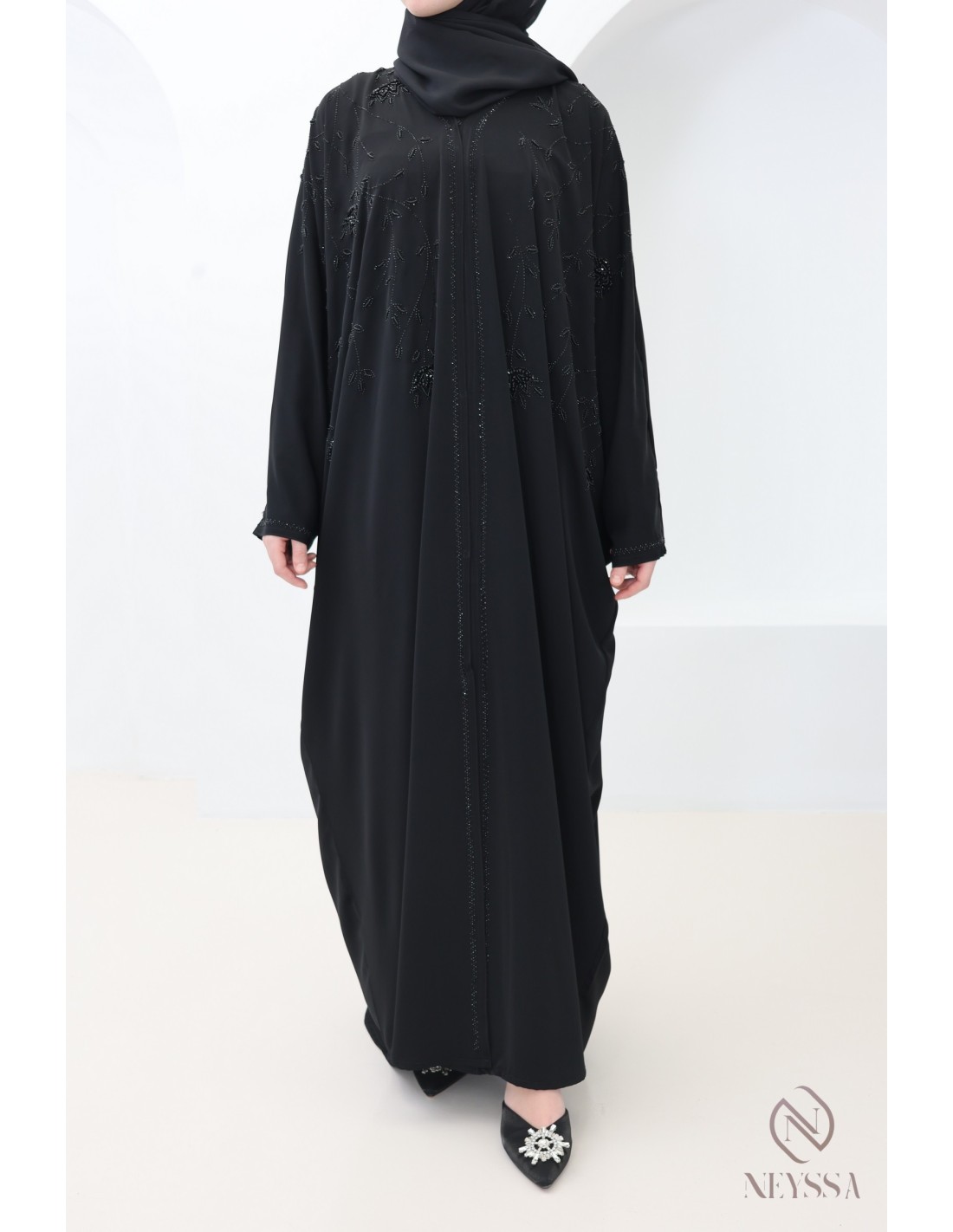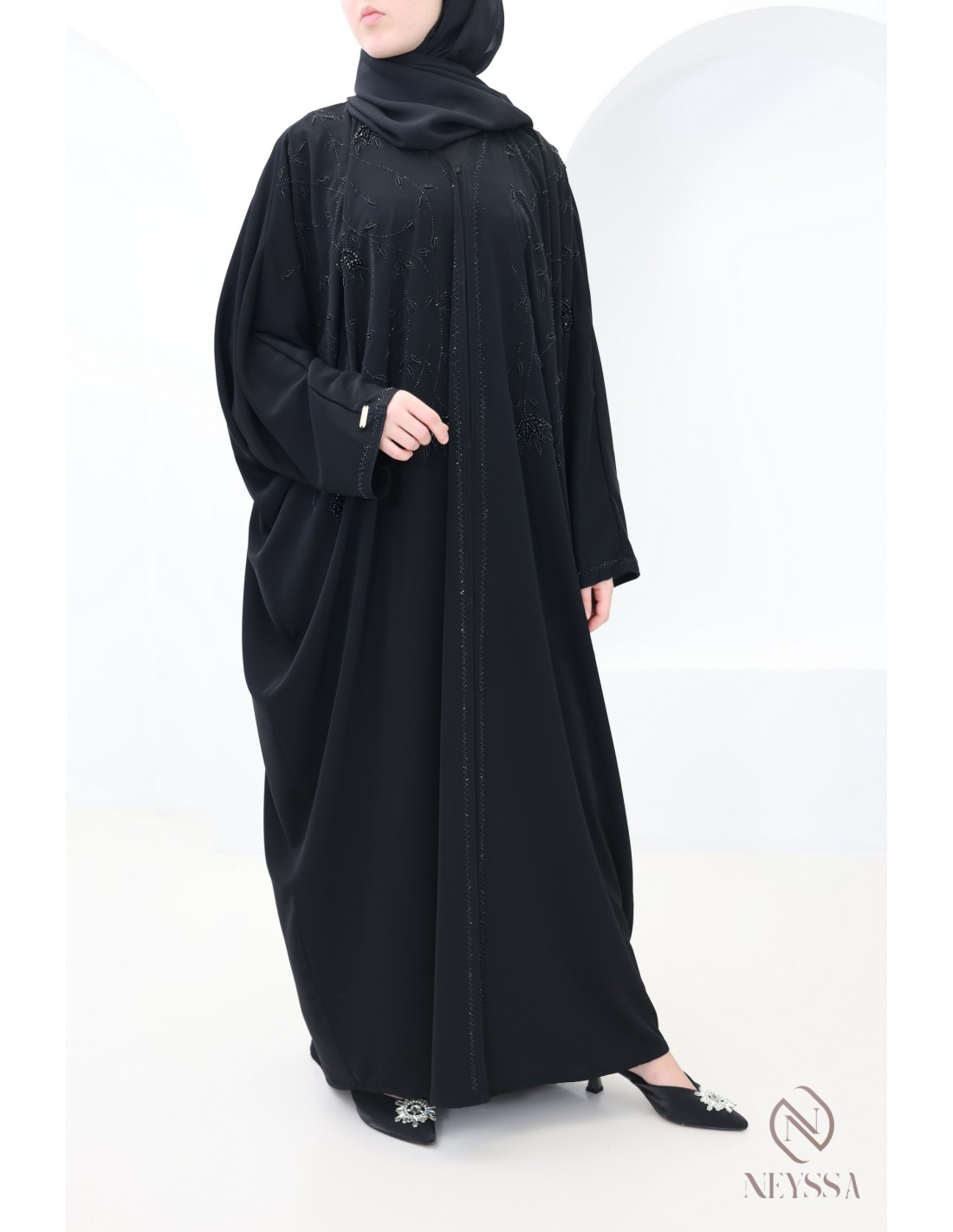 Cette abaya est confectionnée dans un soie de Nidah ornée de strass et perles avec son voile assorti.