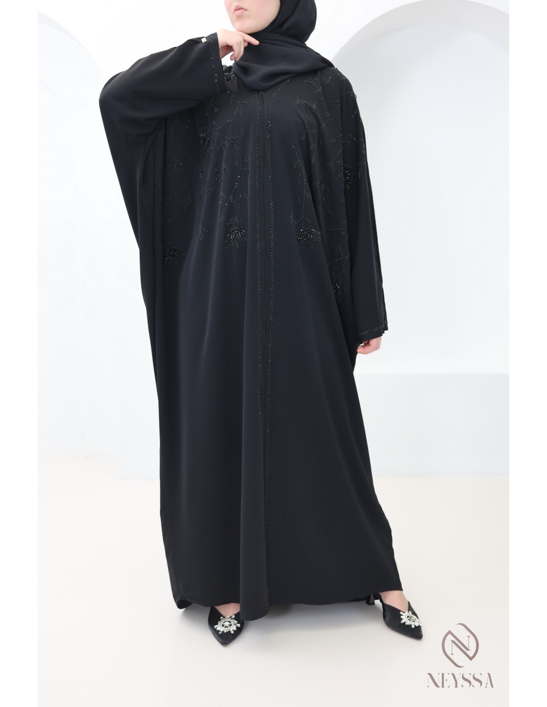 Vous allez craquer pour la Abaya Dubaï kimono coupe papillon avec strass et perles :