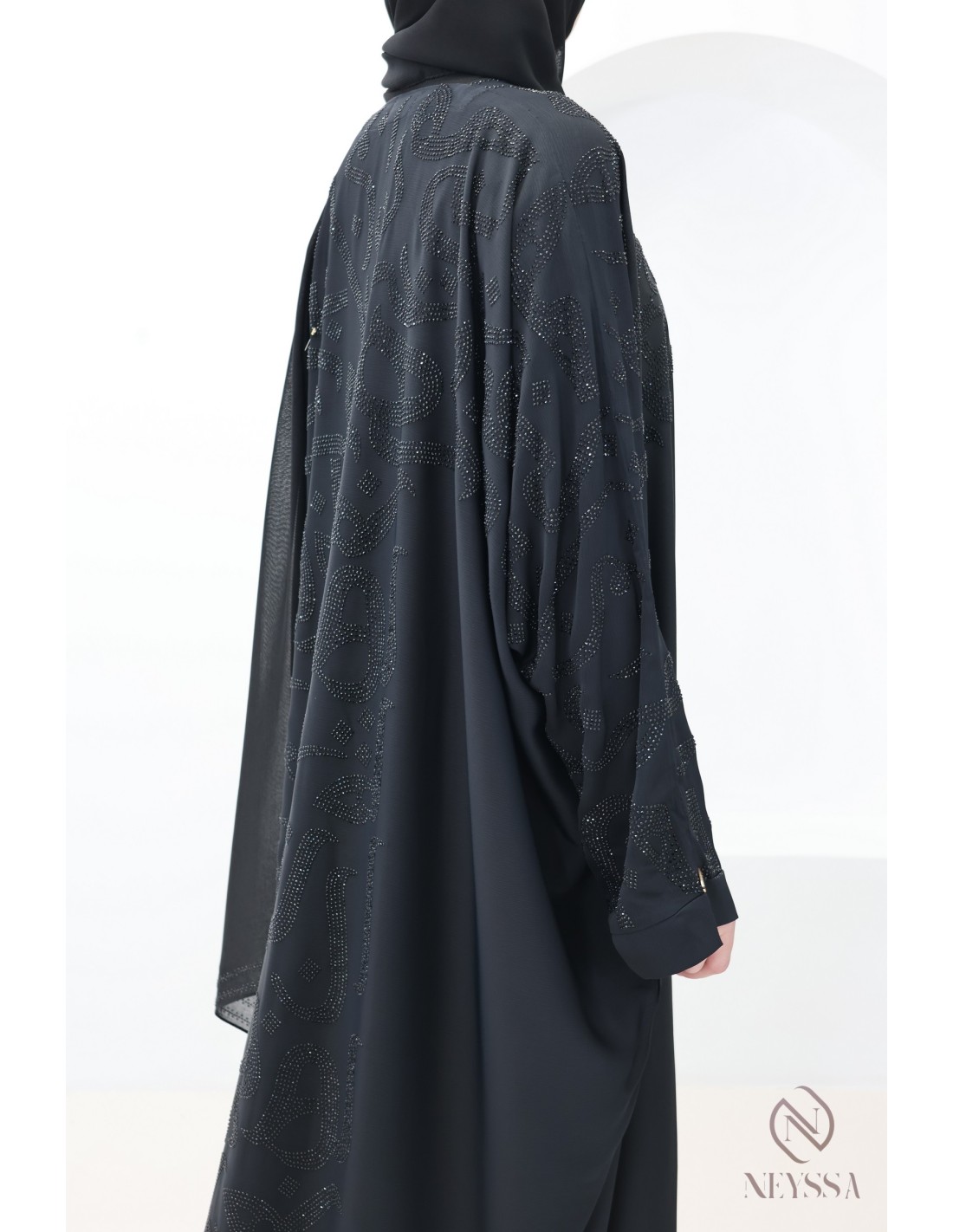Cette abaya est confectionnée dans un soie de Nidah ornée de strass avec son voile assorti.