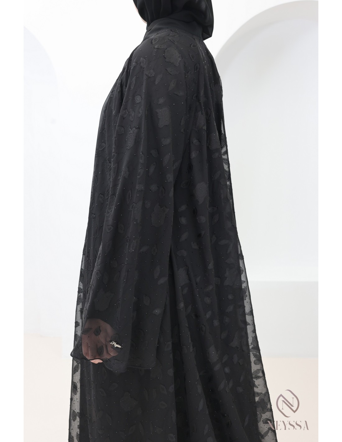 Vous allez craquer pour la abaya kimono Dubaï noire en mousseline à motifs avec strass style khaleeji :