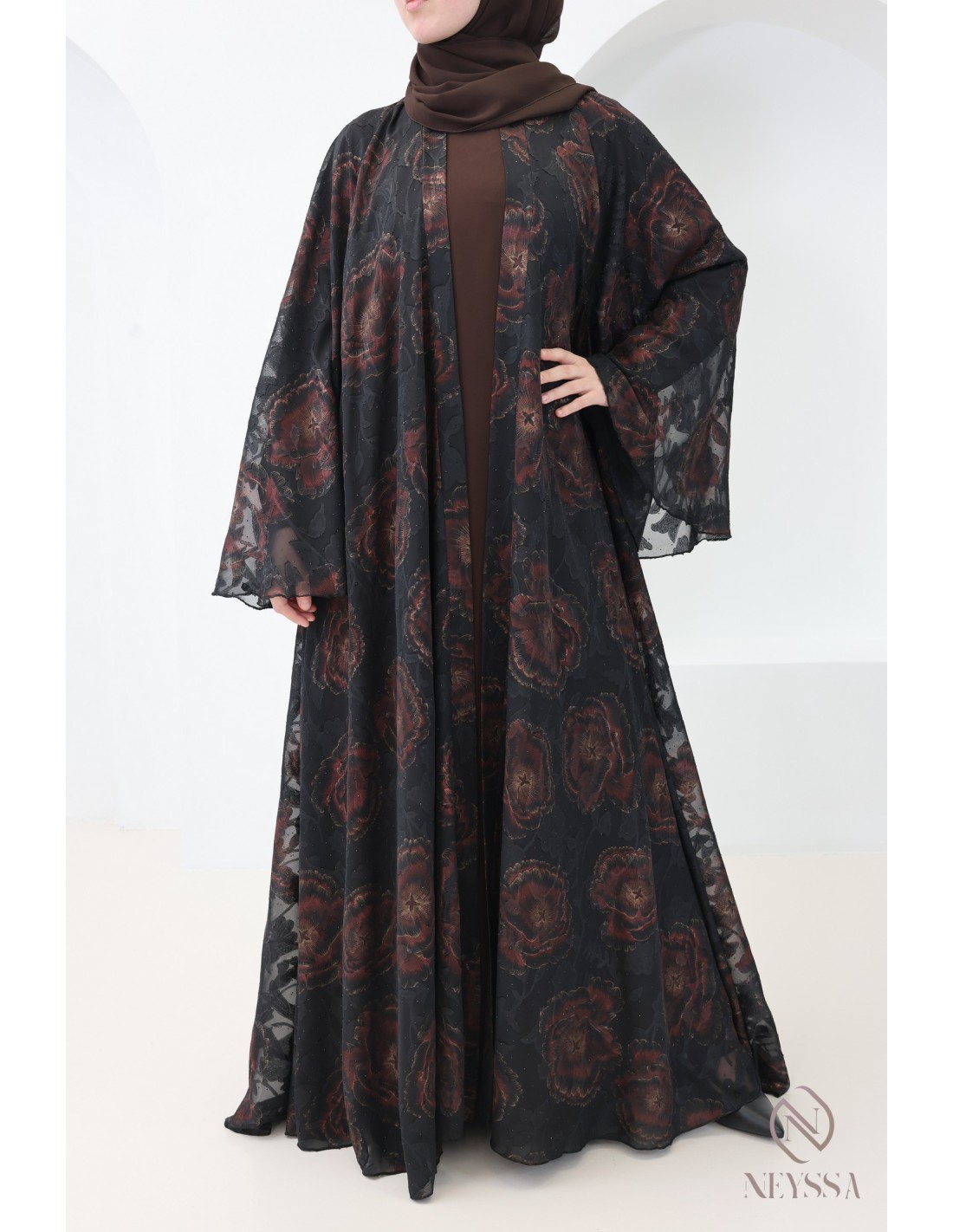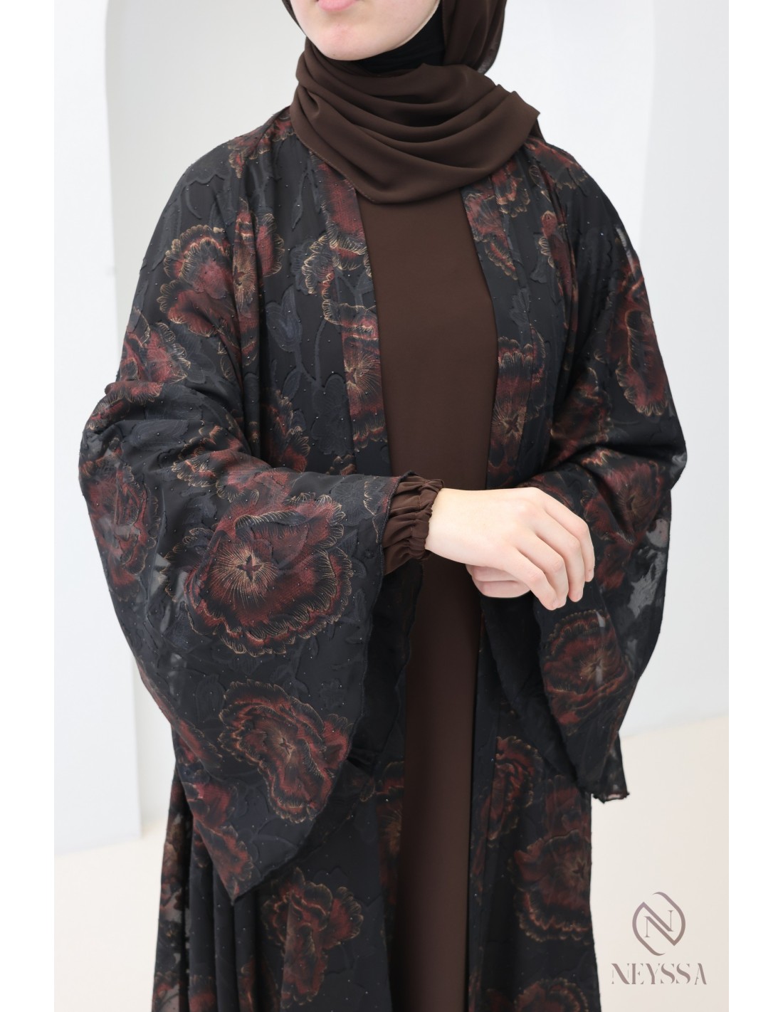 Abaya Dubaï kimono chocolat avec broderie florale + strass : Neyssa Confection Aïd
