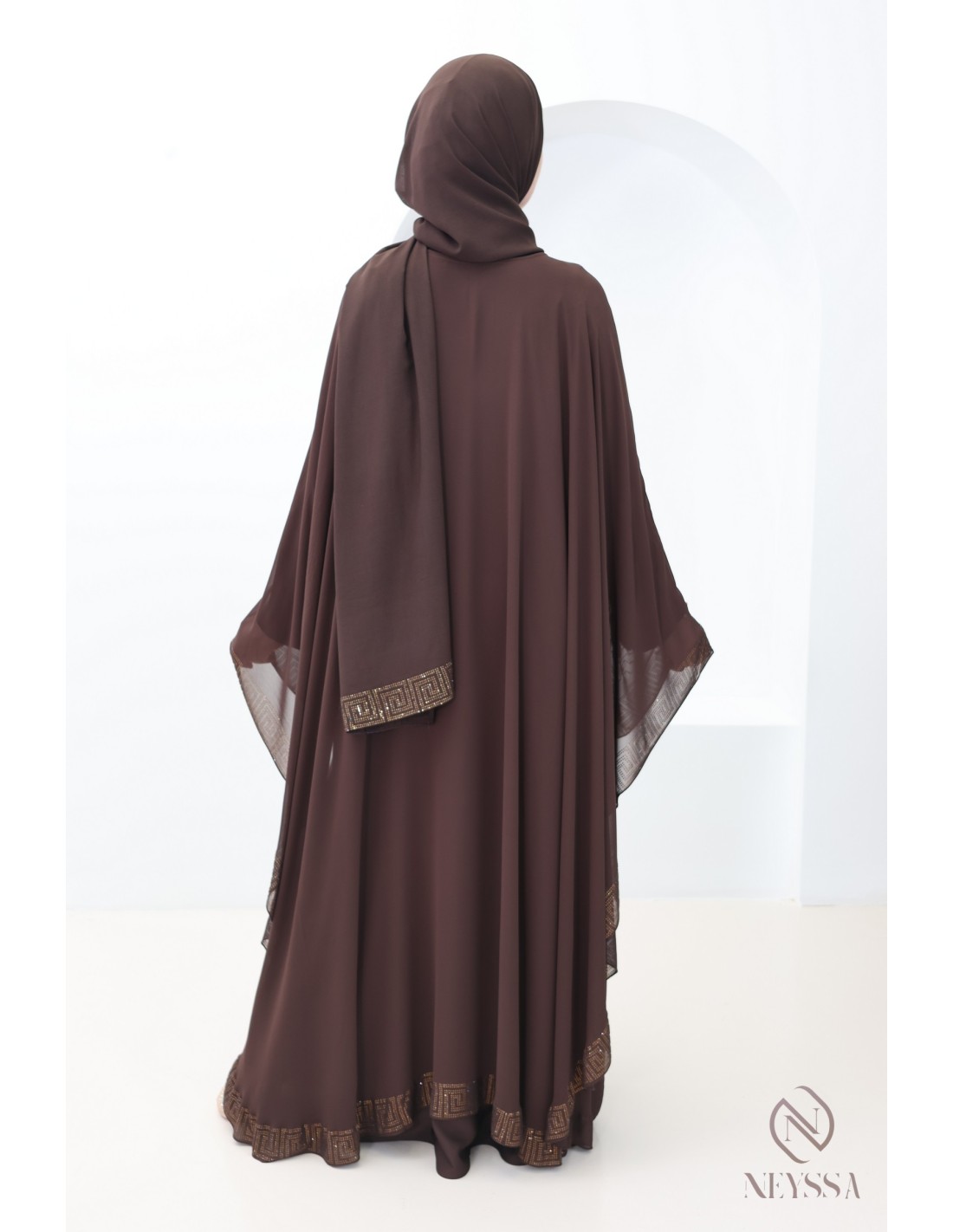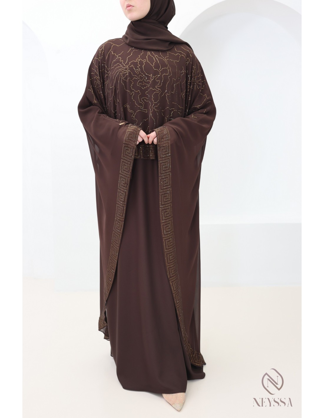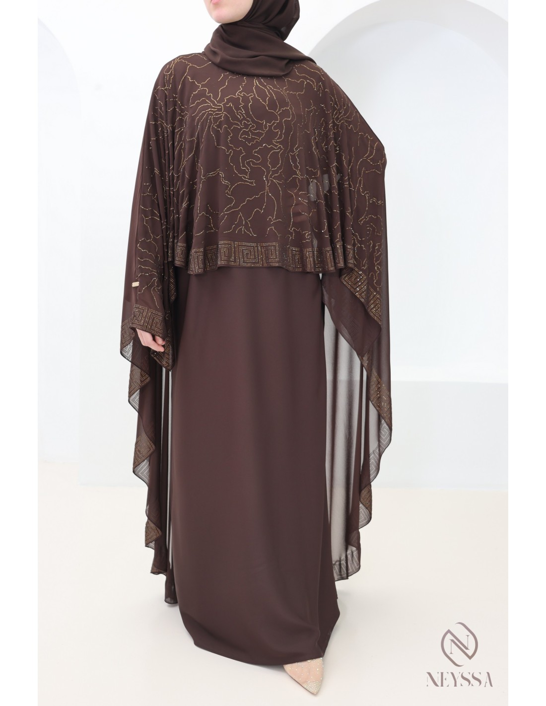Abaya Dubaï cape en mousseline a strass chocolat femme aïd