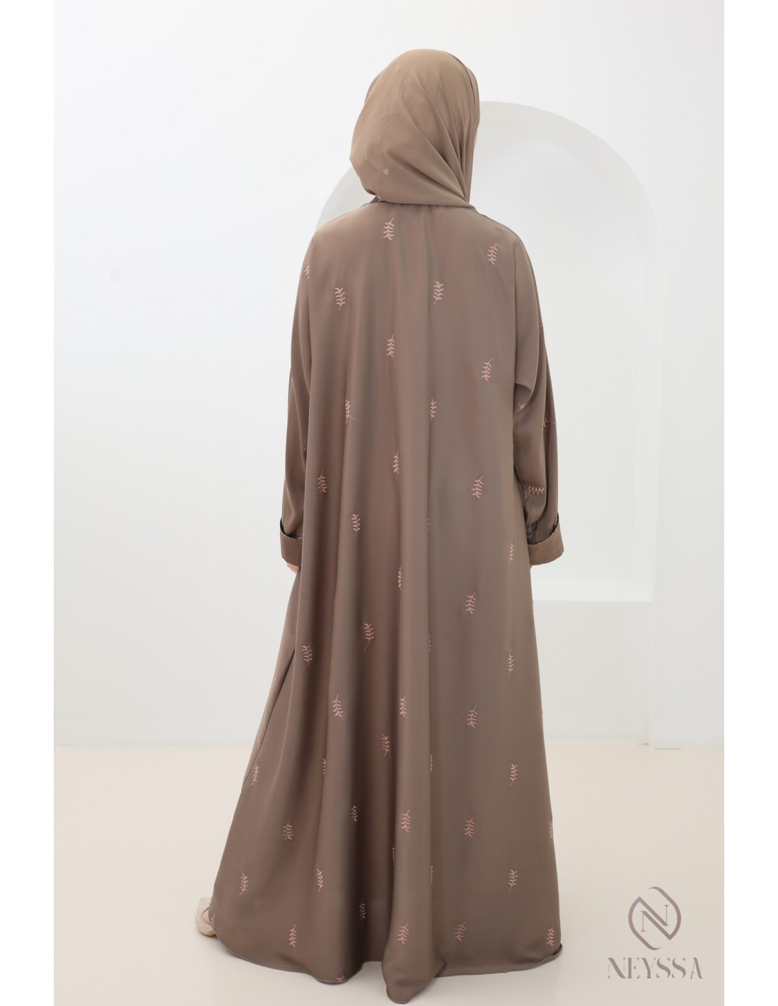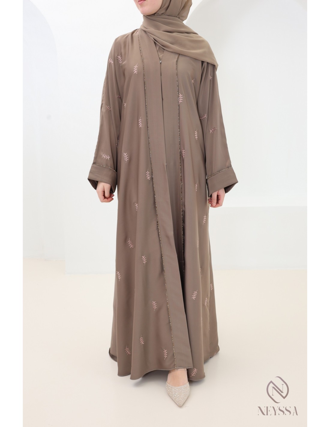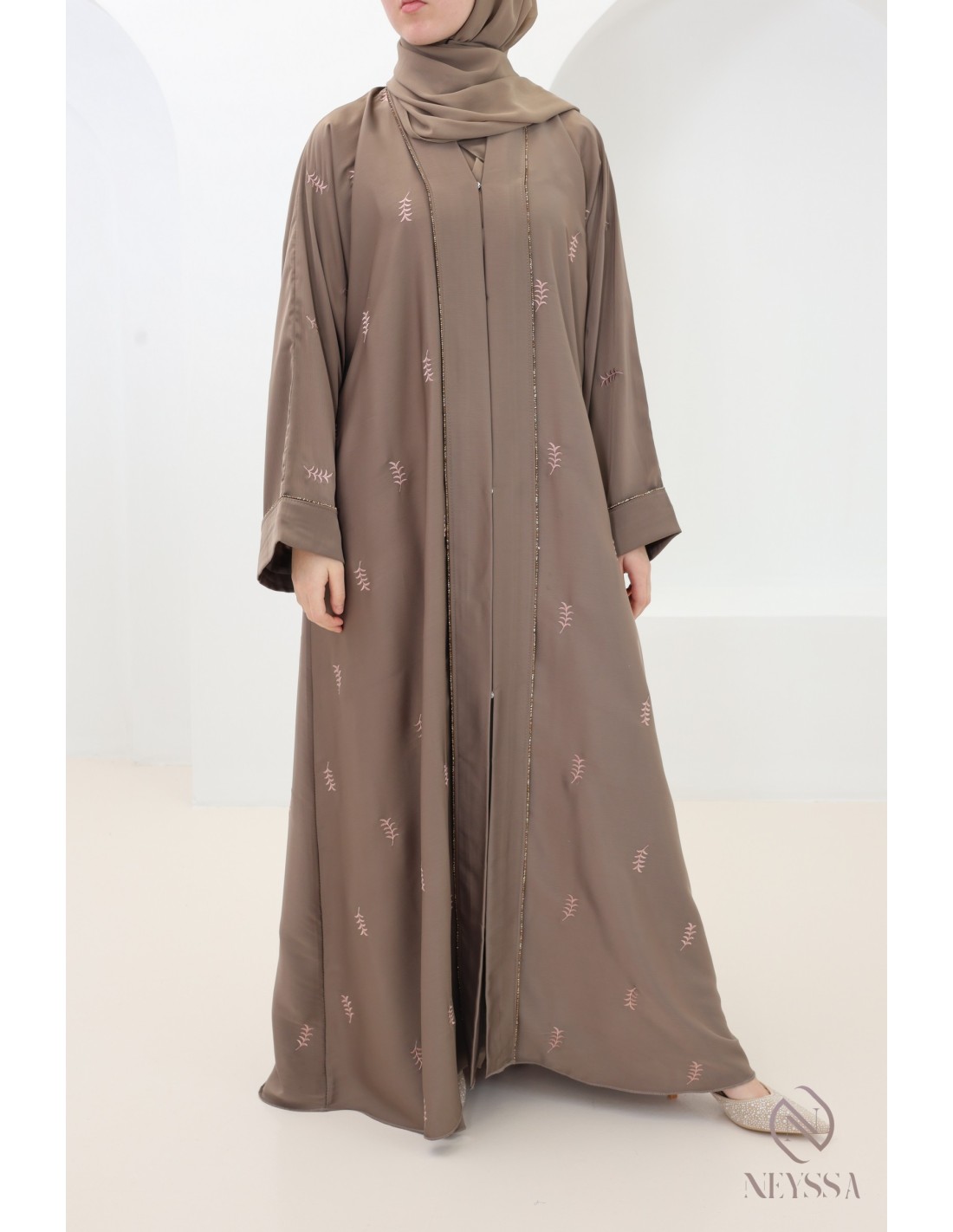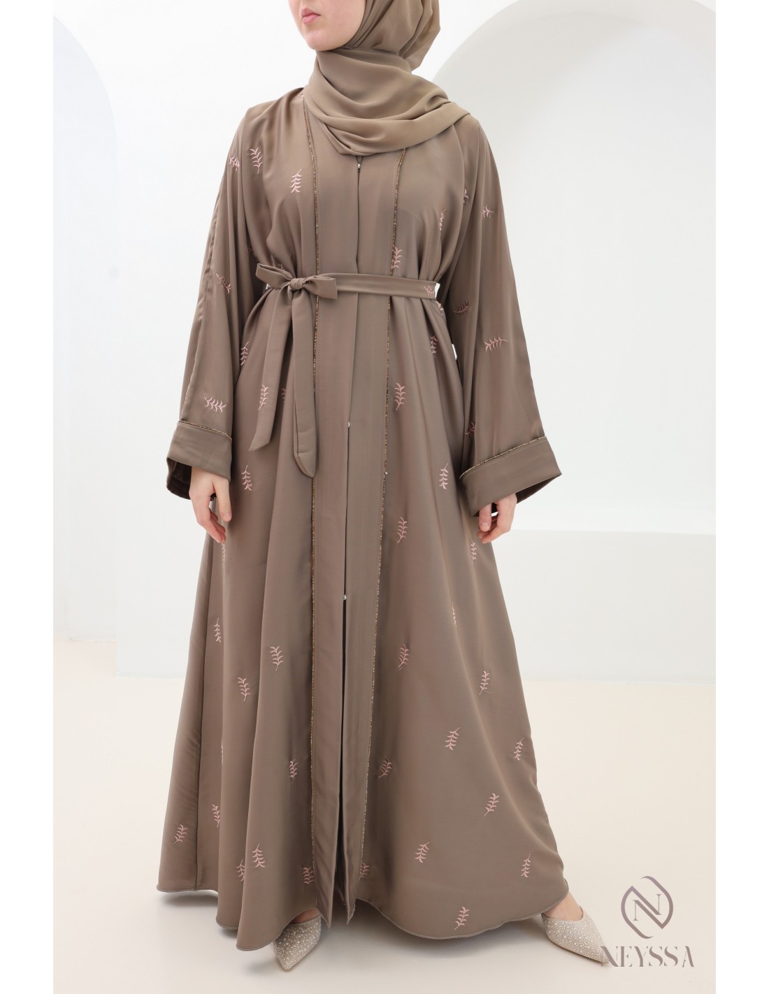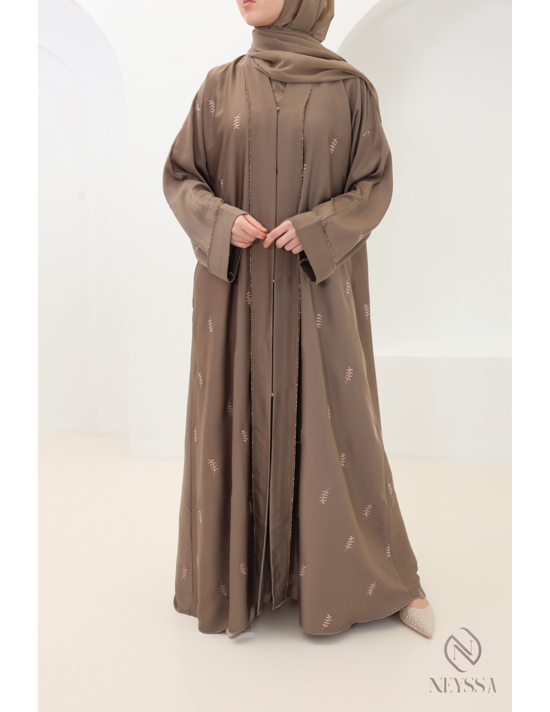 Abaya Dubaï kimono taupe avec broderie feuilles et strass femme hijabi