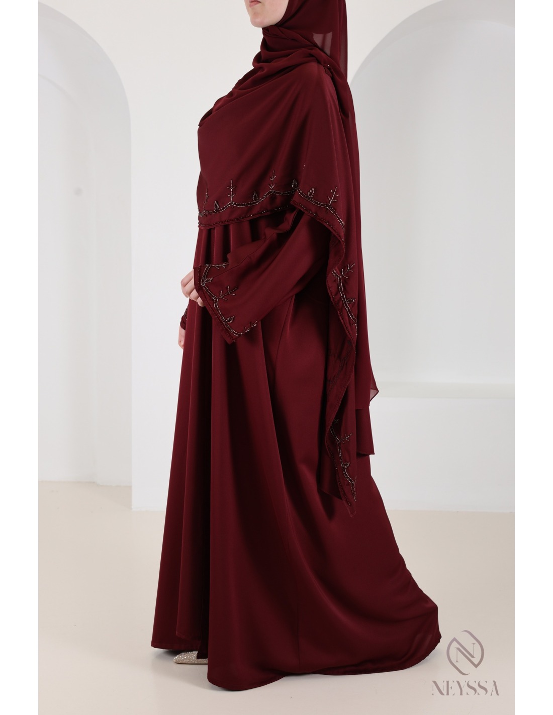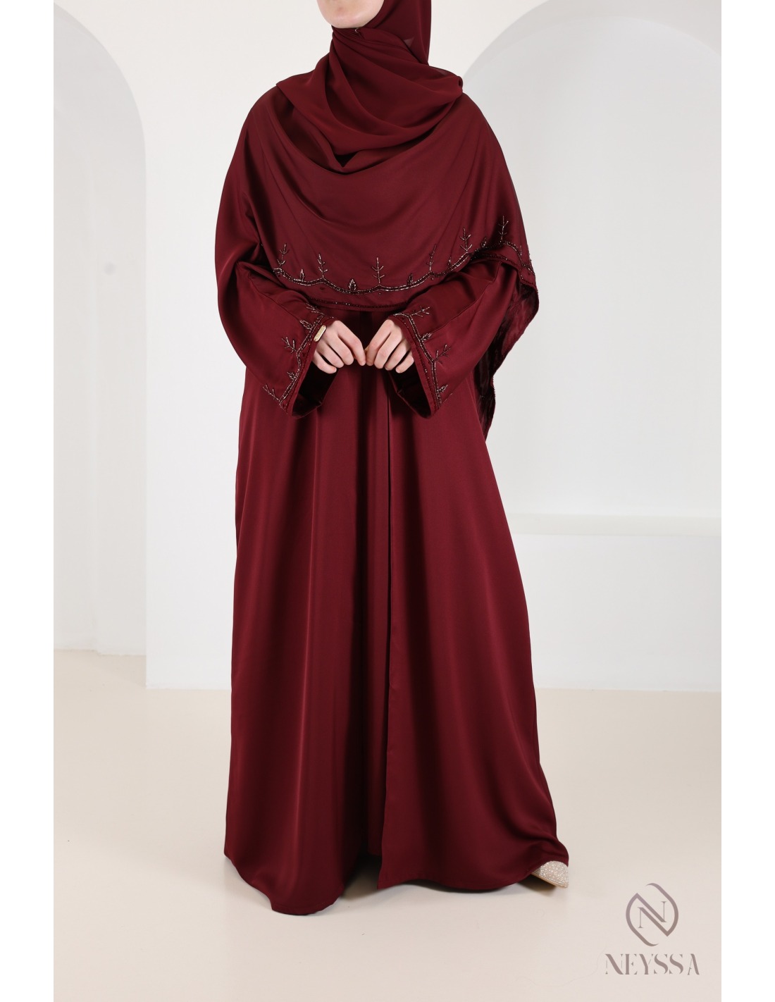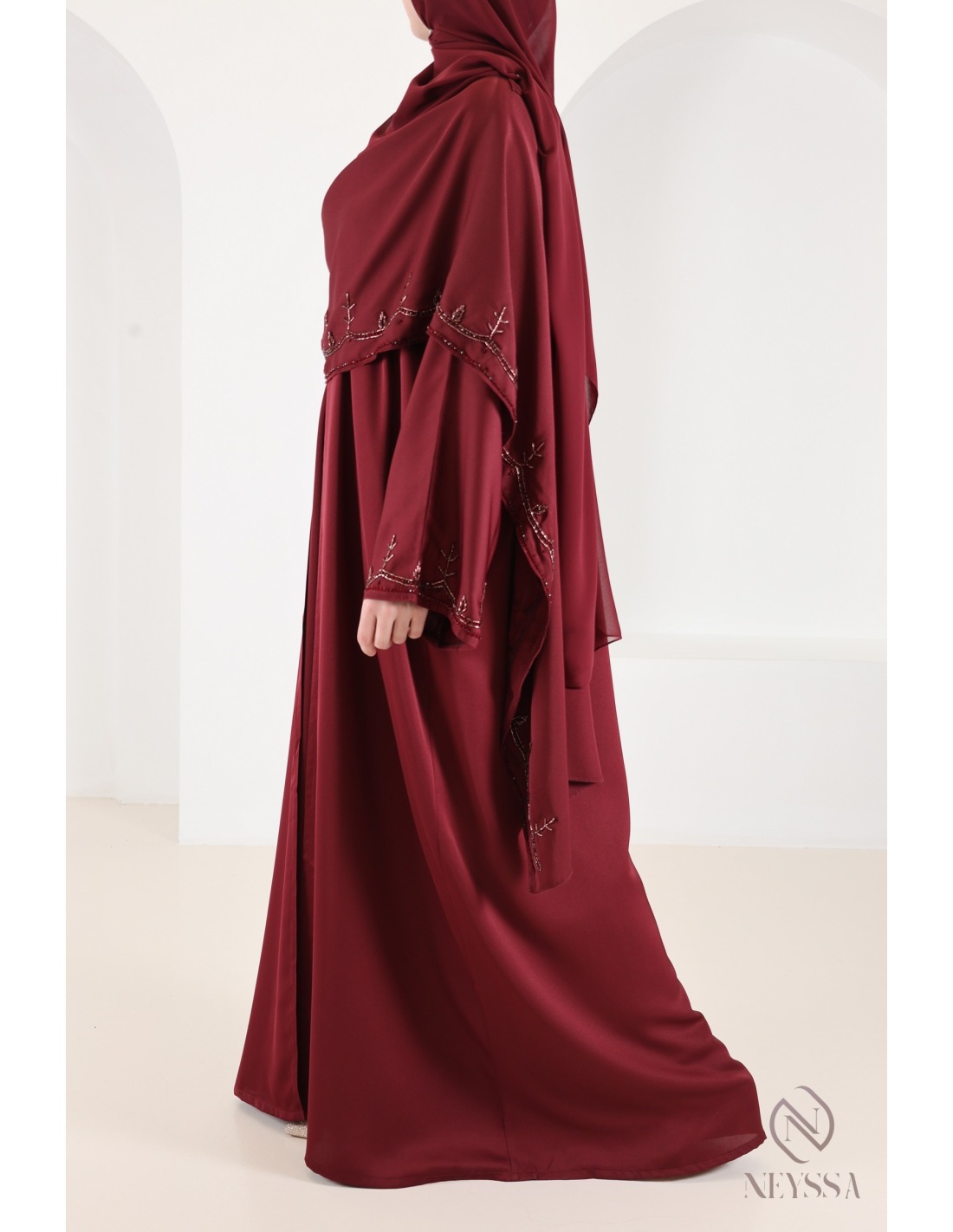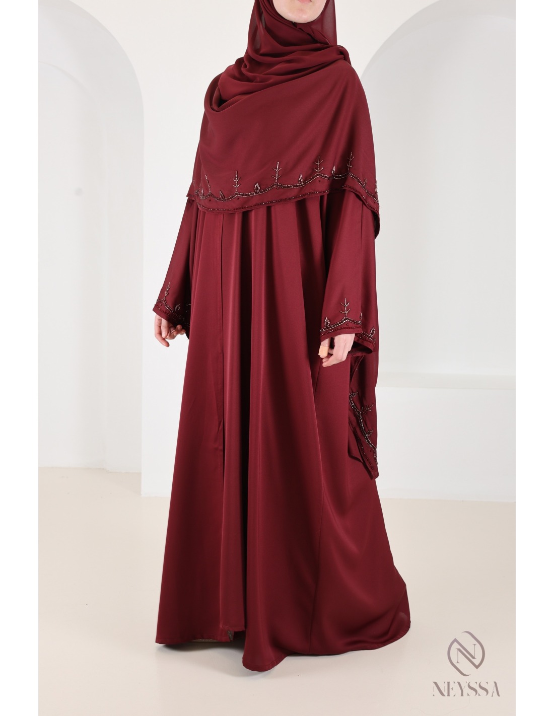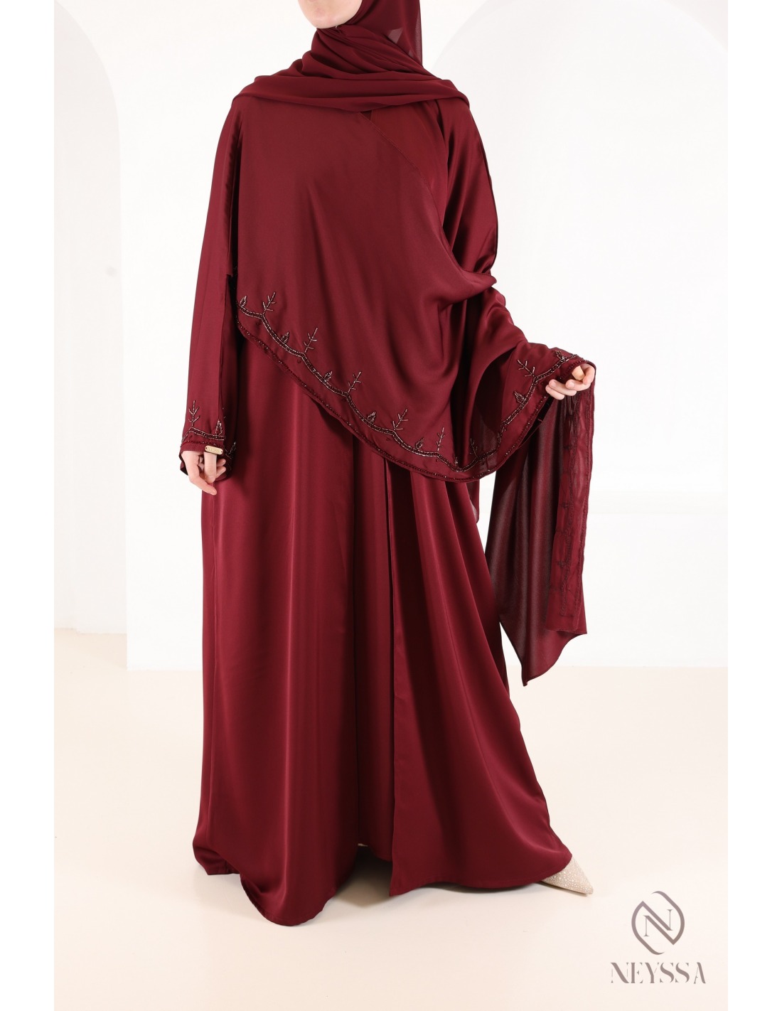 Abaya Dubaï kimono Bordeaux perles brodées avec cape en Nidah : style khaleeji