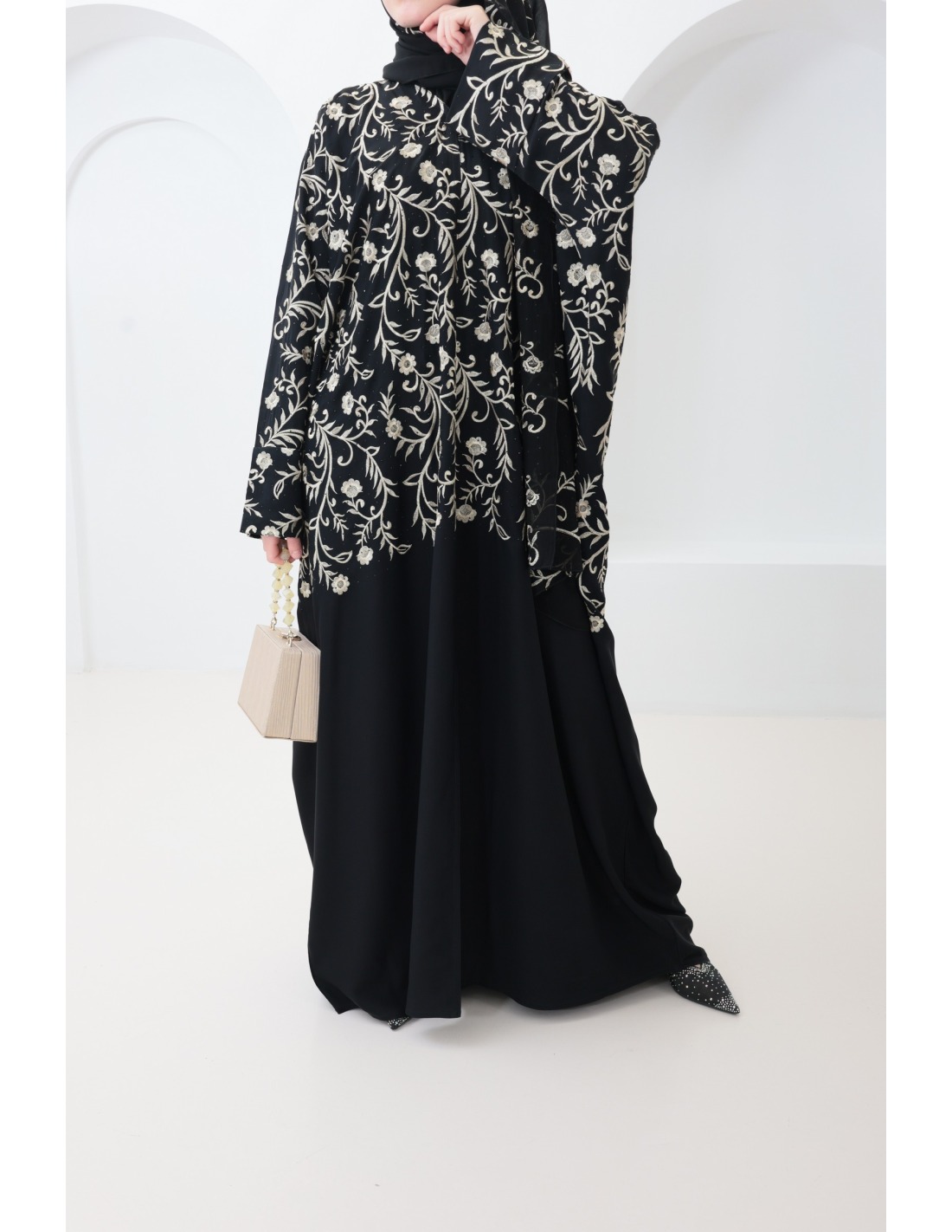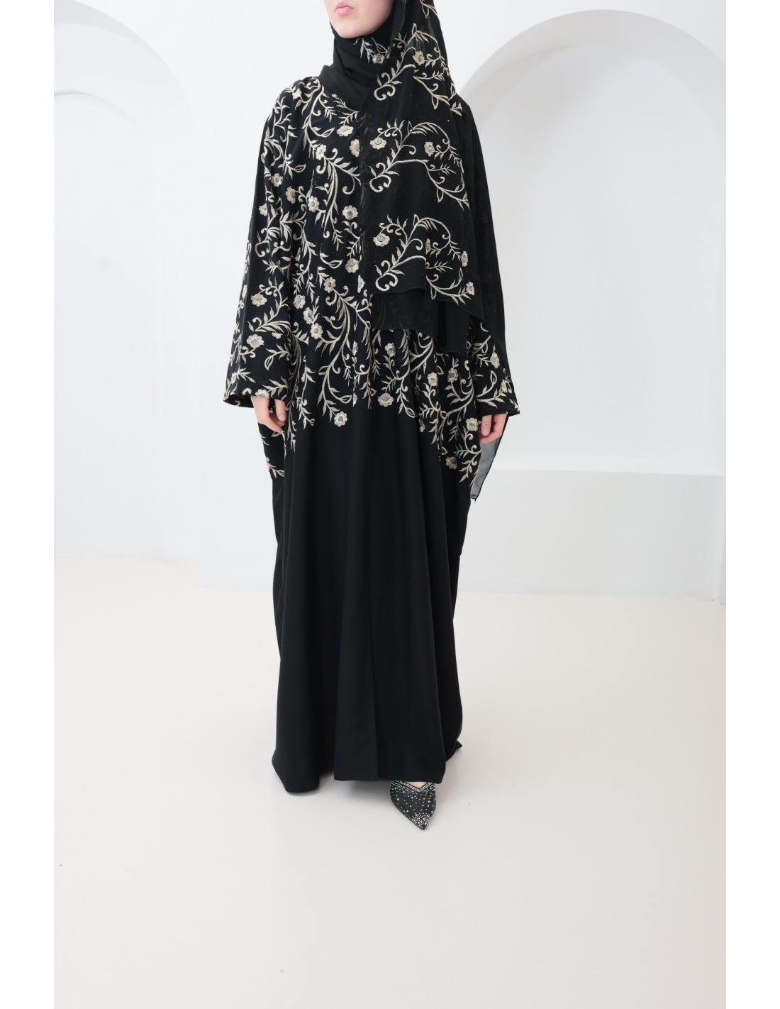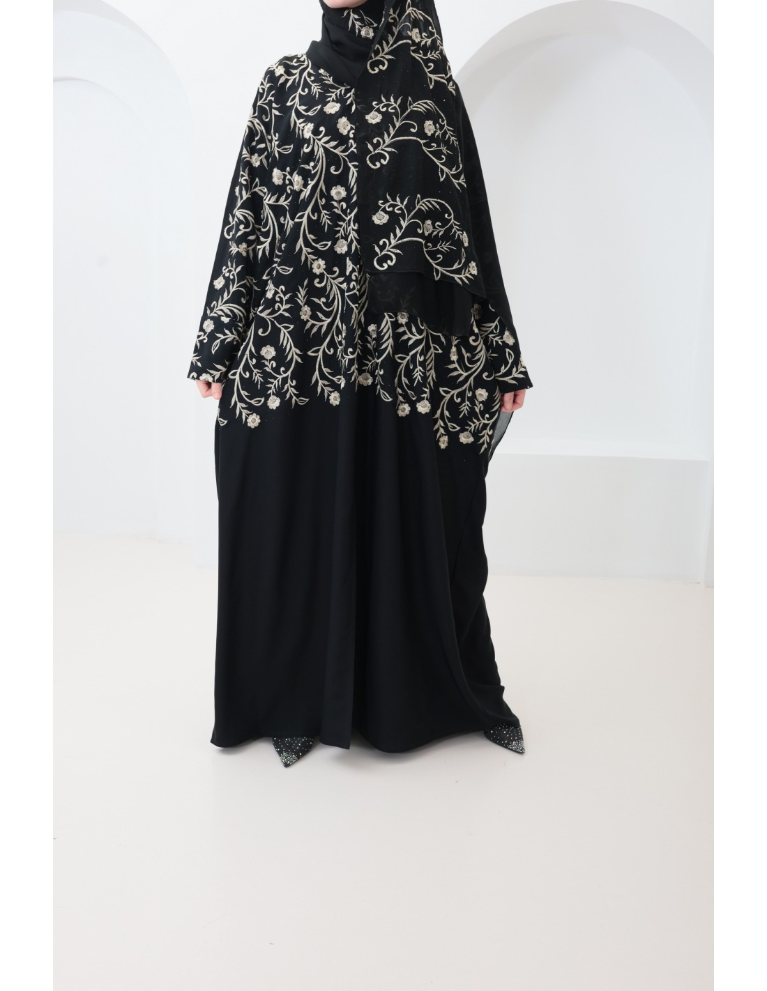 • Hijab fourni : Complétez votre look avec le hijab sur lequel il y a des détails de broderie, offert avec cette abaya, pour une coordination parfaite (peut varier en fonction des arrivages)