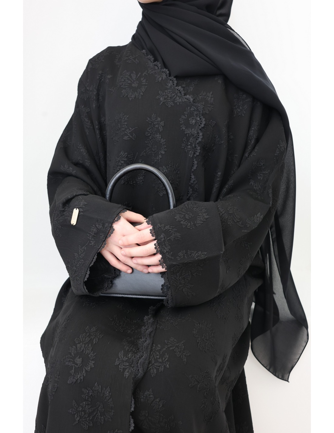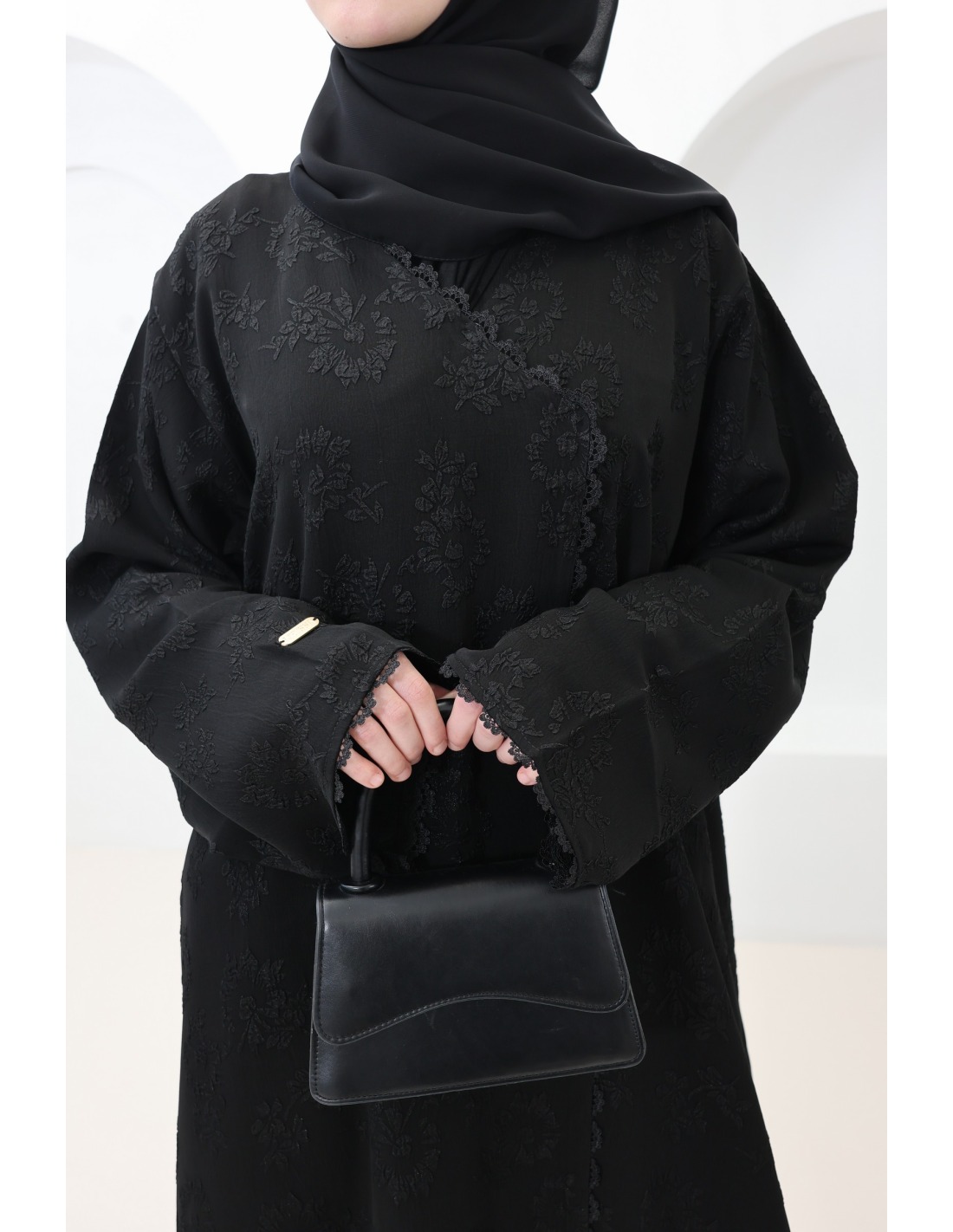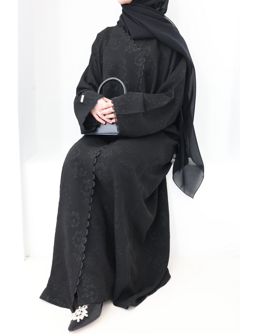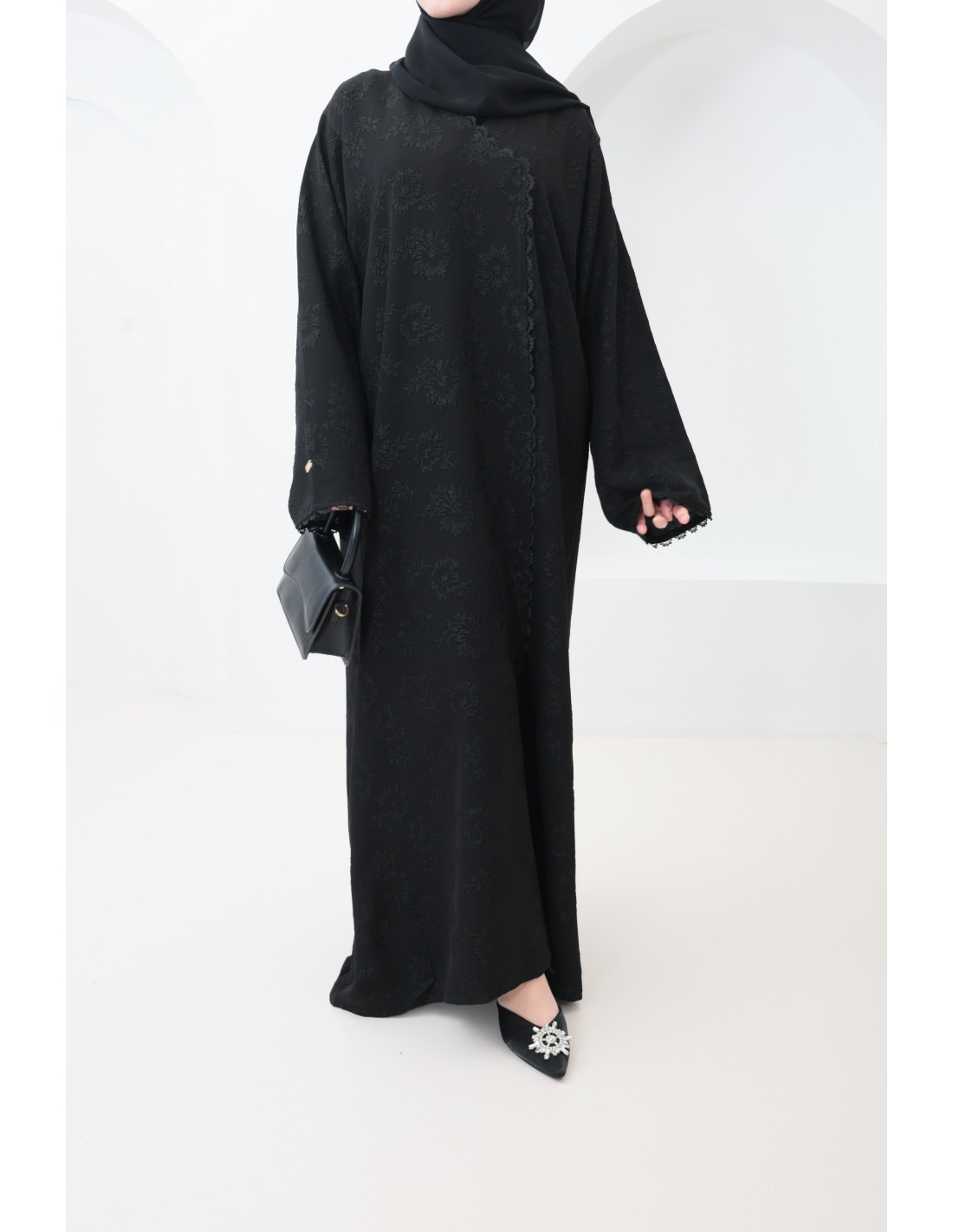 Voici ce magnifique combo abaya brodée en brocart noir aux détails raffinés.