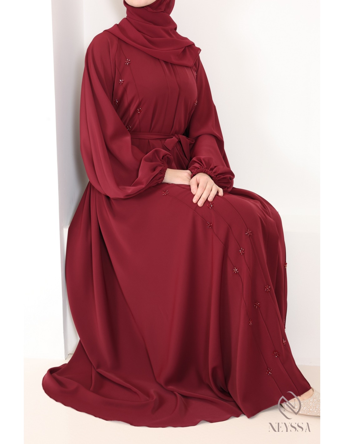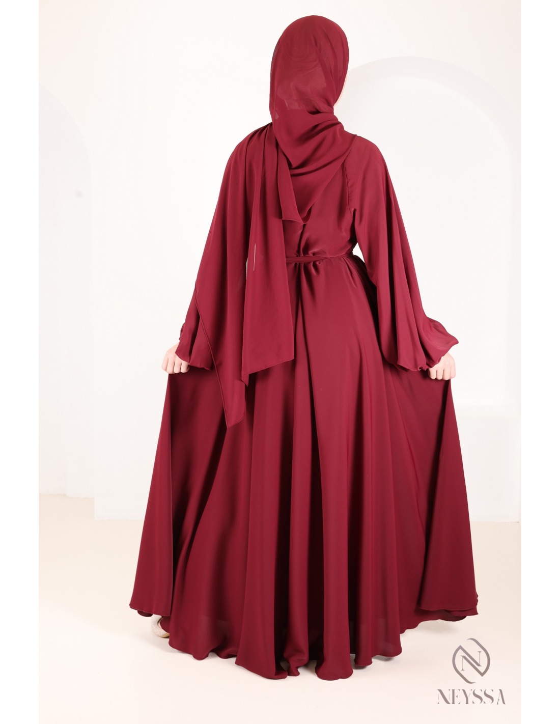 Abaya Dubaï luxe évasée Zyane Bordeaux