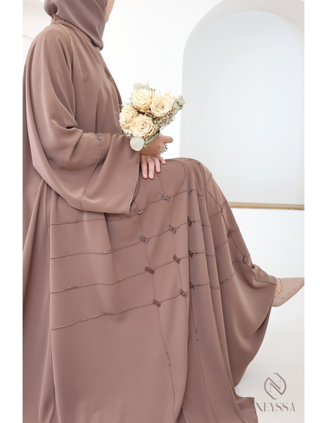 Finitions parfaites personnalisées : Une plaque dorée Neyssa est cousu au niveau de la manche de la abaya.
