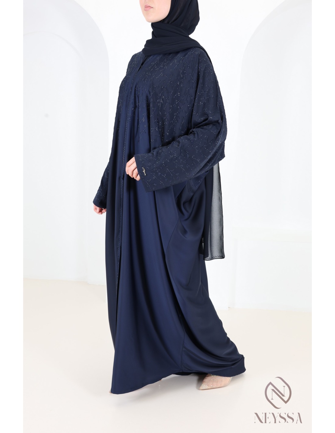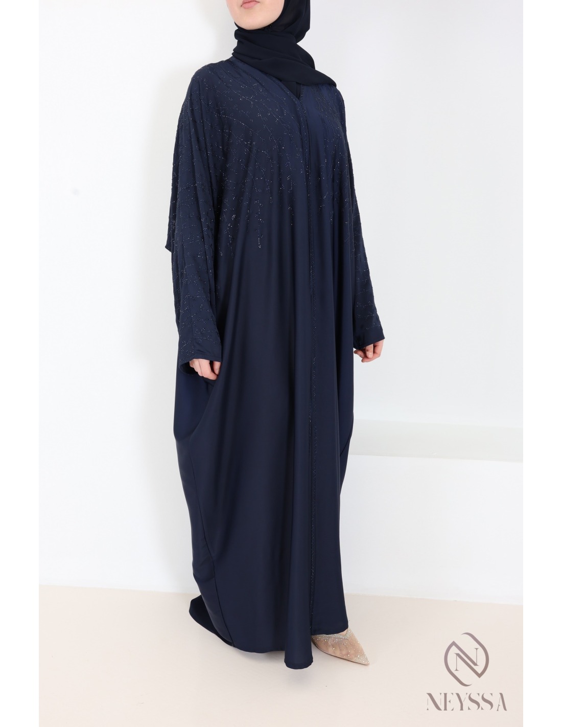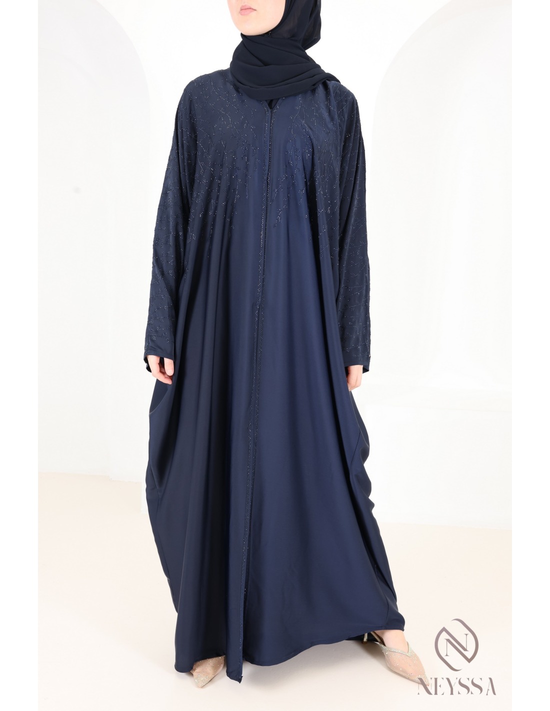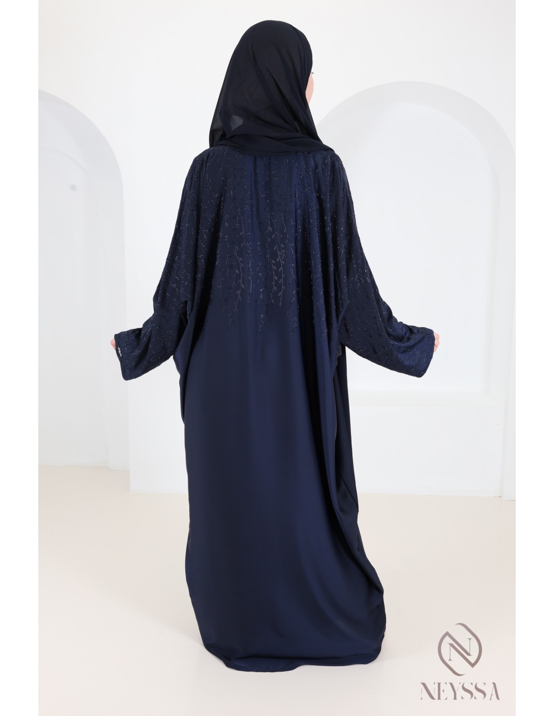 Abaya Dubaï kimono 2 pièces coupe papillon avec strass bleu nuit