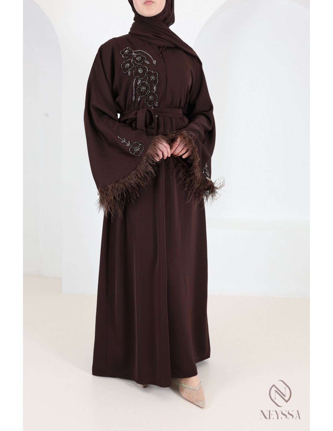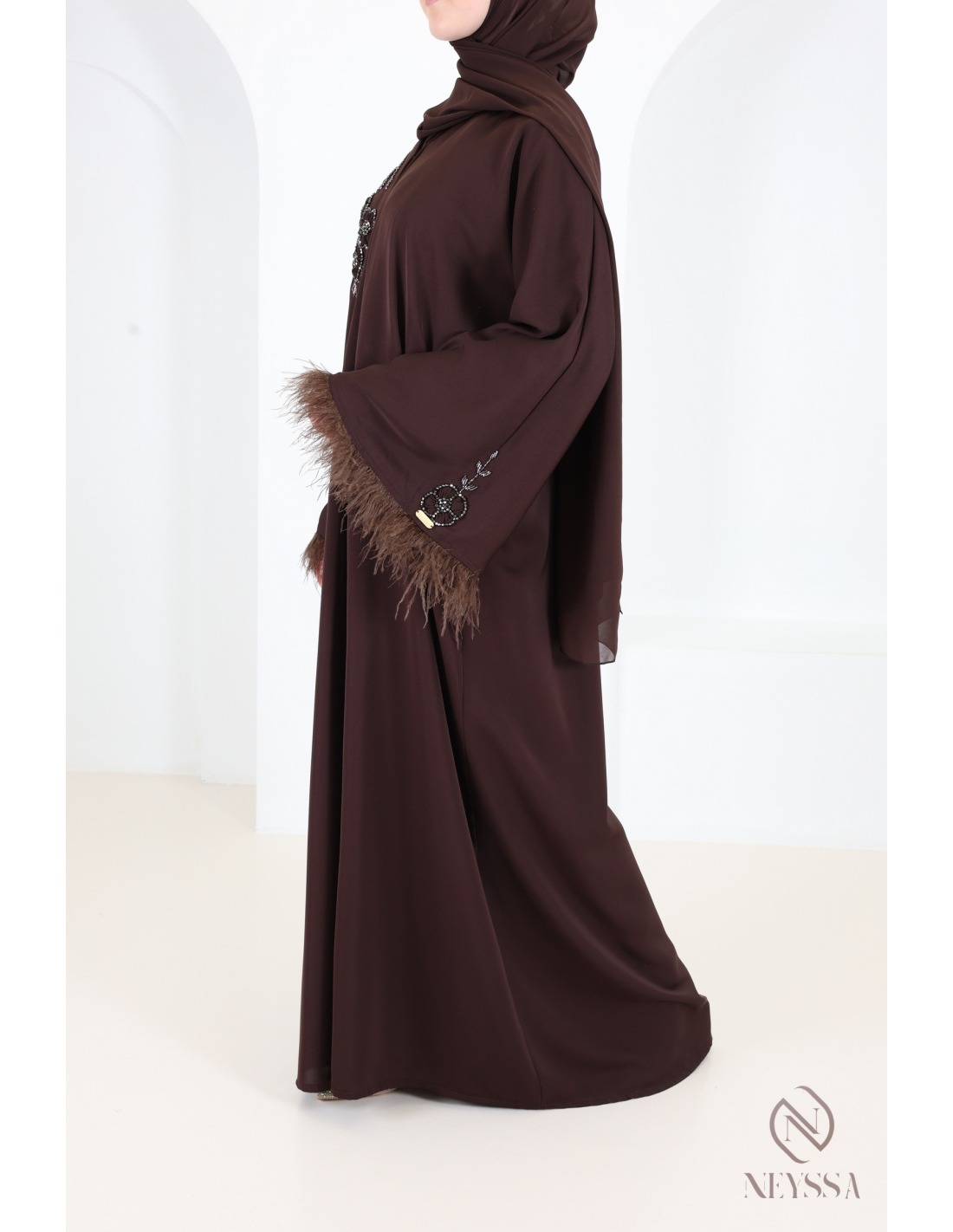 Nous vous proposons ici une abaya femme chocolat à plumes élégante et sophistiquée qui va vous plaire à coup sûr !