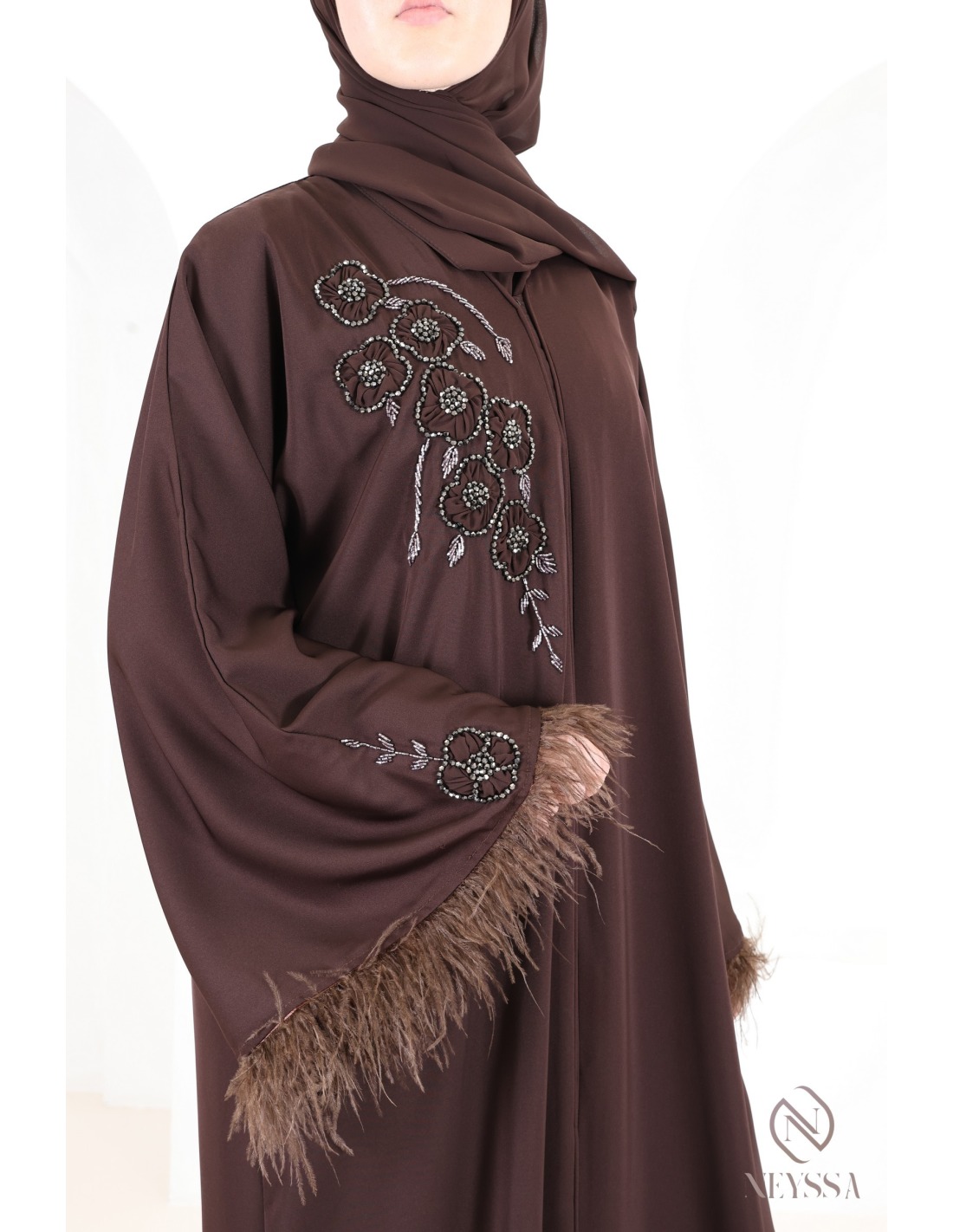 Abaya Dubaï perlée avec plumes Royal Velvet Chocolat