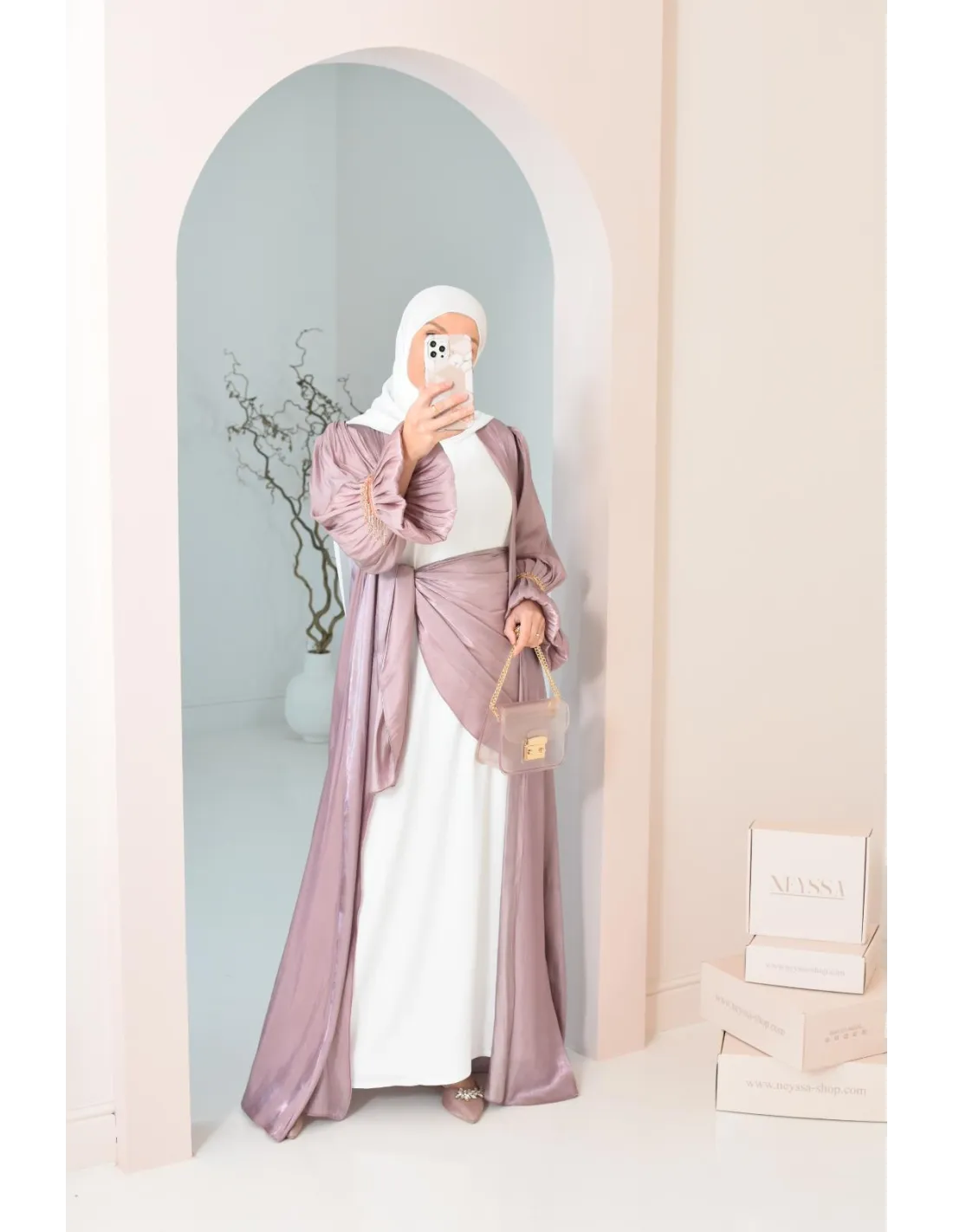 Abaya Dubaï 4 pièces aspect organza satinée brillant Mauve !