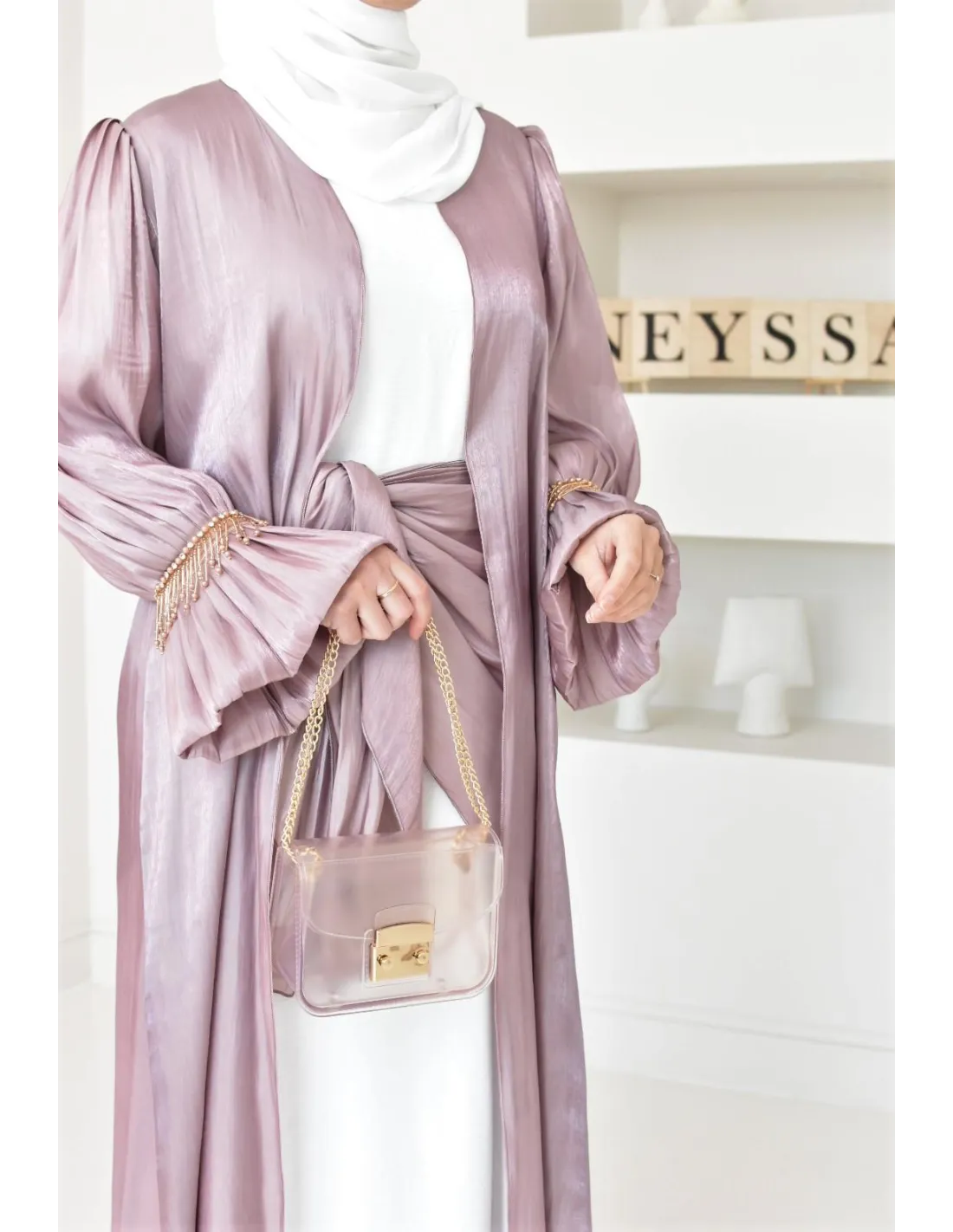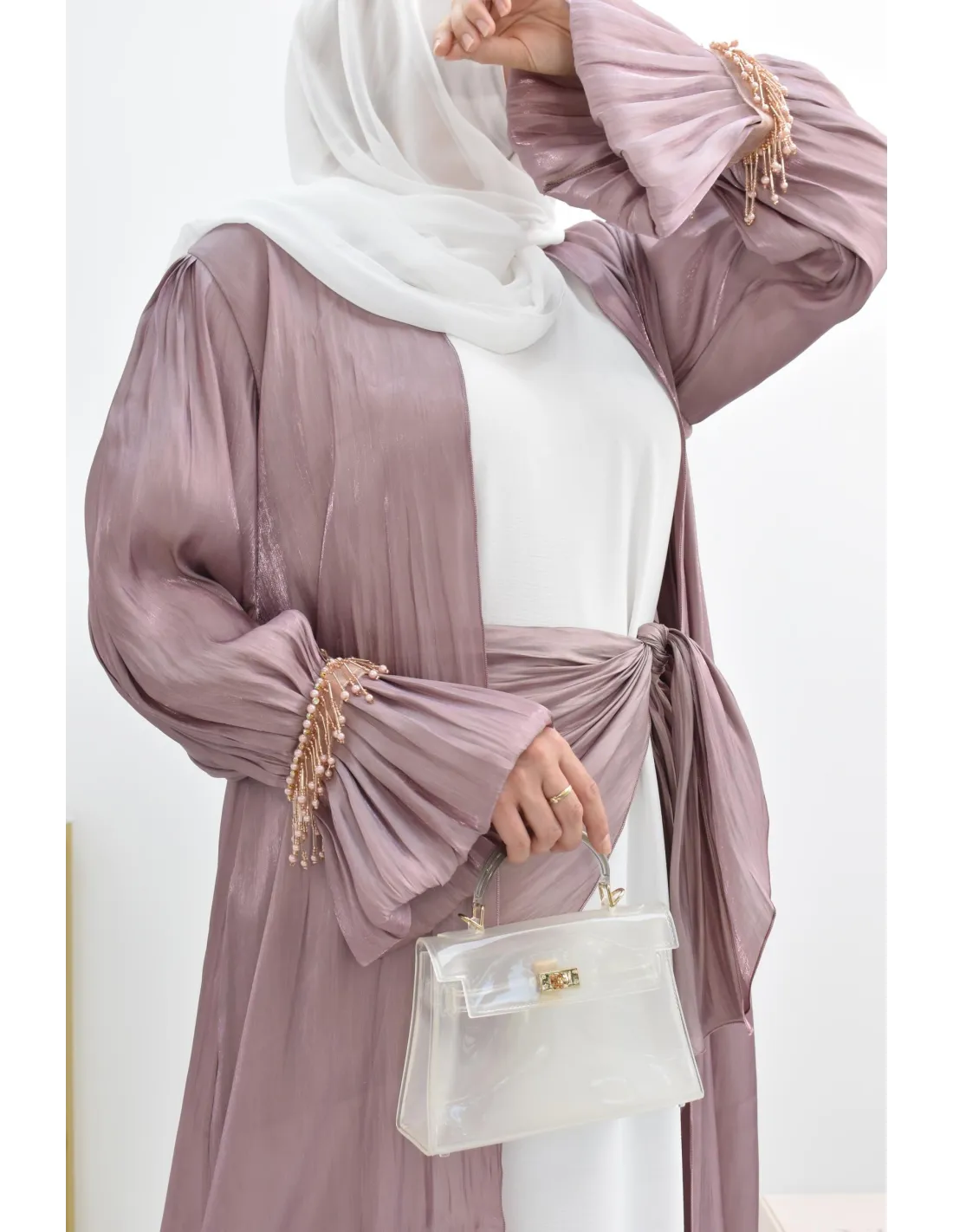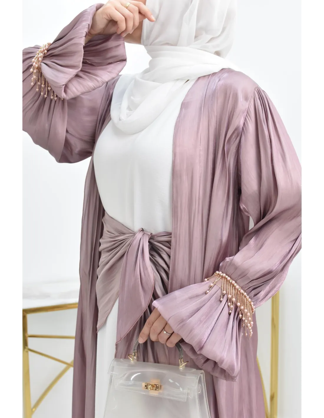 Choisissez pour ce sublime modèle la abaya Dubaï chic. Un ensemble composé de 4 pièces soit d'un kimono long, confectionné dans un tissu style Organza satinée avec manches bouffantes et perles brillantes sur les manches.