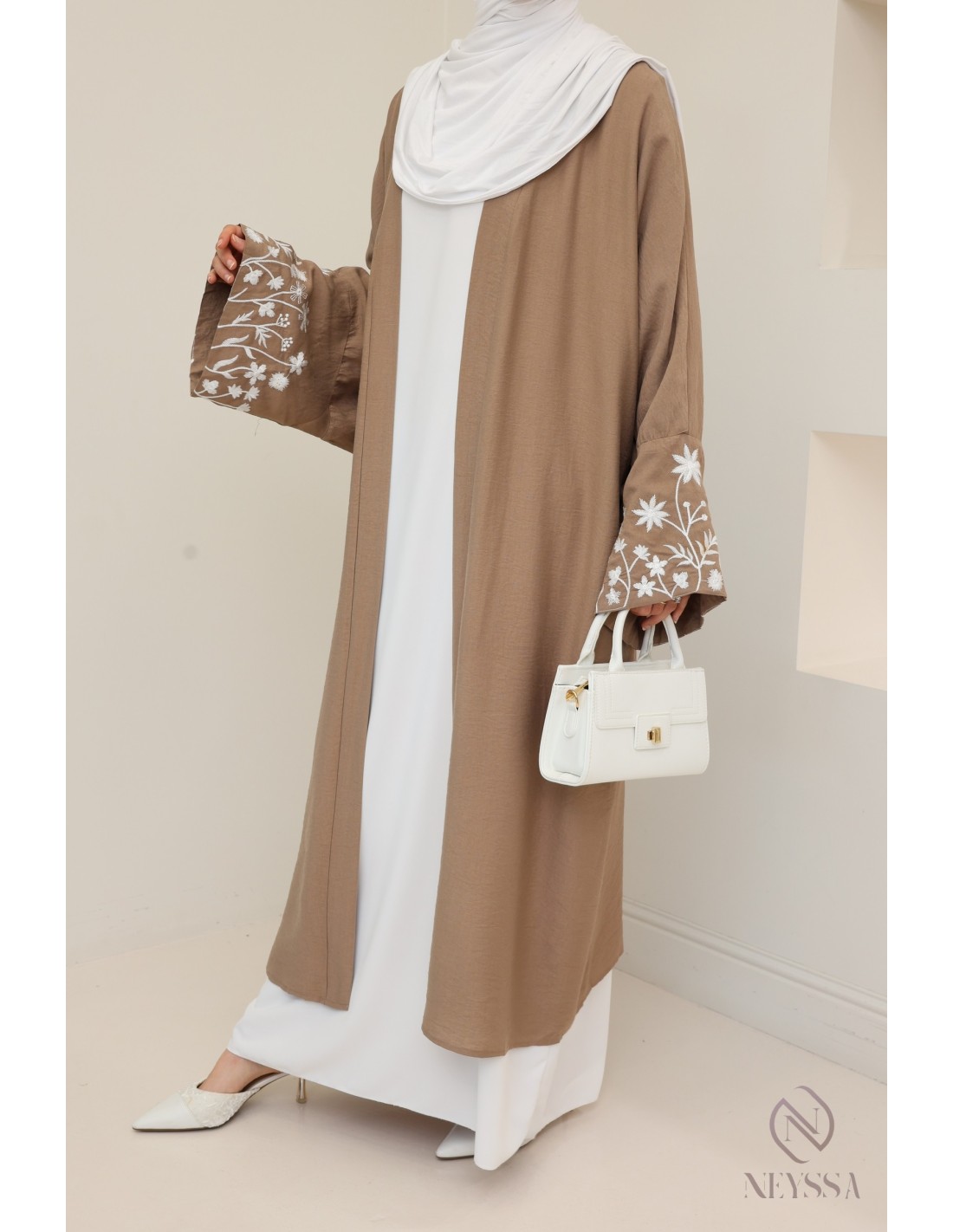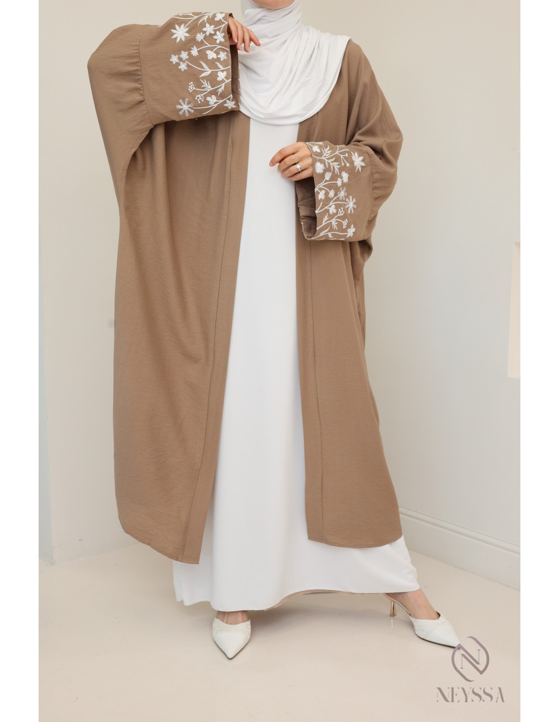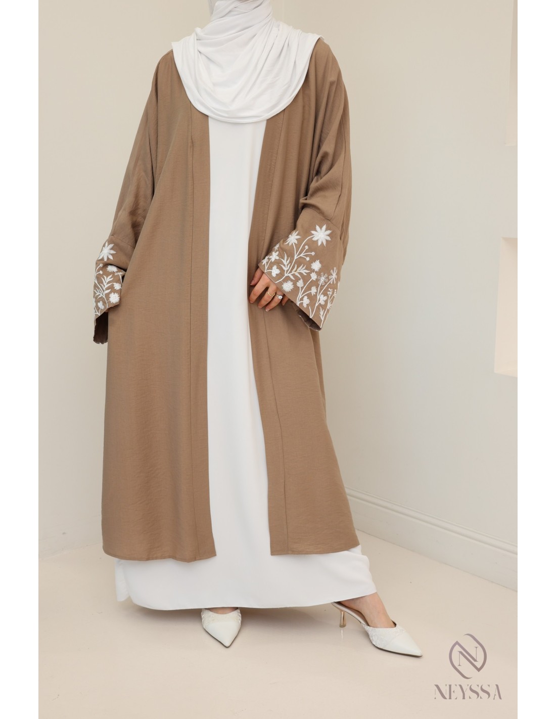 Kimono long brodé effet lin : hijabi look printemps